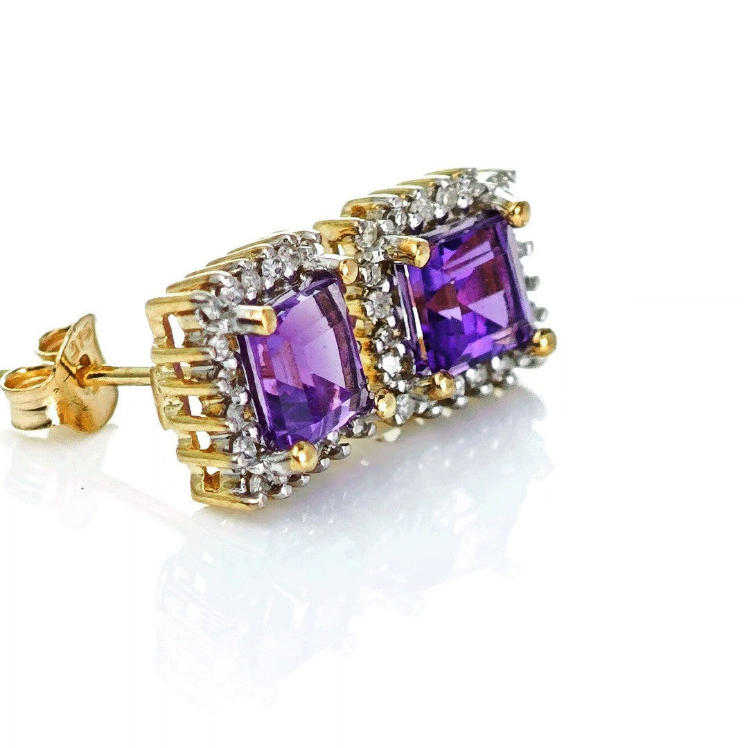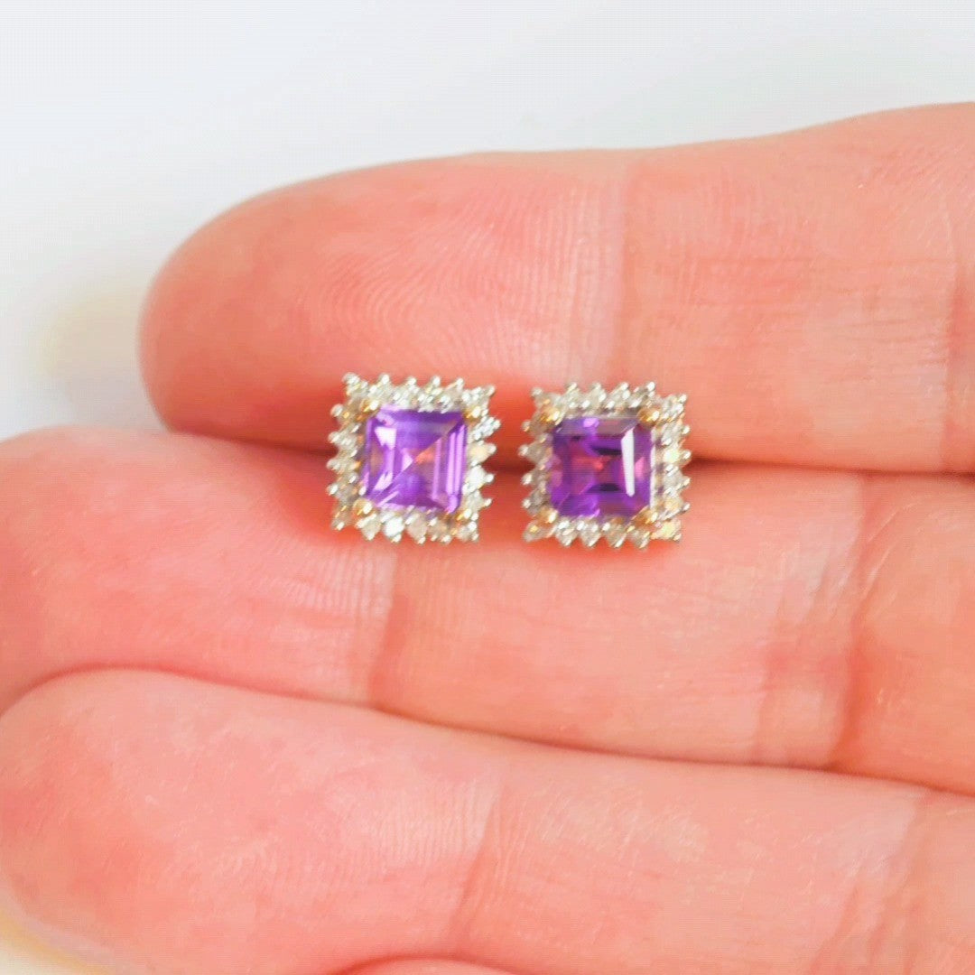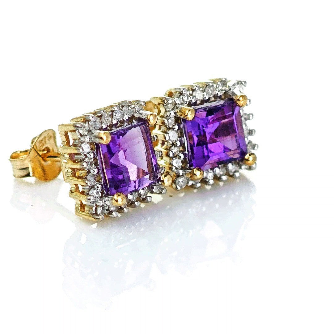 9ct Amethyst Diamond Earrings Gold Studs Natural Gemstones 1.32ct Hallmarked