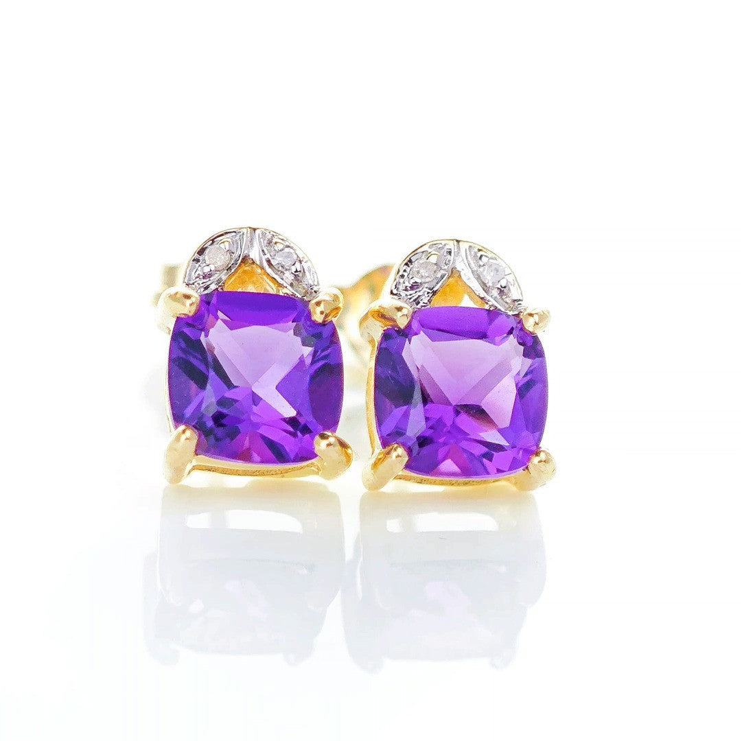 9ct Amethyst Diamond Earrings Gold Studs Natural Purple Cushion Gemstones1.90ct