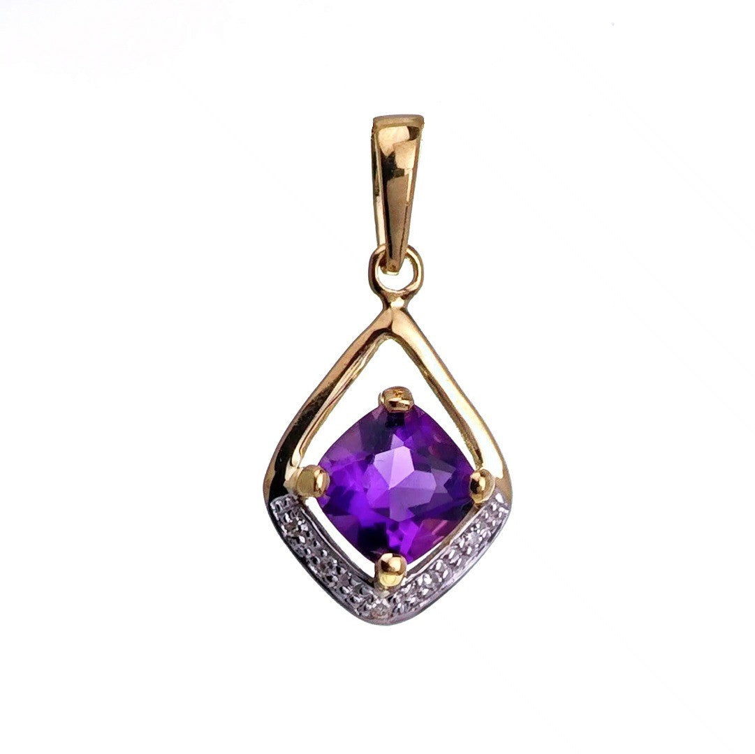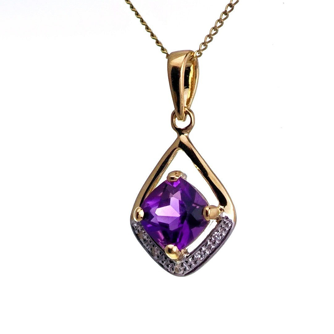 9ct Amethyst Diamond Necklace Yellow Gold 0.87ct Purple cushion Natural Gemstone