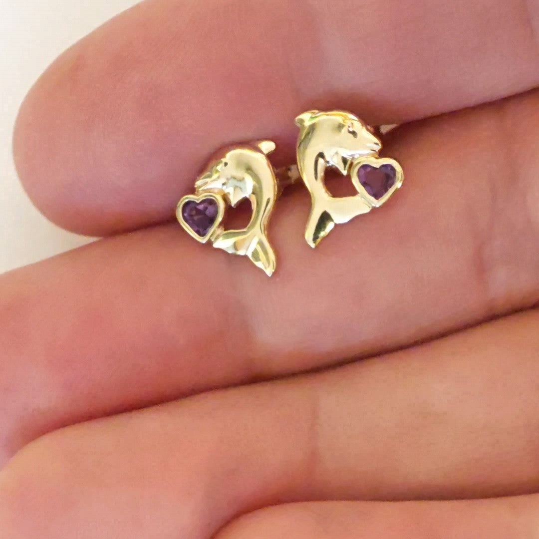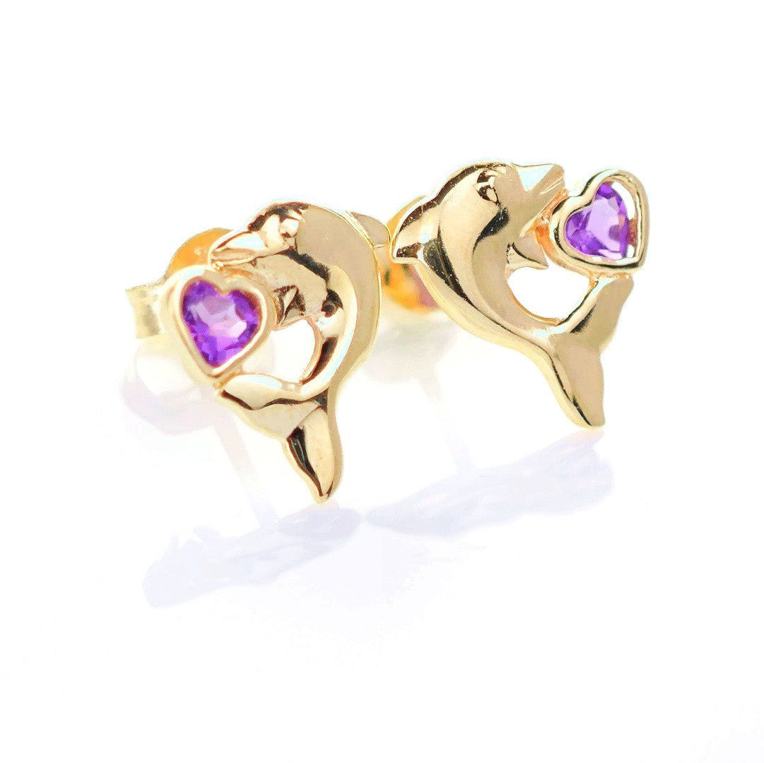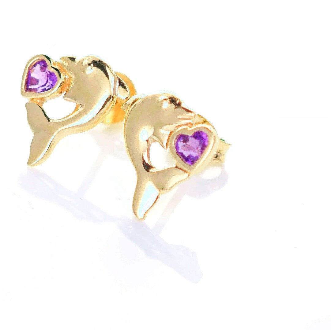 9ct Amethyst Dolphin Earrings Gold Heart Studs Natural Purple Gemstones 0.18ct