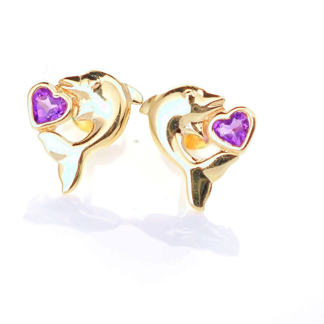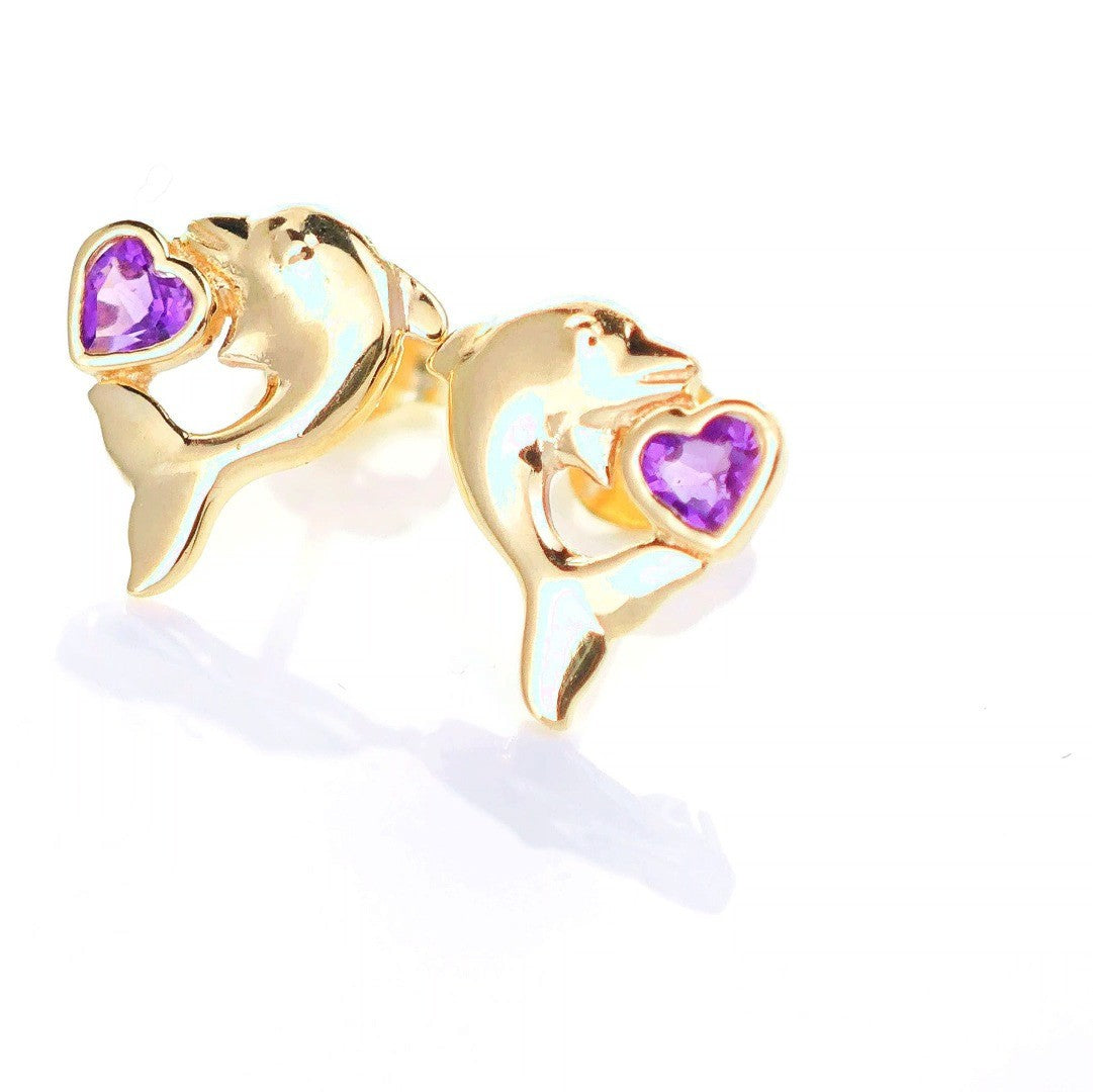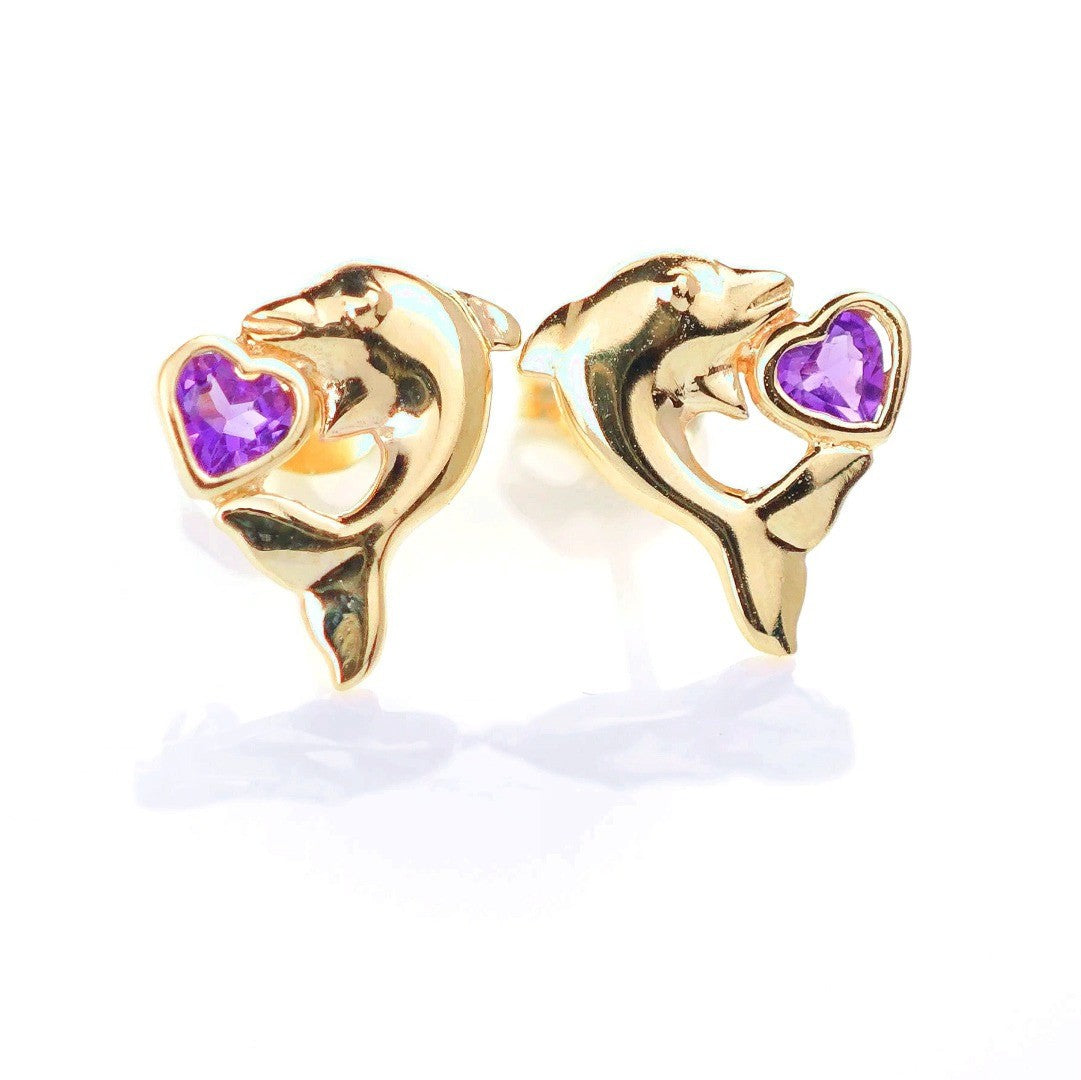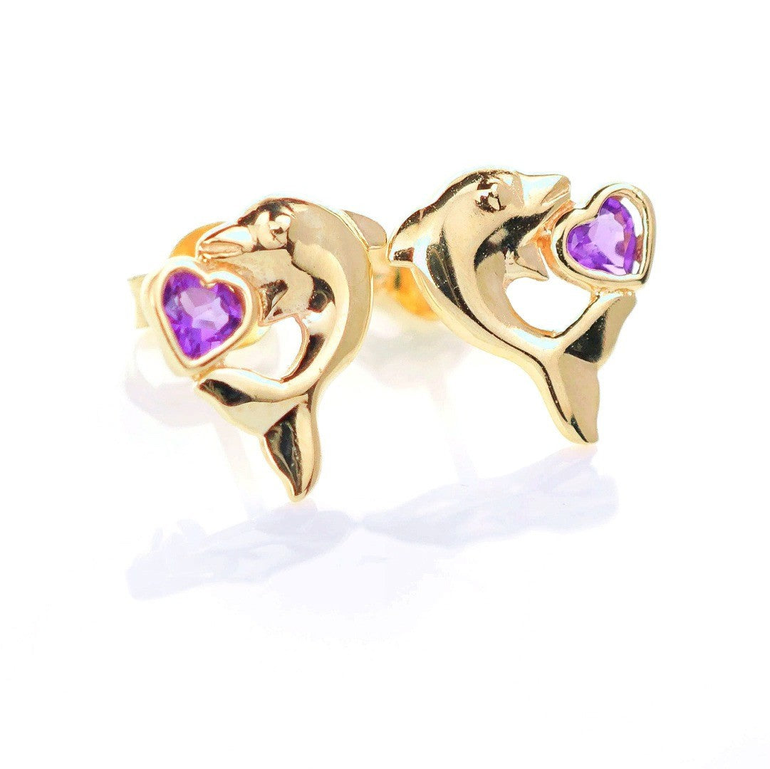 9ct Amethyst Dolphin Earrings Gold Heart Studs Natural Purple Gemstones 0.18ct