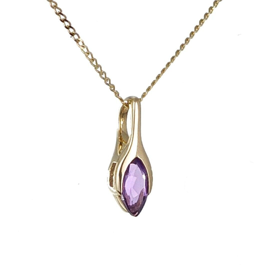 Elegant 9ct gold purple African Amethyst pendant, minimalist solitaire marquise cut sapphire, set in a raised partial rubover setting made of yellow gold to allow light to the back of the stone and show off its natural sparkle. The stone measures 6x3 mm.