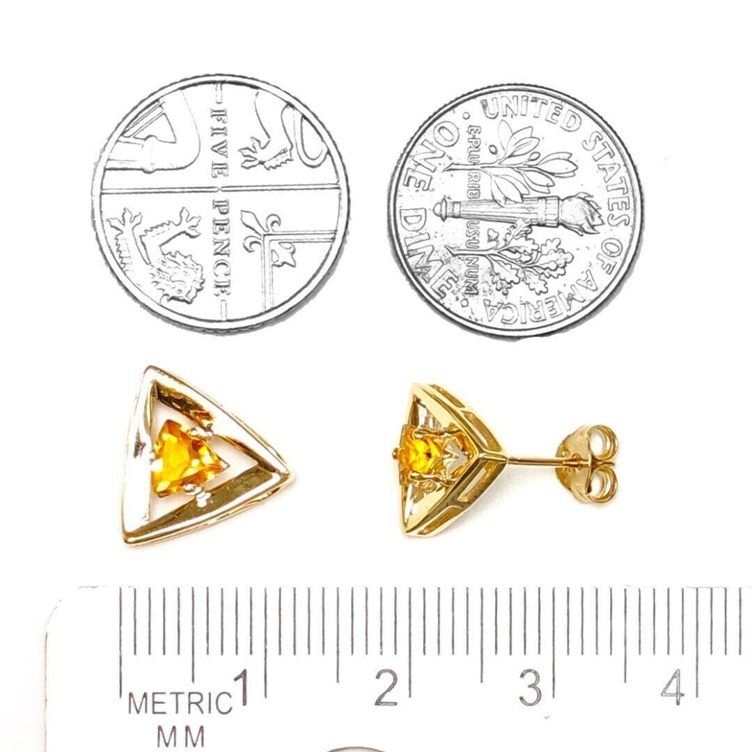 Trillion cut yellow citrine set in a raised triangle made of solid yellow gold. The design lifts the stone to allow light to filter to its back and show the stone of with an elegant sparkle. The natural yellow citrine is from Africa. The stone measures 5 x 5mm