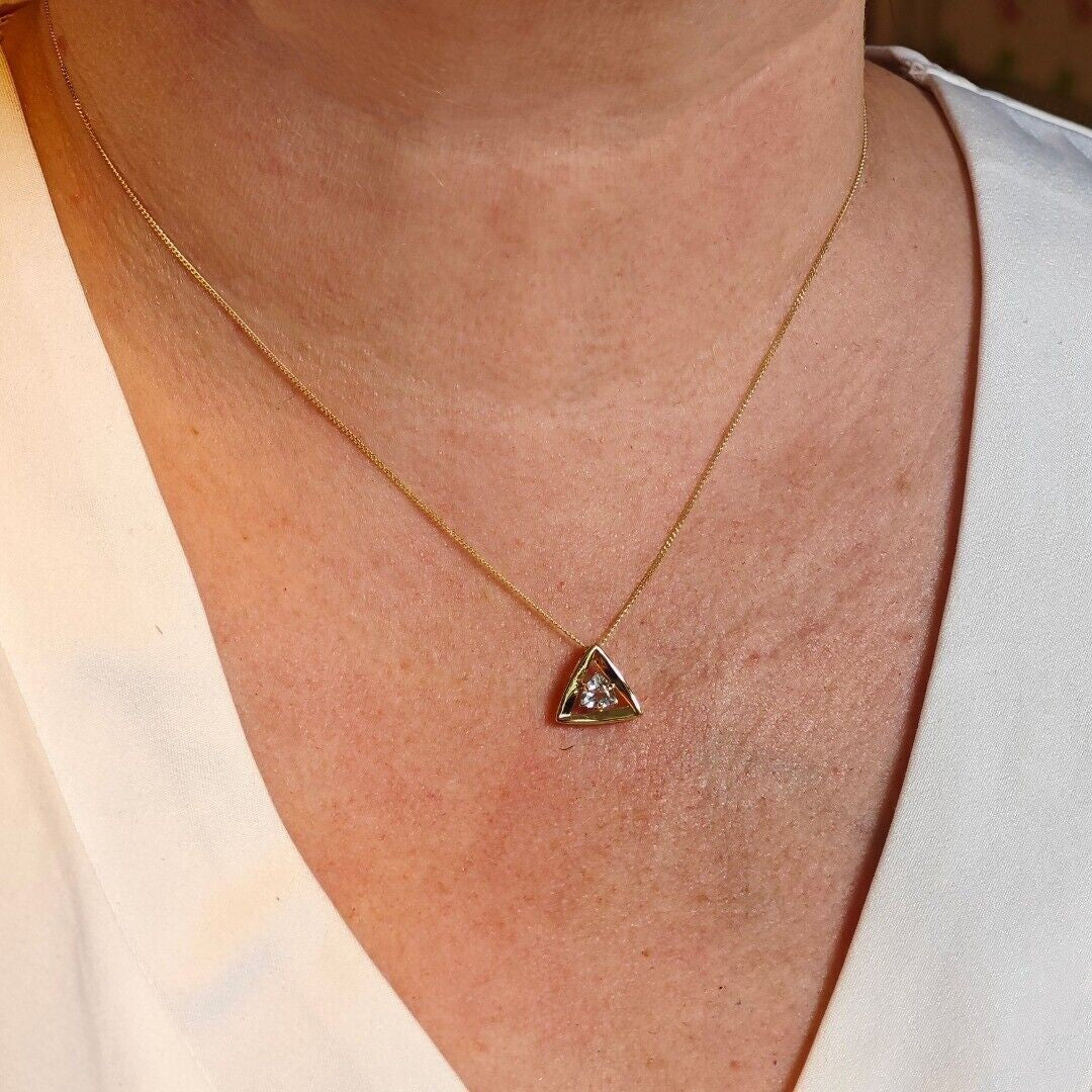 Add a touch of elegance to your jewellery collection with this stunning 9ct Gold Aquamarine Necklace. The triangular-shaped pendant features a natural blue aquamarine gemstone with a total carat weight of 0.36. The prong setting style enhances the beauty of the gemstone, making it the perfect accessory for any occasion. The necklace is 46 cm in length and is made of high-quality yellow gold, making it a durable addition to your collection. Handmade and beautifully boxed, this necklace is a must-have for any jewellery lover.