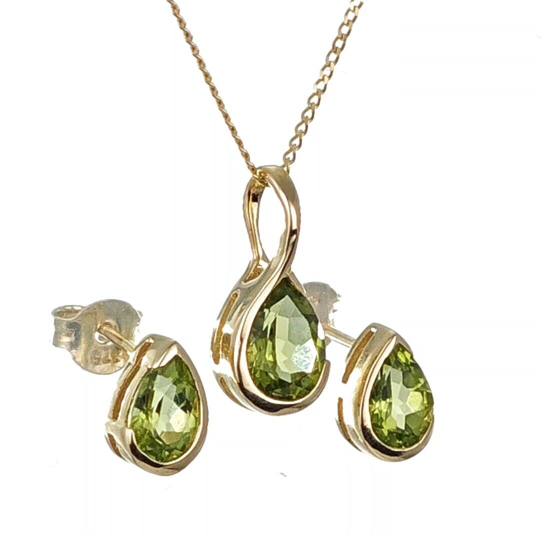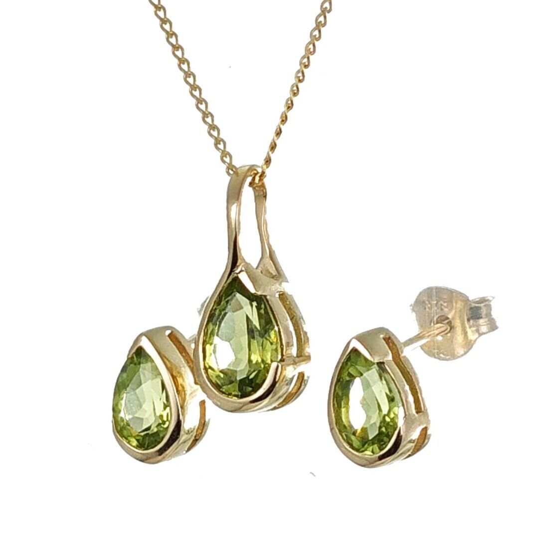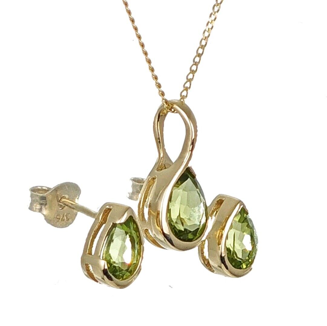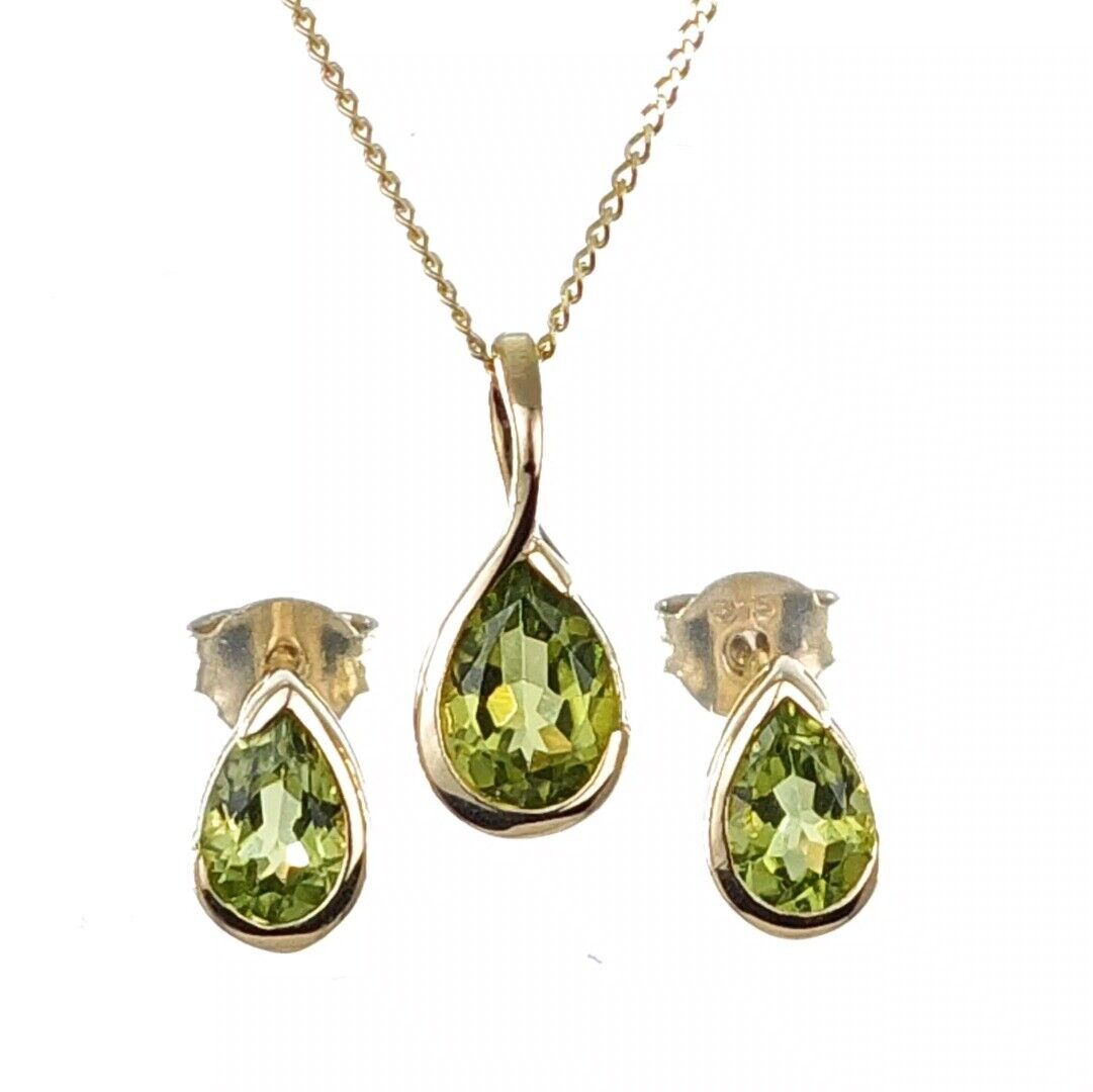 9ct Gold Peridot Set Earrings Pendant Green Pear Solitaire