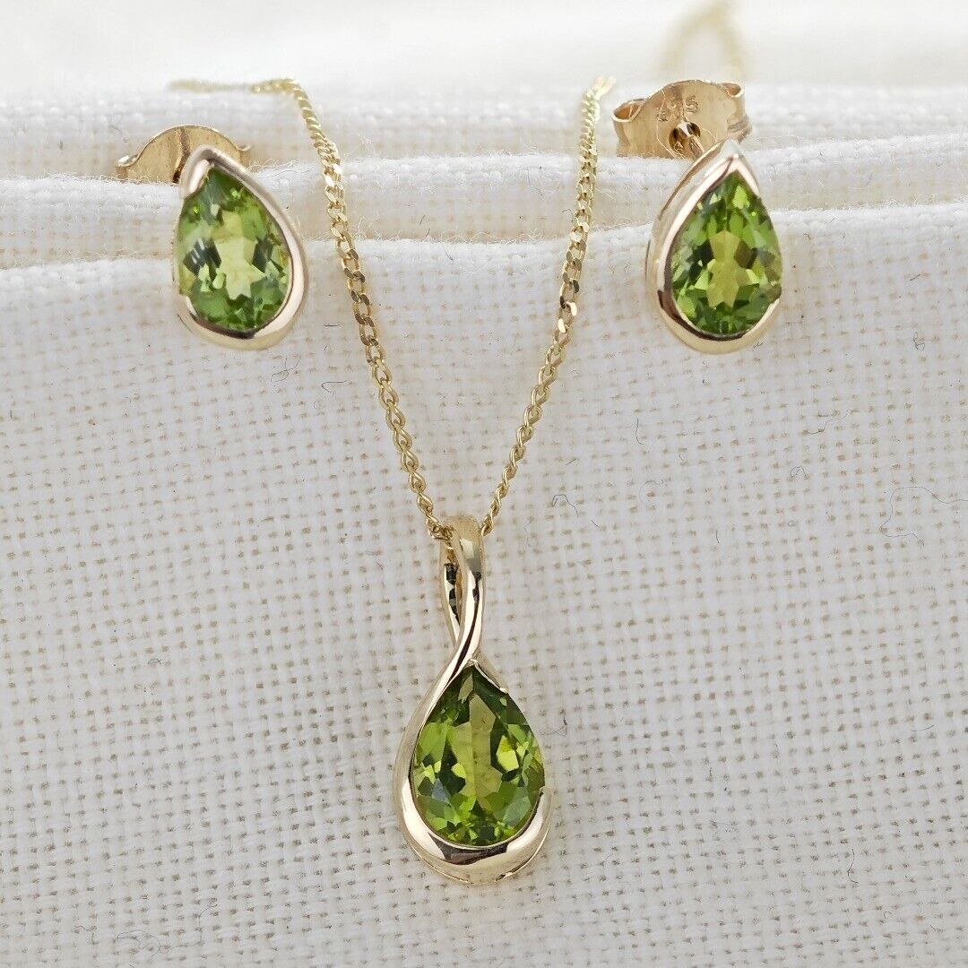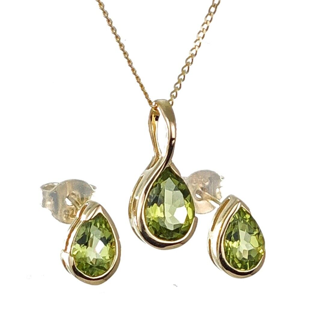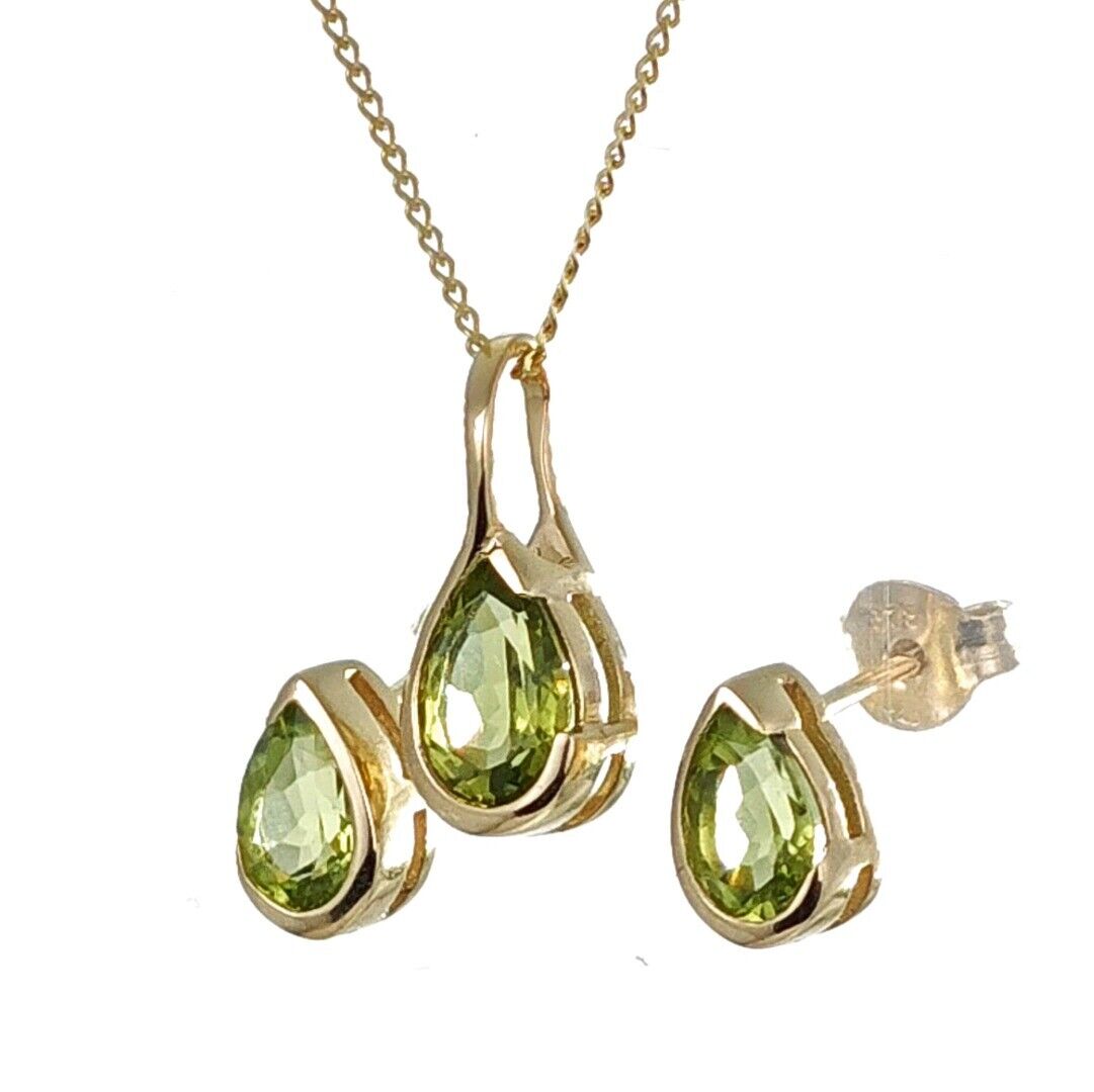 9ct Gold Peridot Set Earrings Pendant Green Pear Solitaire
