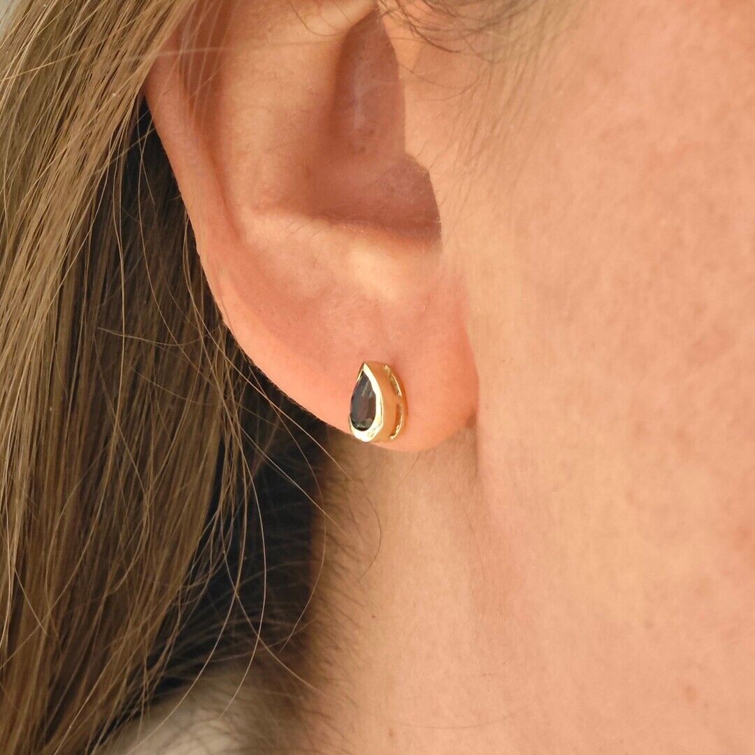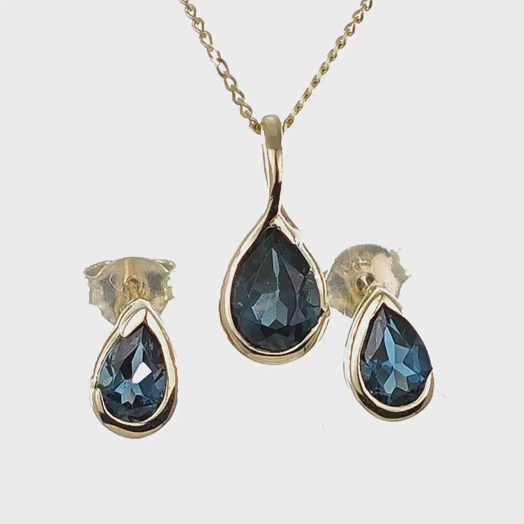 Elegant 9ct Gold solitaire pear African London Blue Topaz pendant and matching earrings. Ojewellery design and part of our first full gold collection. Produced in very small quantities you will only find this pendant from Ojewellery direct.
