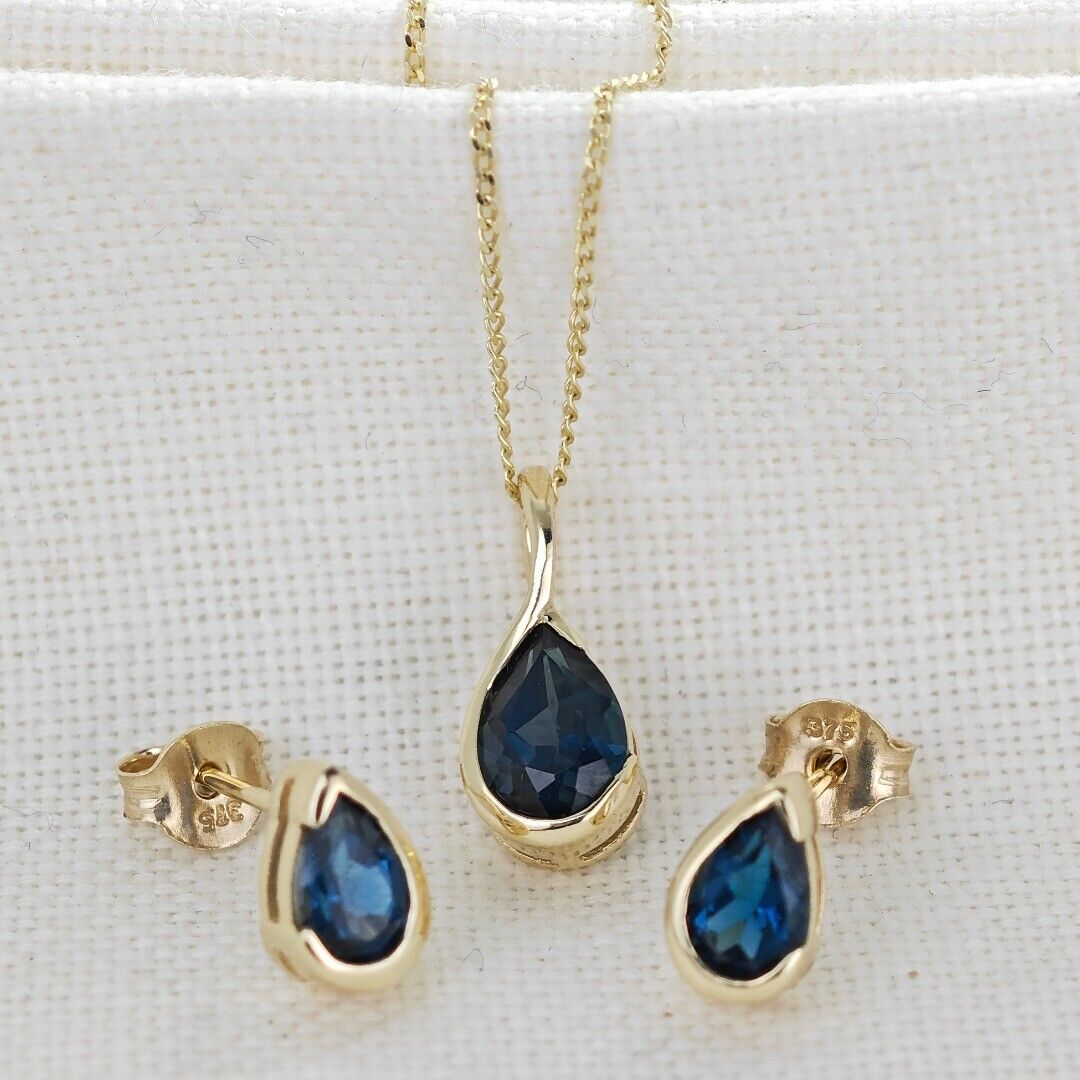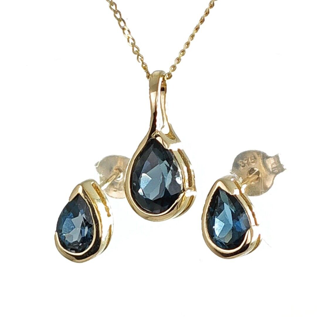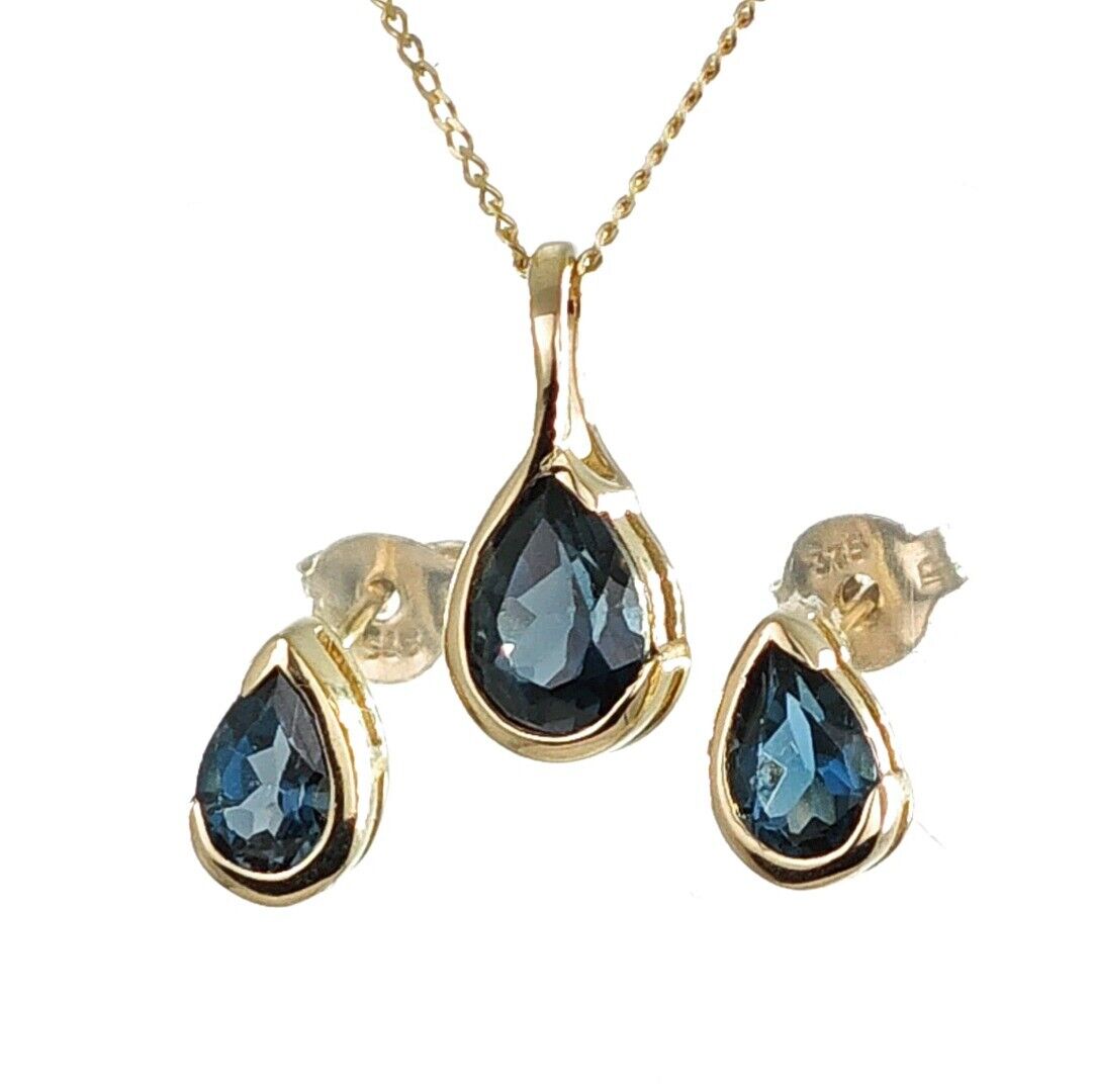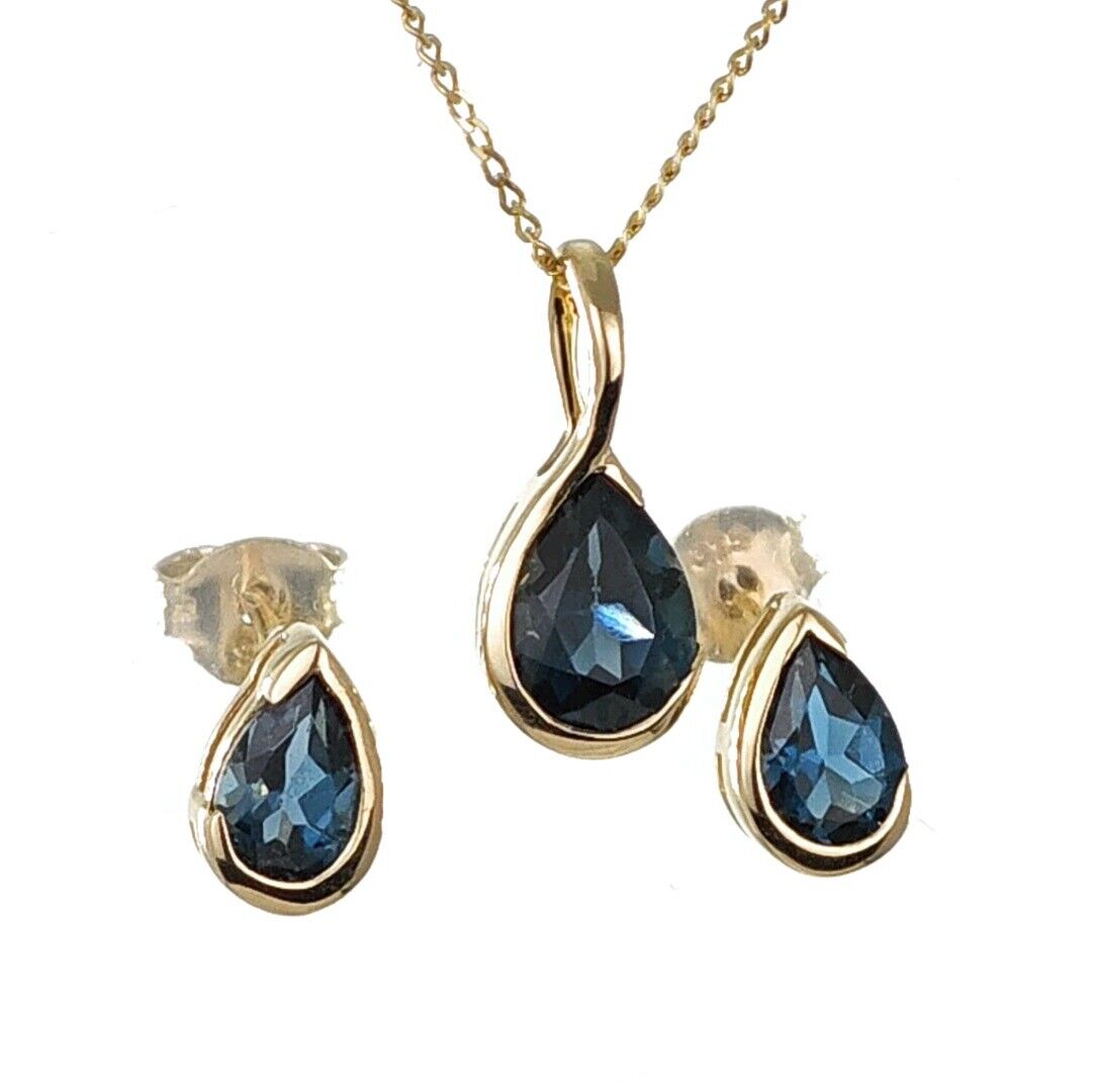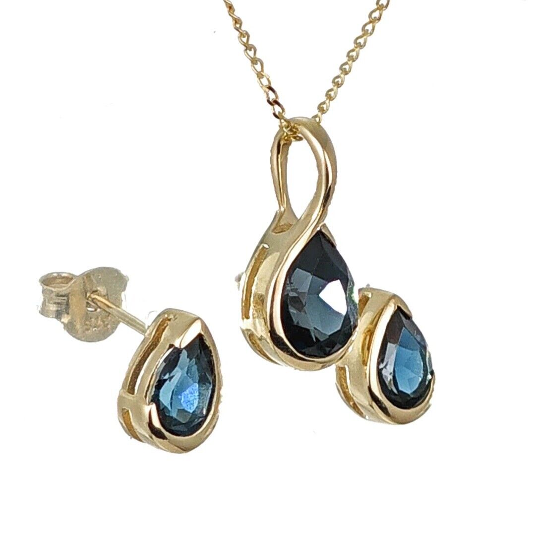 9ct Gold Set Necklace Earrings London Blue Treated Topaz Handmade