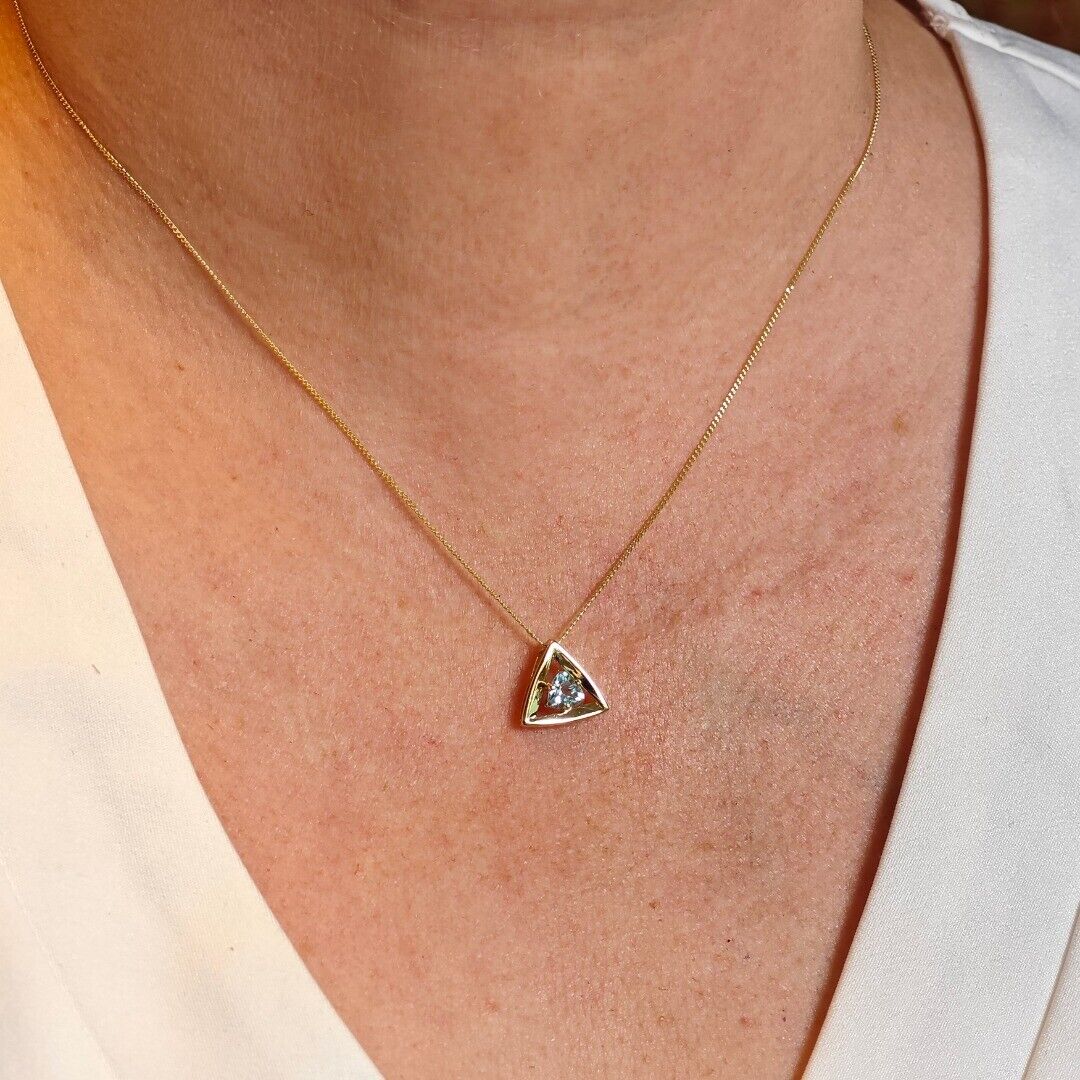 Elegant African pale blue topaz pendant and matching earrings. Trillion cut topaz set in a triangle made of 9ct yellow gold. The natural The pale blue topaz are from Africa. The stone in the pendant measures 5 x 5mm and in each earring 4 x 4mm