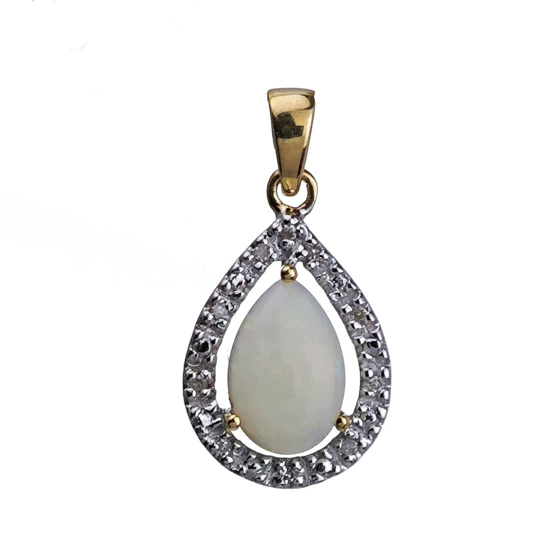9ct Opal Diamond Necklace Yellow Gold 0.65ct White Pear Natural Gemstone