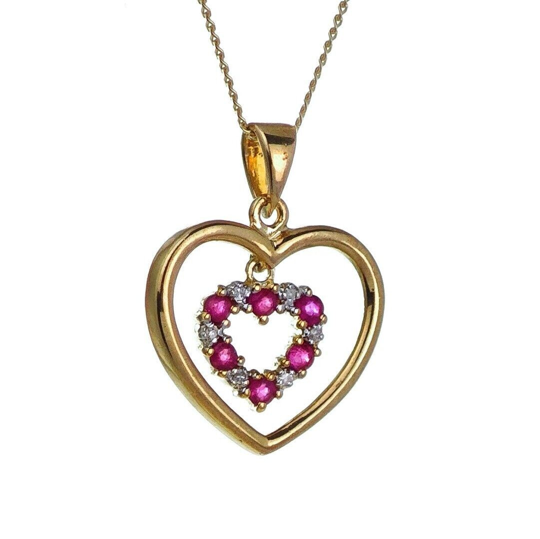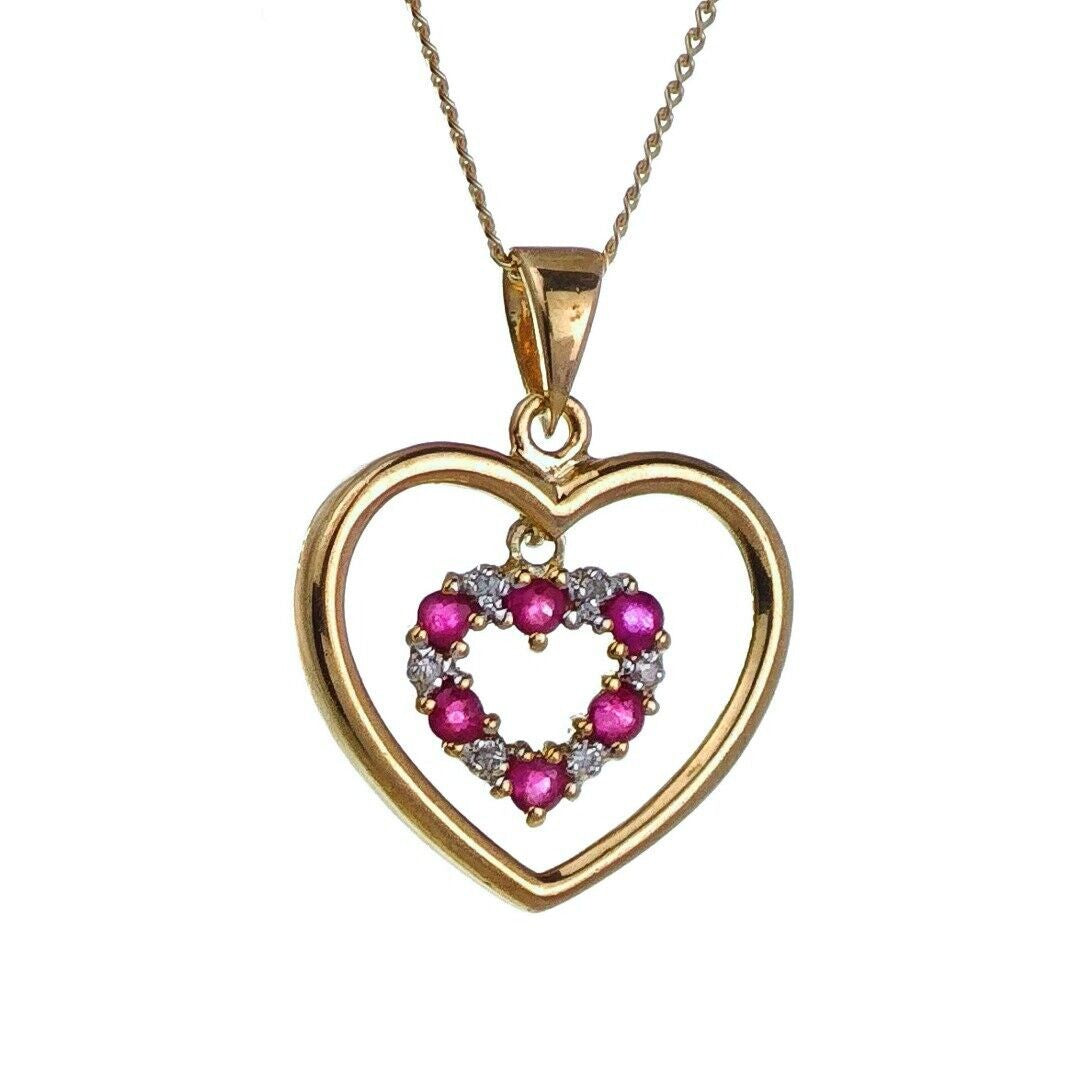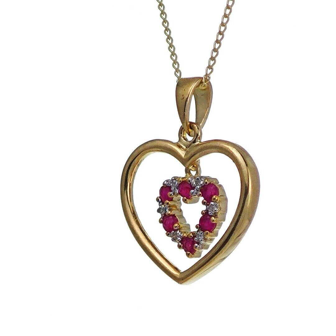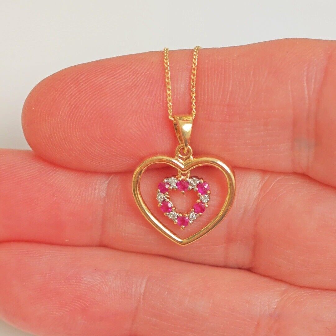 9ct Ruby Diamond Heart Necklace Yellow Gold 0.18ct Red Round. Natural Gemstone