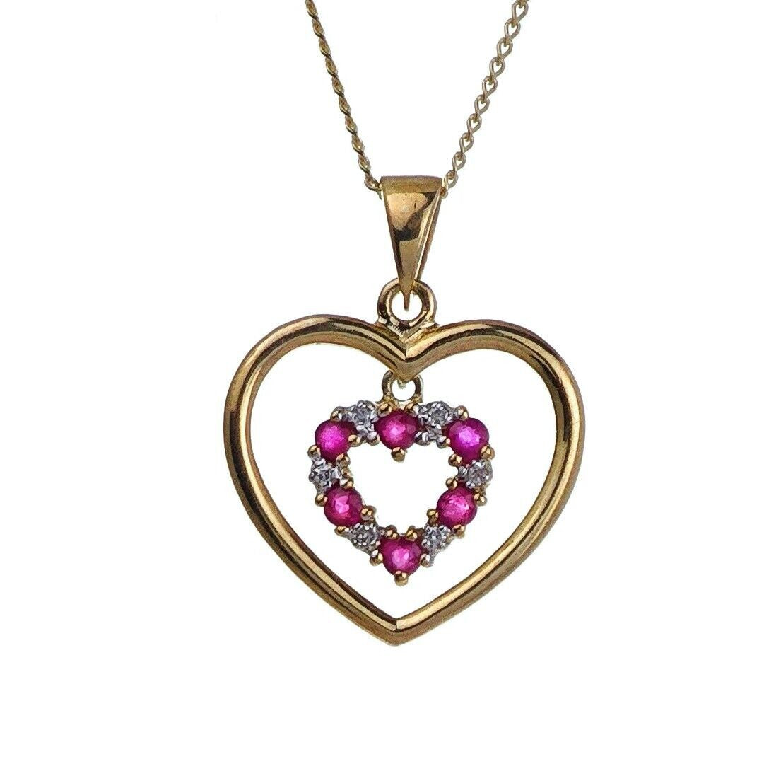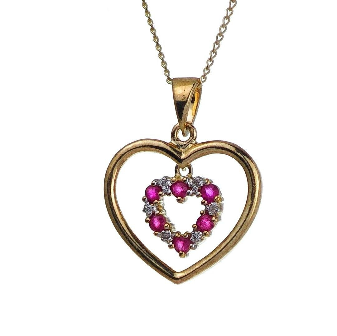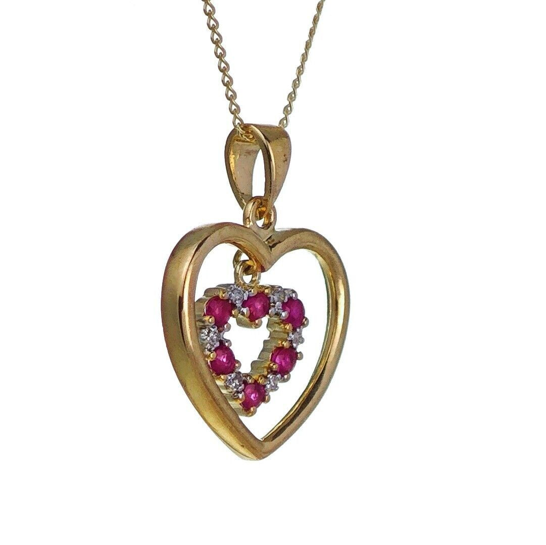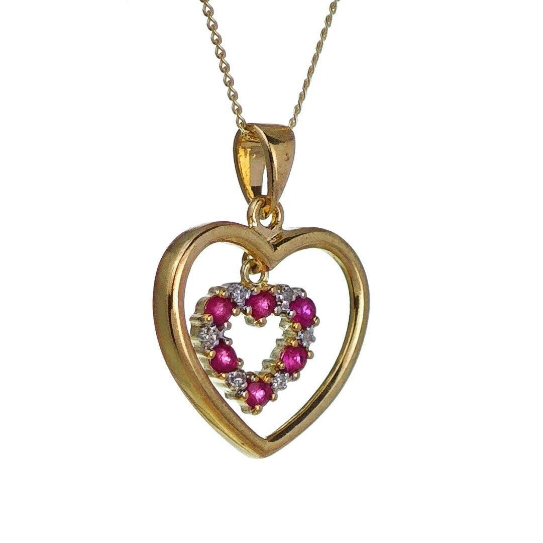 9ct Ruby Diamond Heart Necklace Yellow Gold 0.18ct Red Round. Natural Gemstone