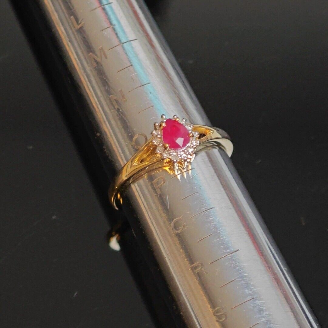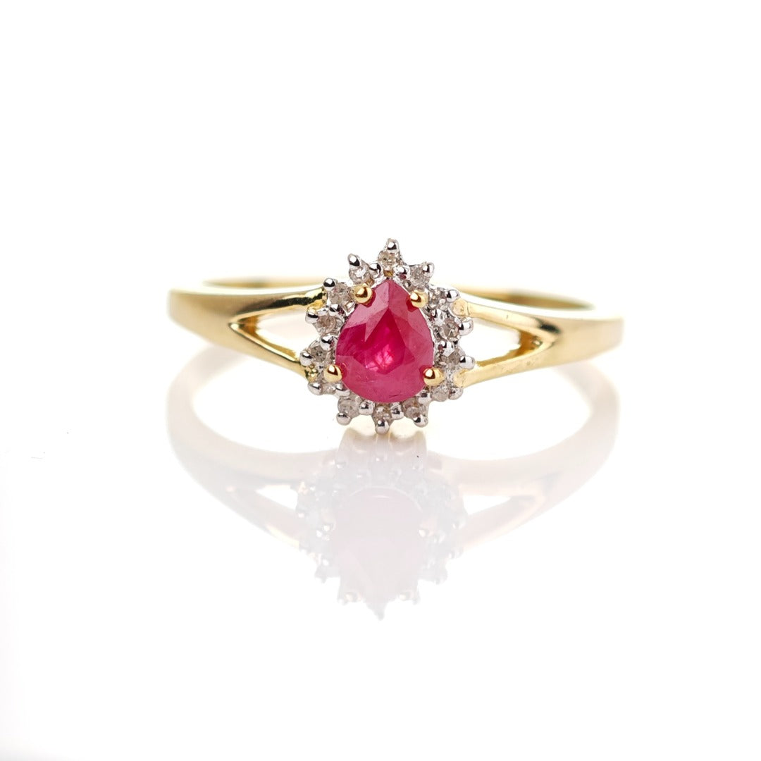 9ct Ruby Ring Size O.5 Diamond Yellow Gold 0.42ct Red Pear Gemstone