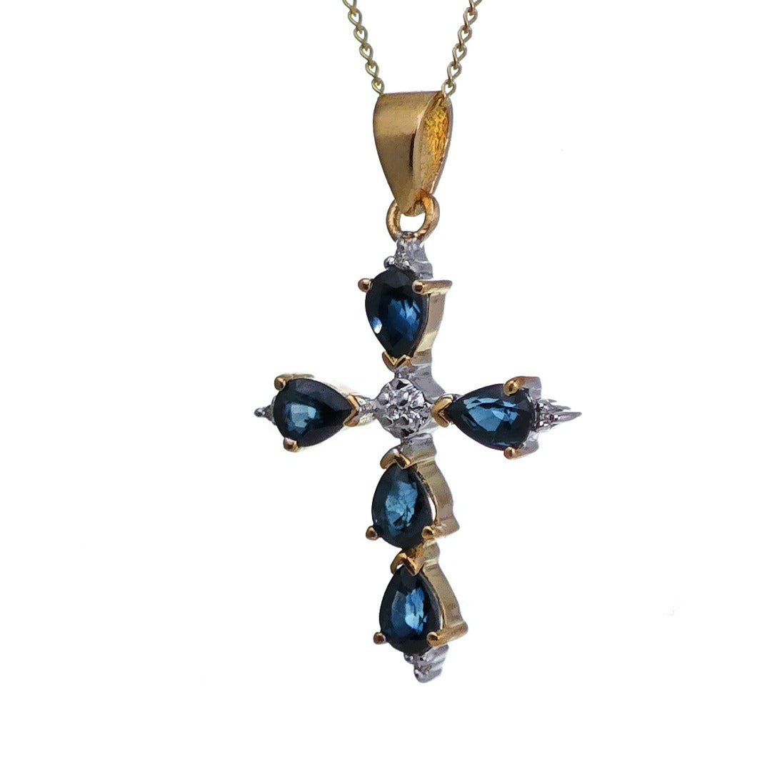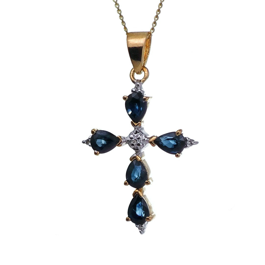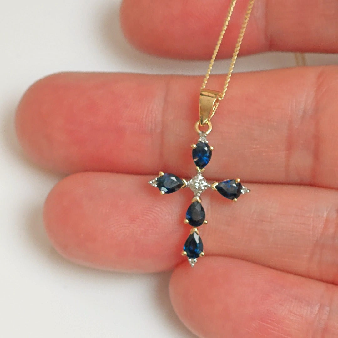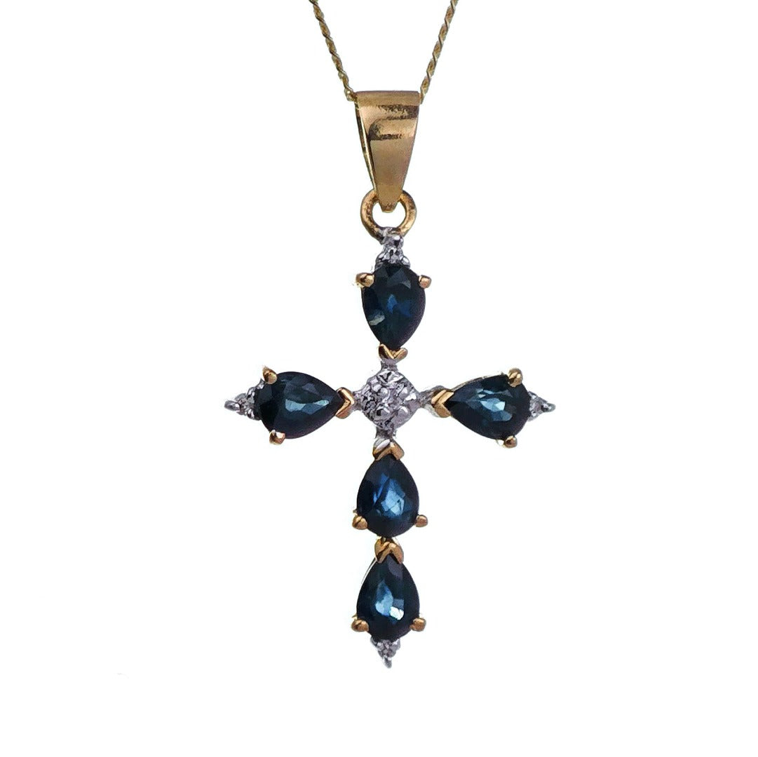 9ct Sapphire Cross Necklace Diamond Yellow Gold 1.15ct Blue Pear Natural Gemstone