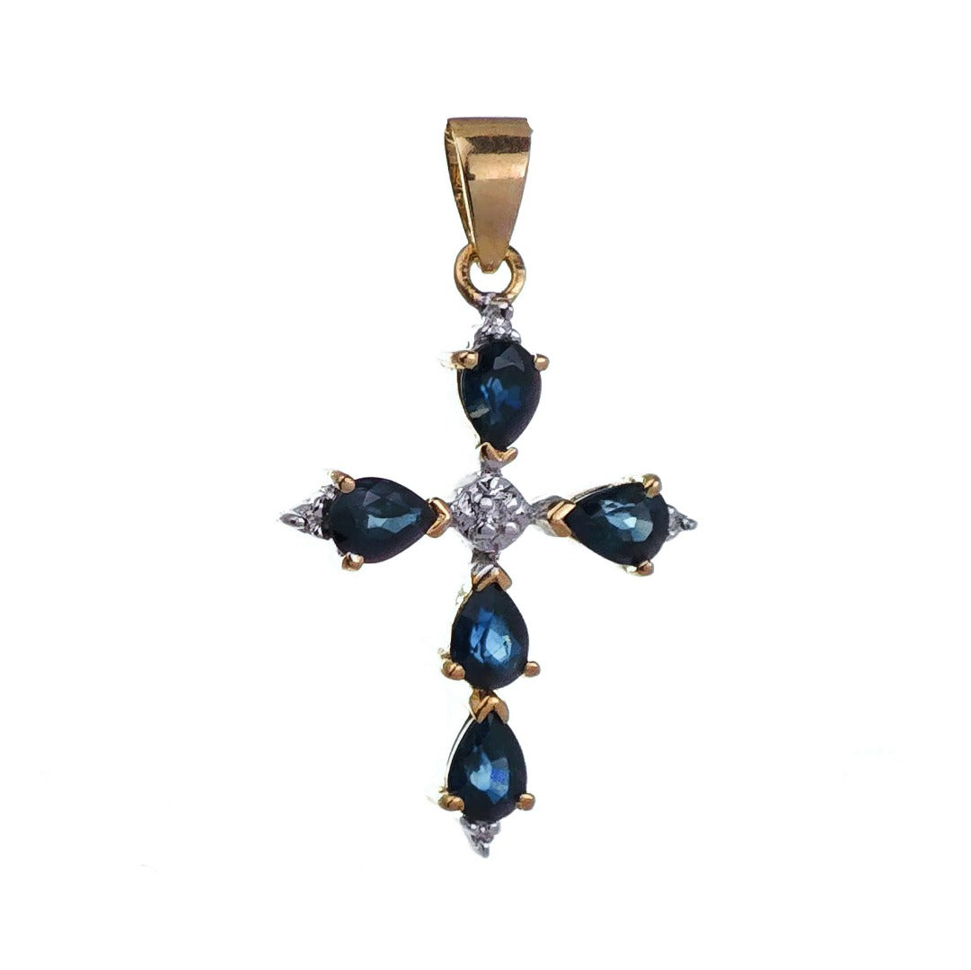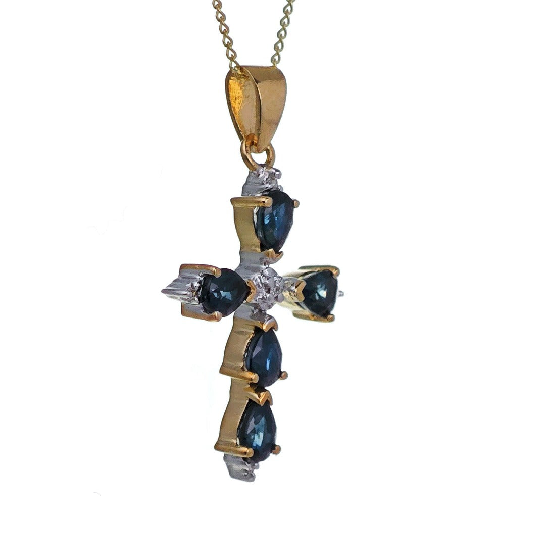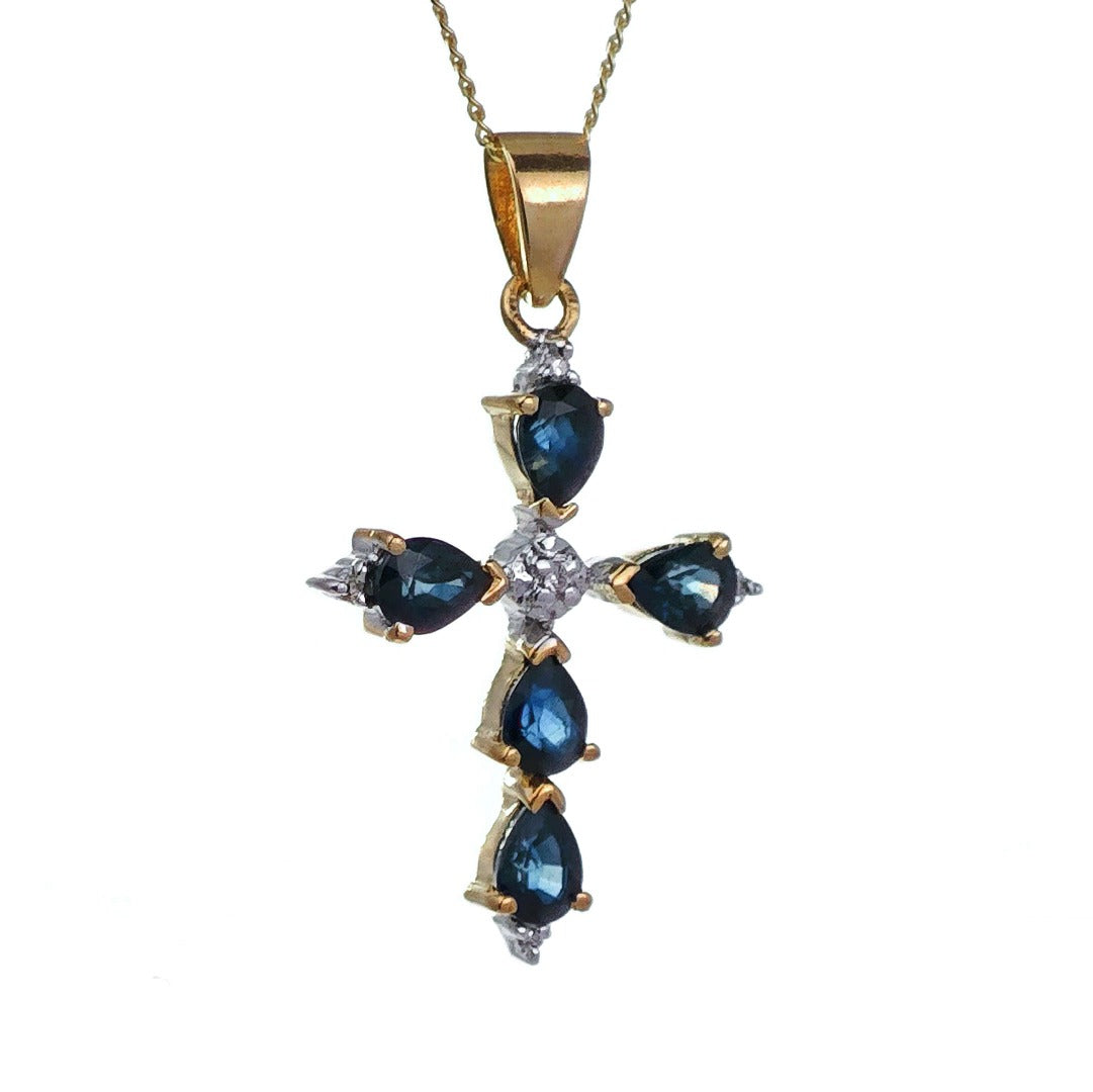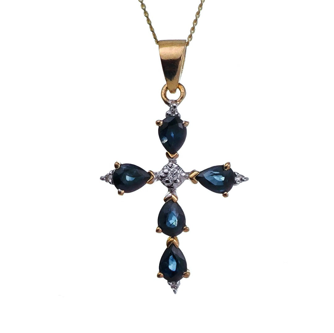 9ct Sapphire Cross Necklace Diamond Yellow Gold 1.15ct Blue Pear Natural Gemstone