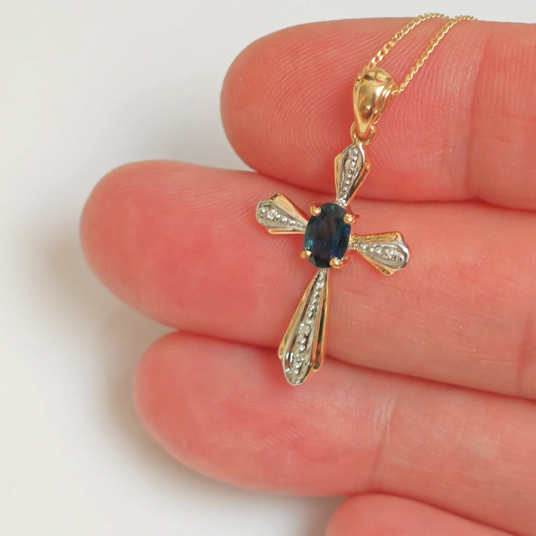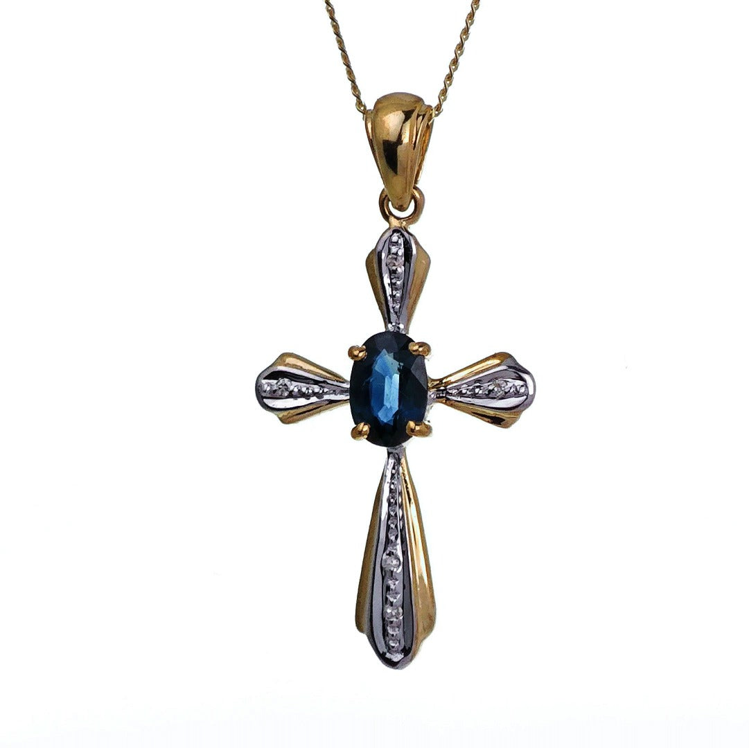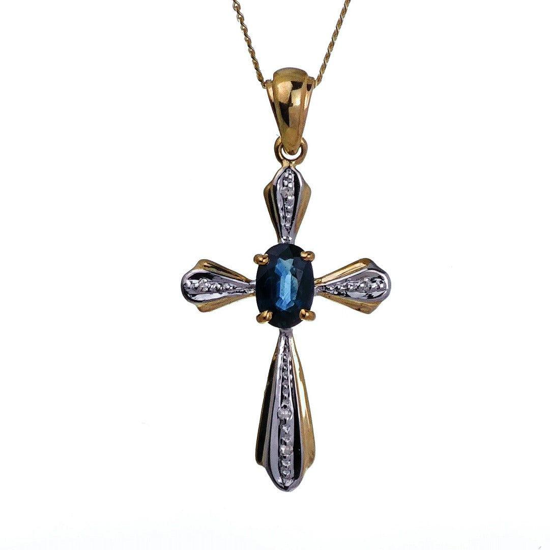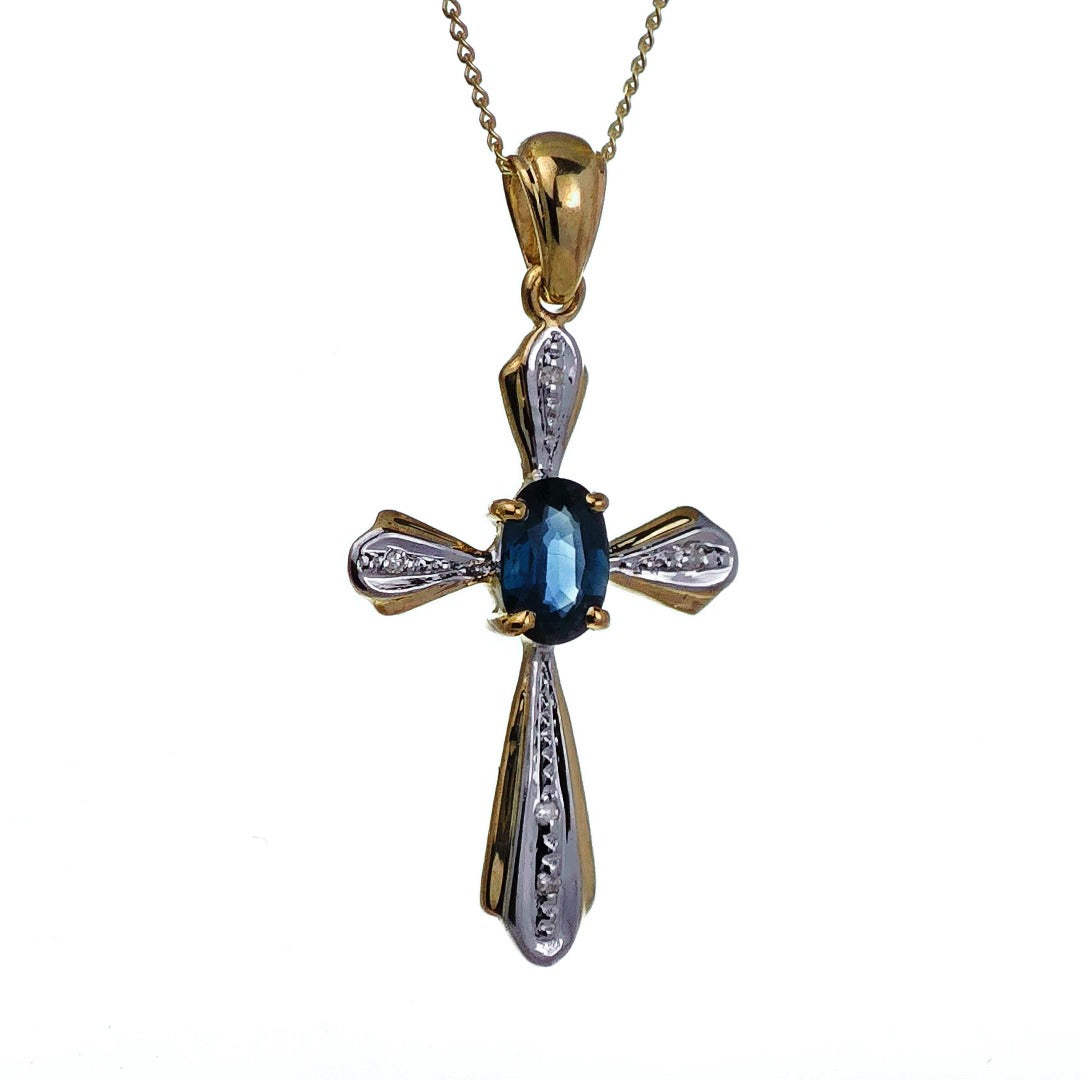 9ct Sapphire Cross Necklace Diamonds Yellow Gold 0.43ct Blue Natural Gemstone