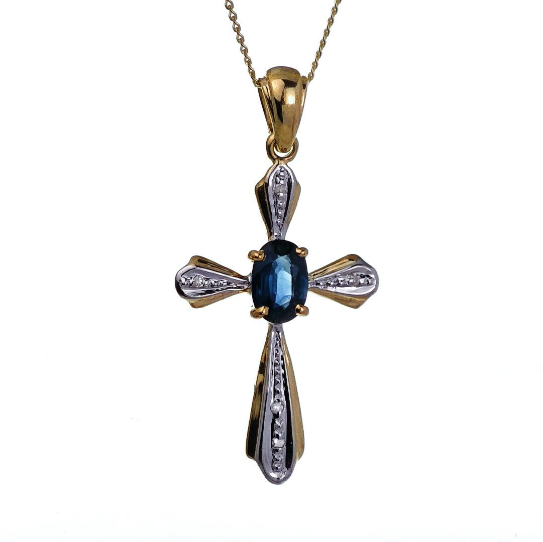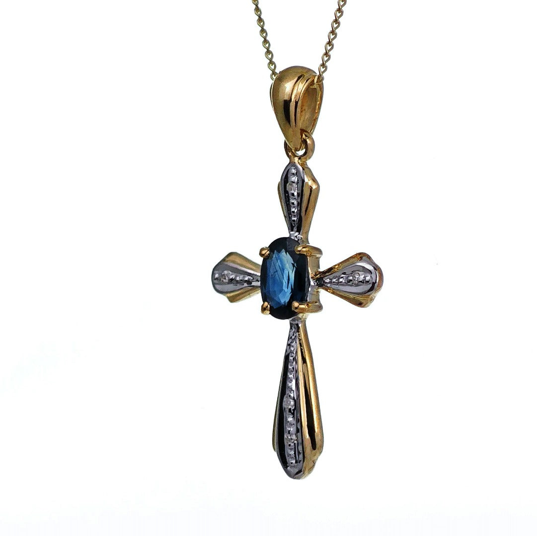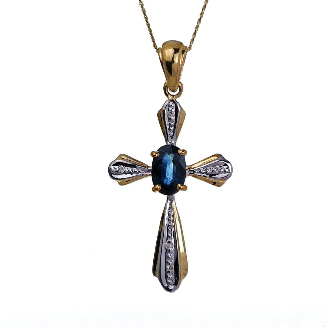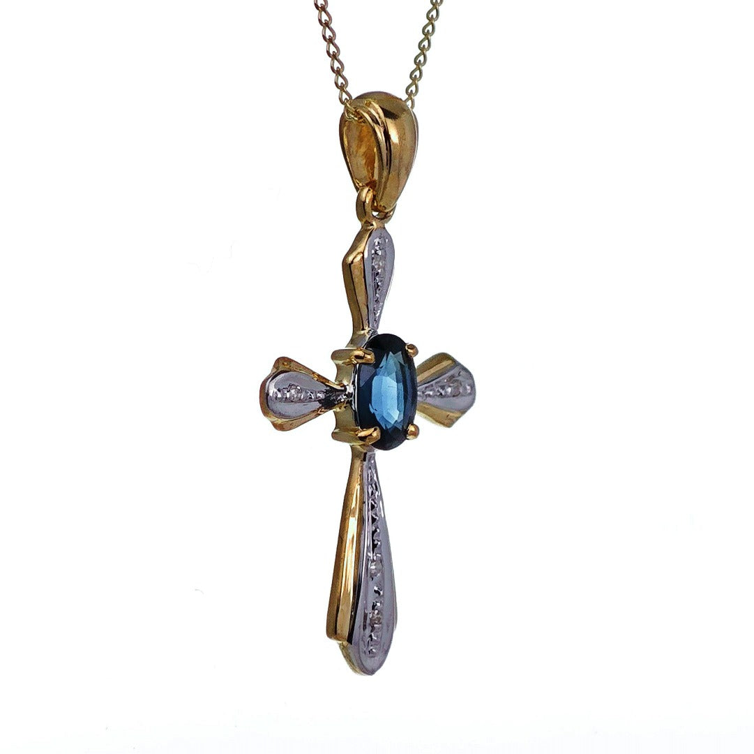9ct Sapphire Cross Necklace Diamonds Yellow Gold 0.43ct Blue Natural Gemstone
