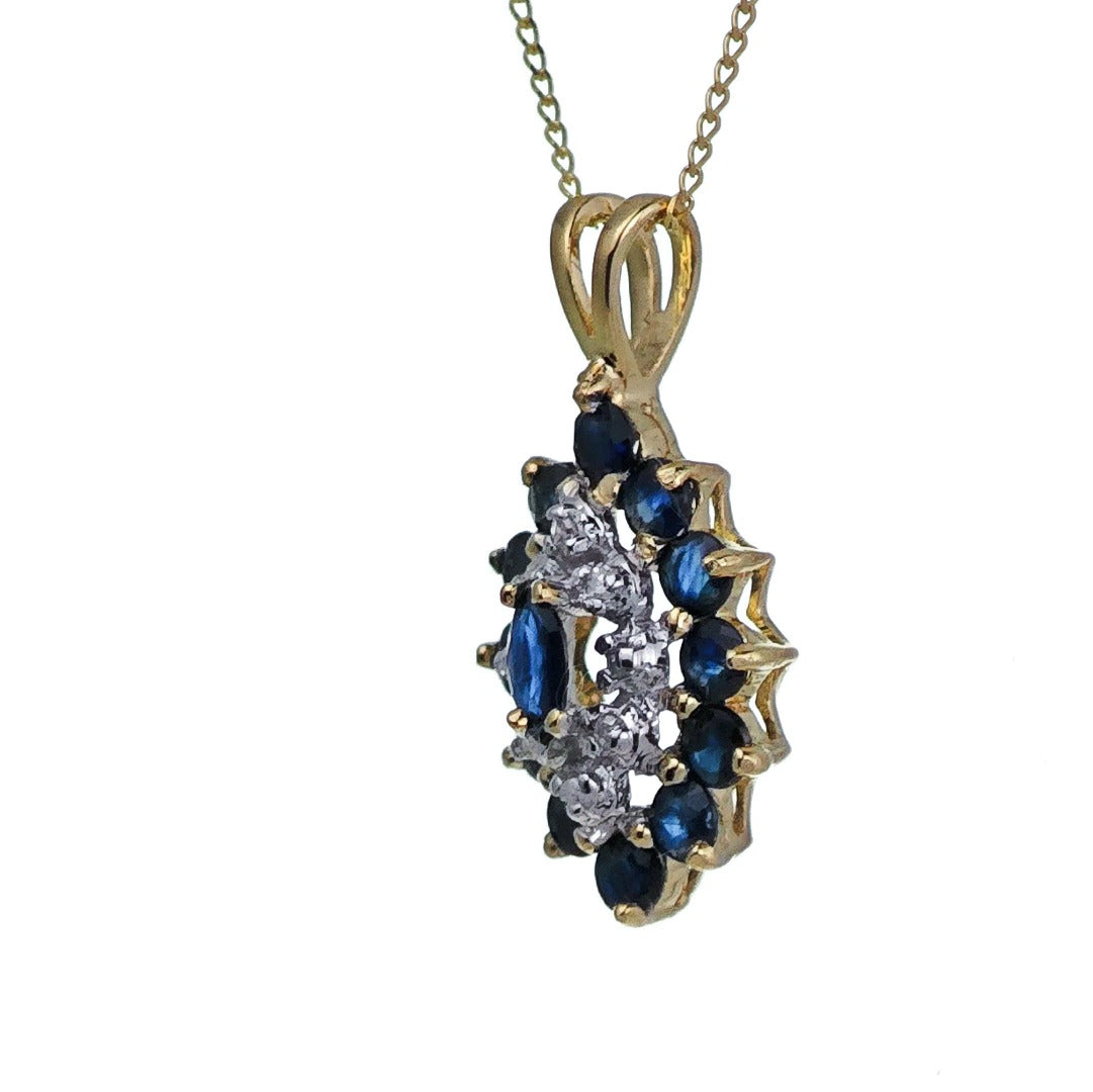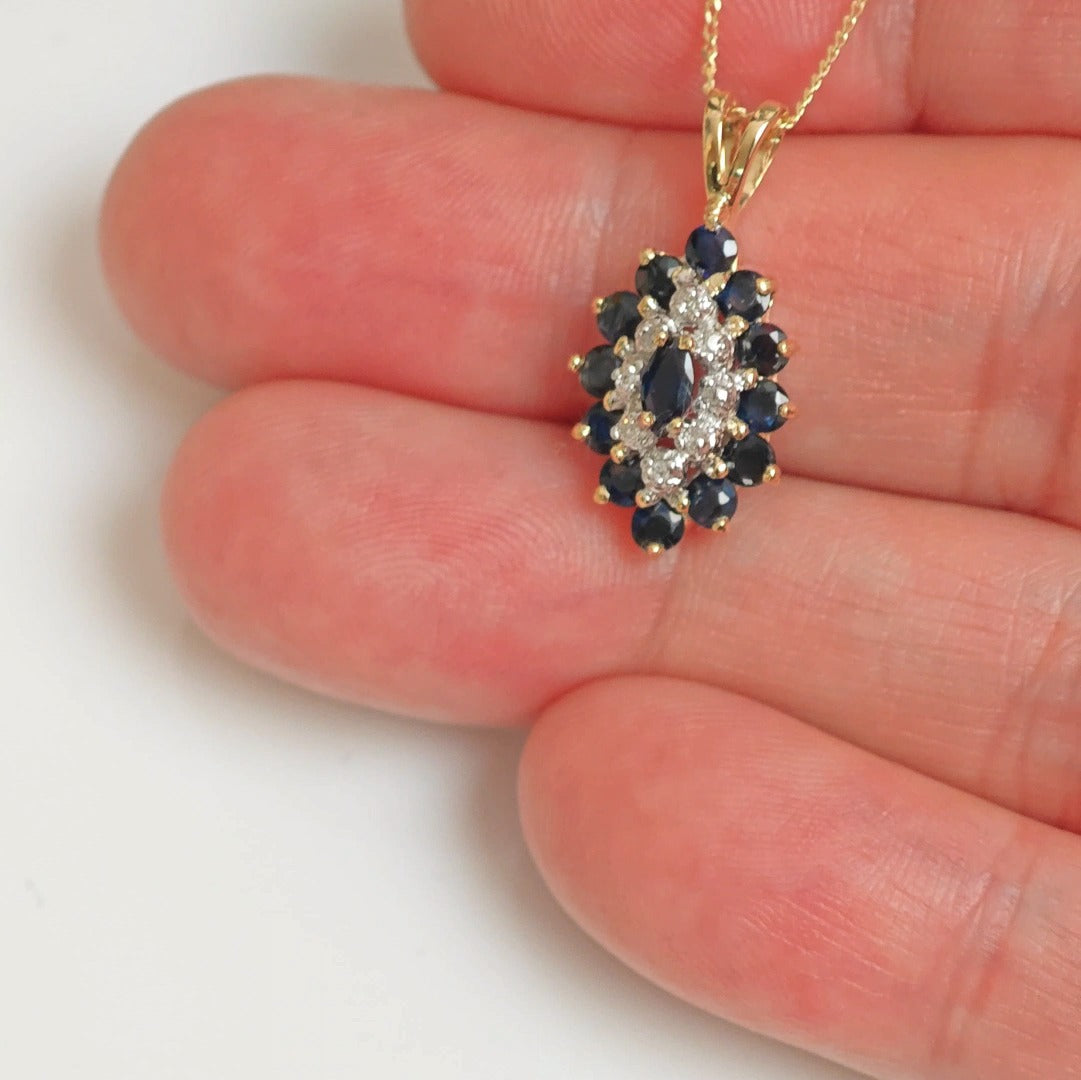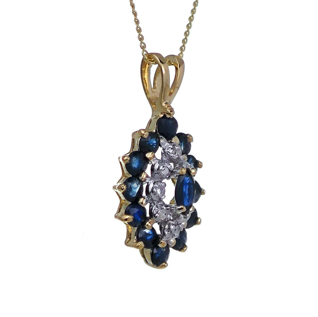 This elegant Sapphire Necklace is handmade. It features a natural Blue Australian Sapphire gemstone surrounded by natural African Diamonds. The stones are set in 9ct yellow gold with a rhodium layer around the diamonds to show off their natural sparkle.