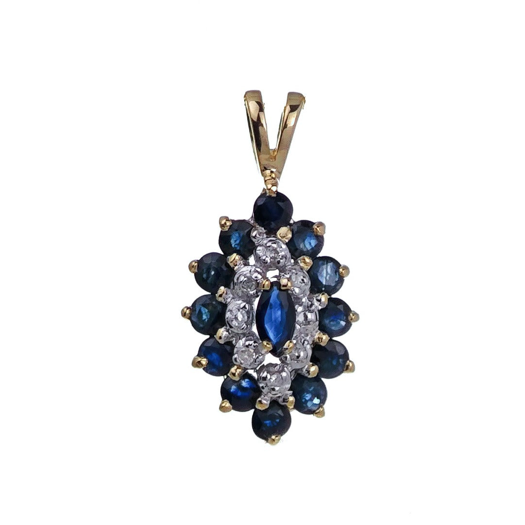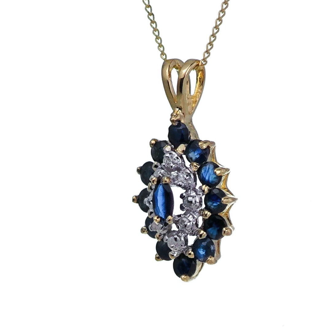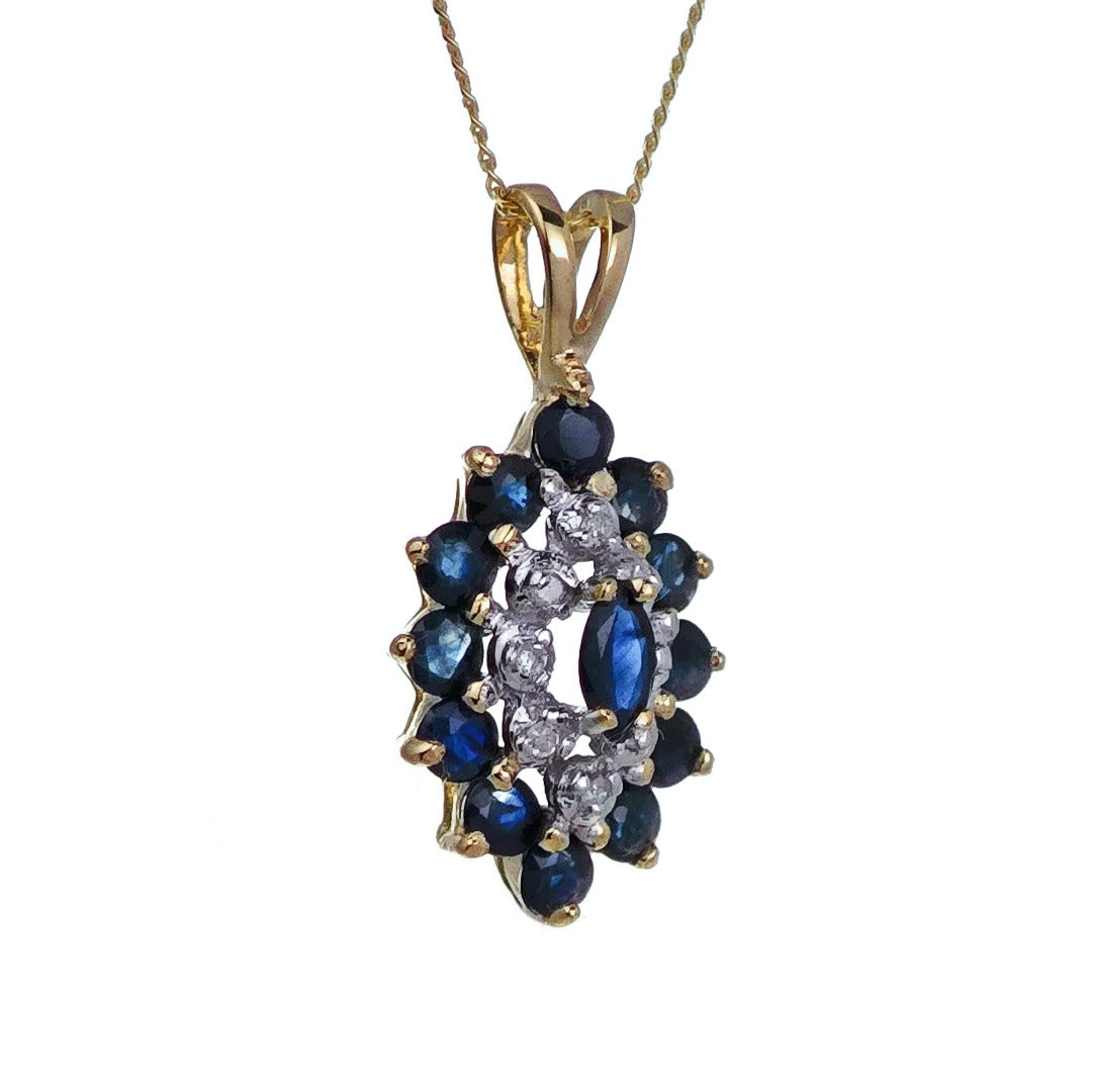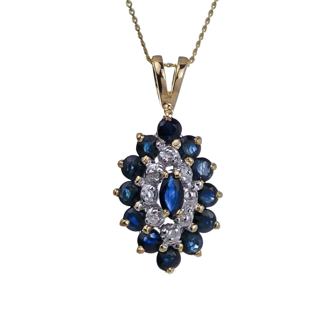 This elegant Sapphire Necklace is handmade. It features a natural Blue Australian Sapphire gemstone surrounded by natural African Diamonds. The stones are set in 9ct yellow gold with a rhodium layer around the diamonds to show off their natural sparkle.
