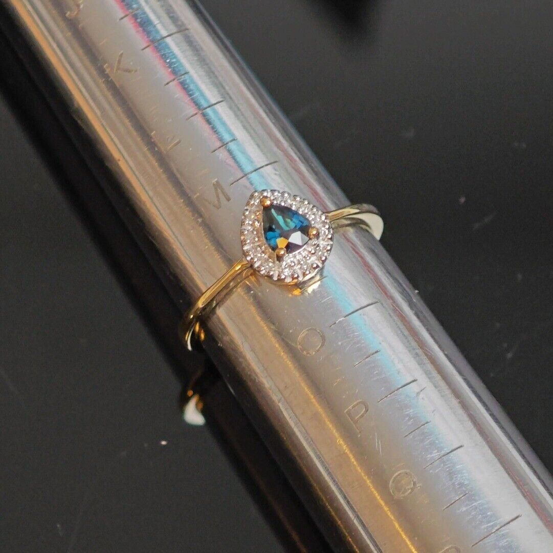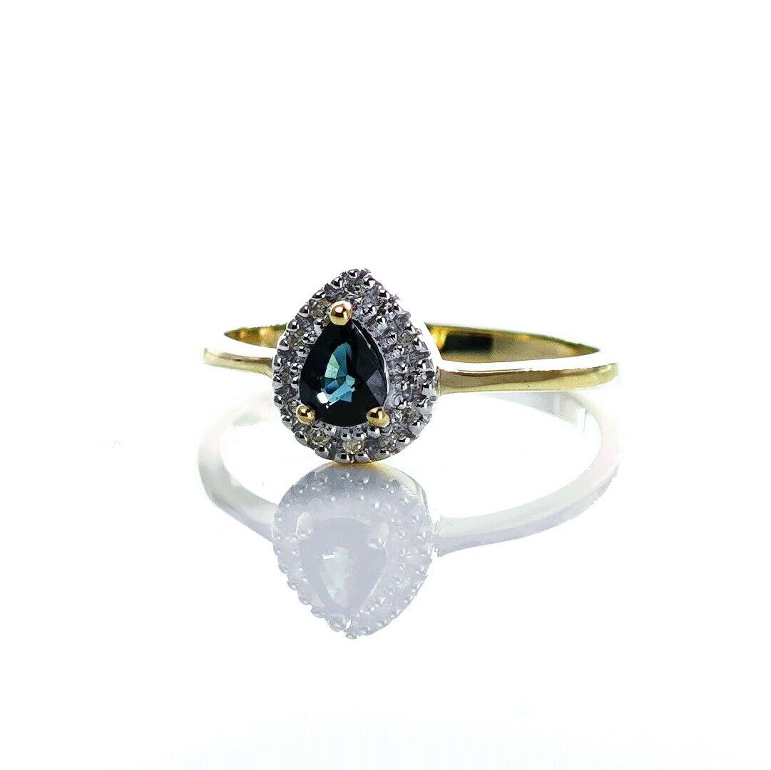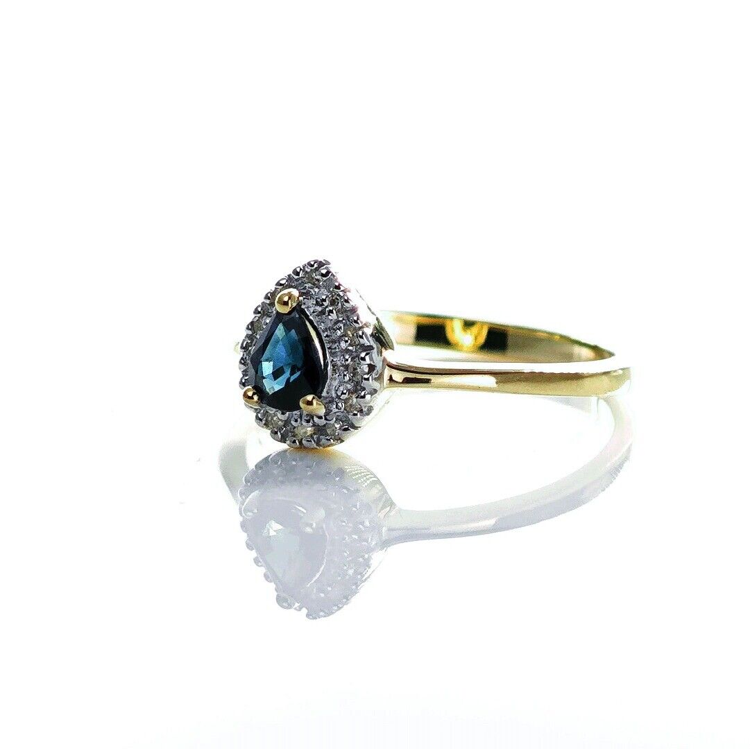 9ct Sapphire Ring Size N Diamond Yellow Gold 0.34ct Blue Pear Gemstone