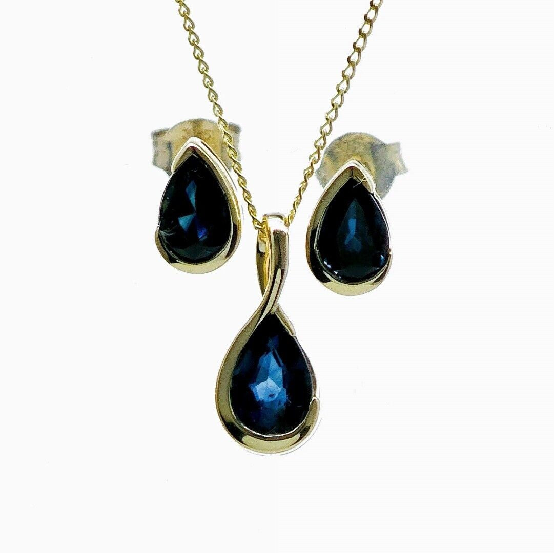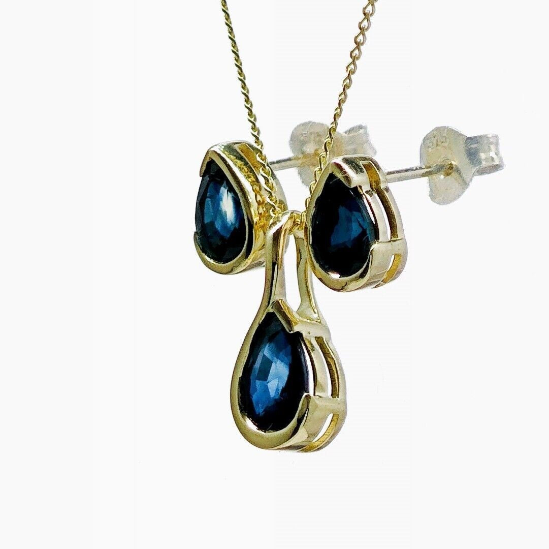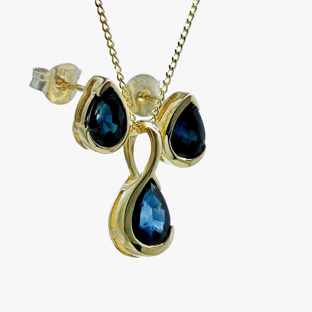 9ct Yellow Gold Blue Sapphire Set Pendant Stud Earrings Infinity Loop Natural Gemstone