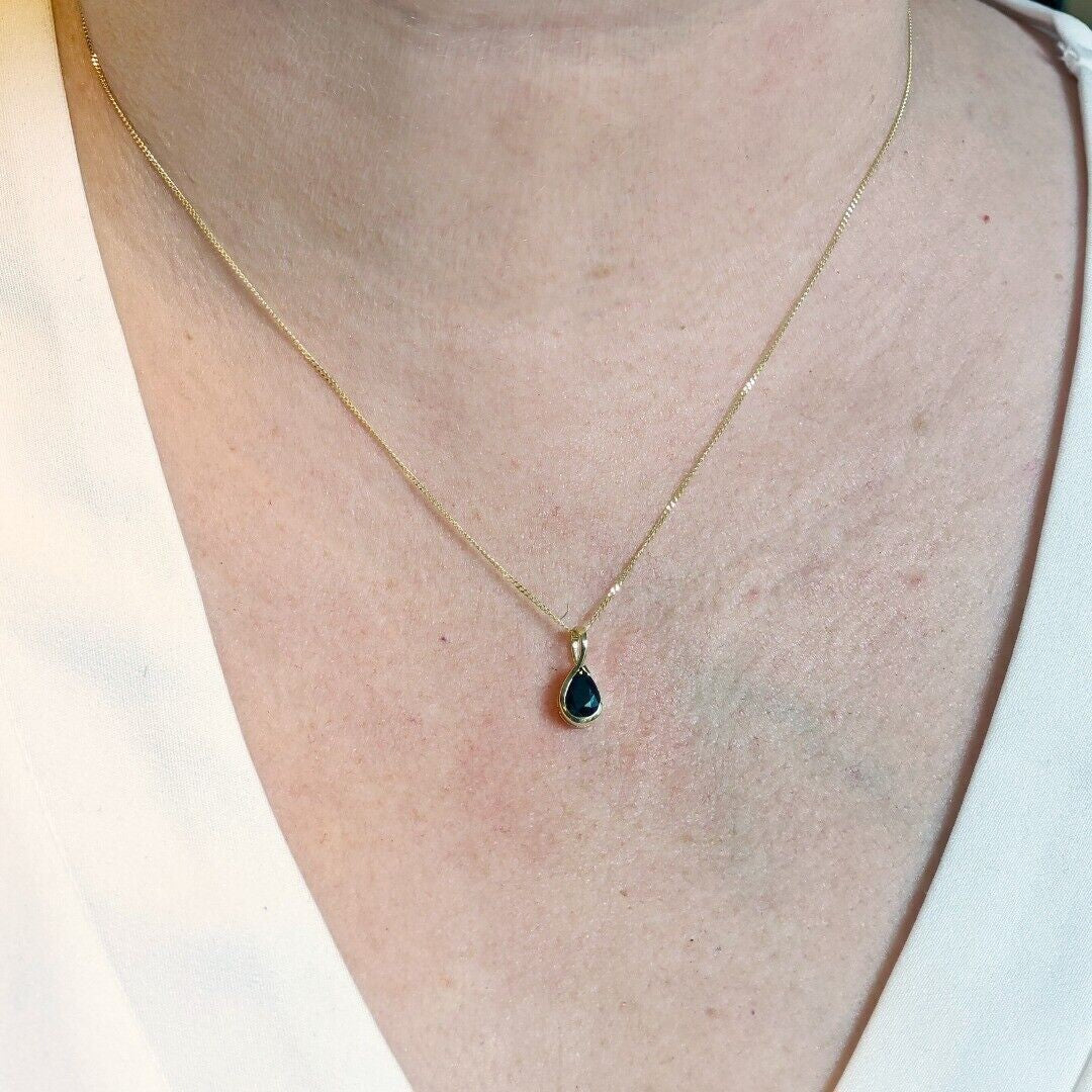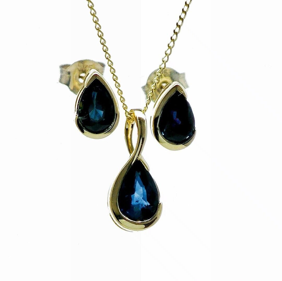Elegant 9ct Gold solitaire pear vivid blue sapphire pendant and matching stud earrings. Ojewellery design and part of our first full gold collection. Produced in very small quantities you will only find this set from Ojewellery direct.