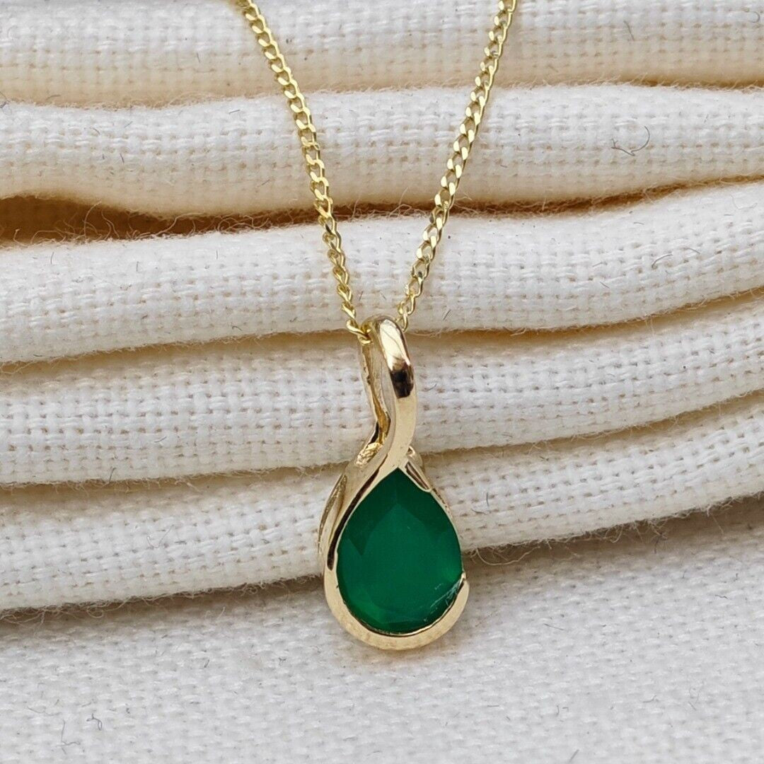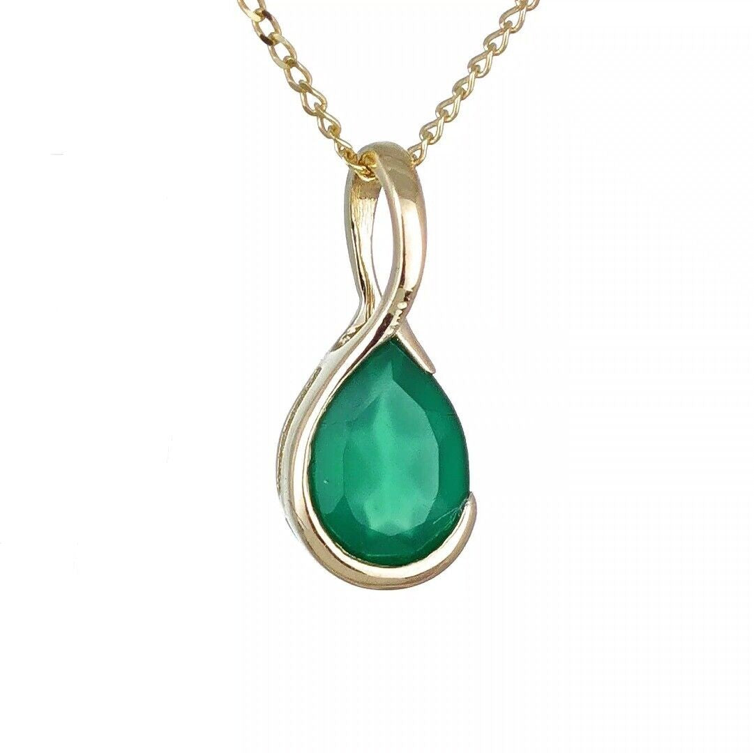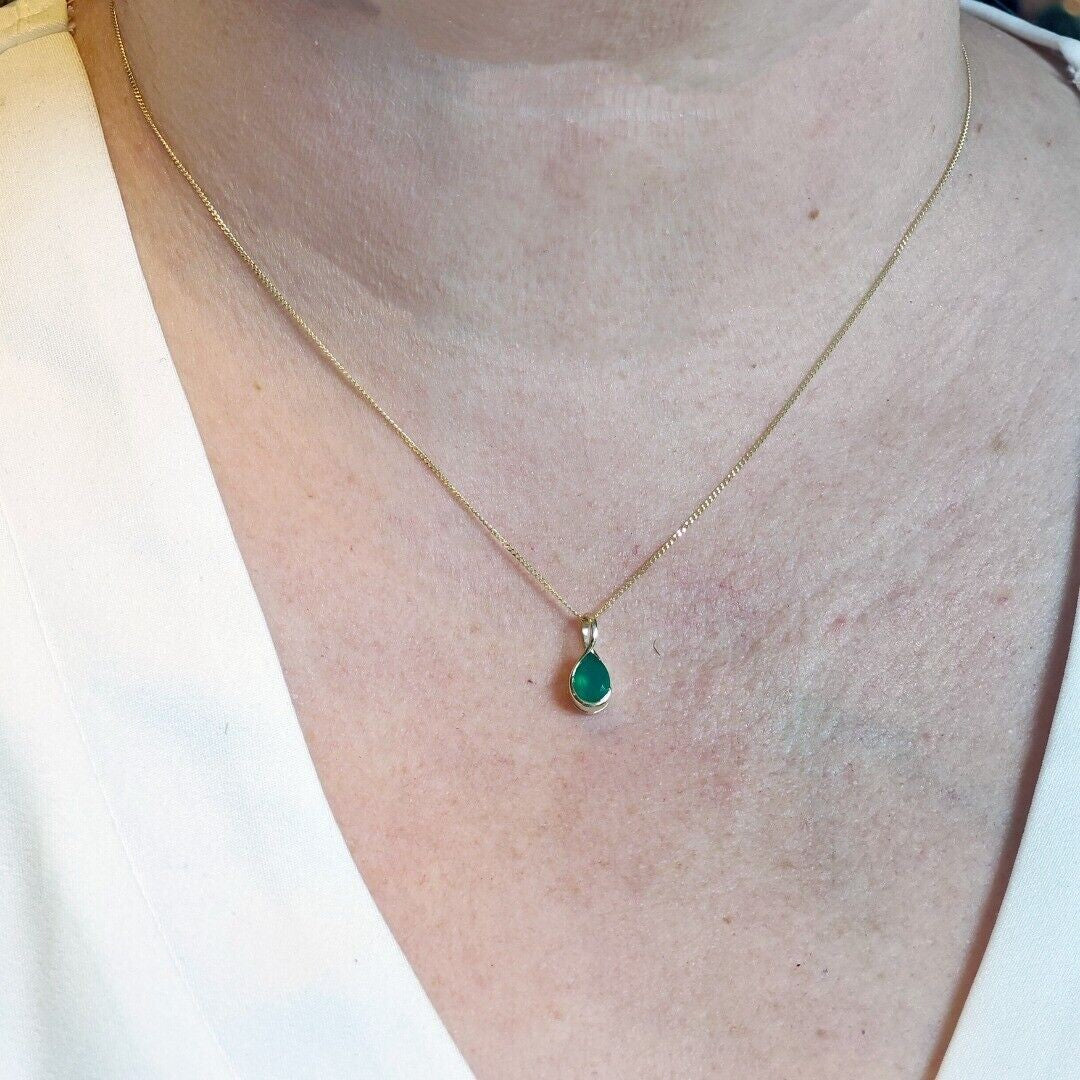 Elegant onyx pear pendant. Set in a raised rub over setting made of 9ct Yellow Gold to allow light to the back of the stone and show off its natural sparkle. The natural green onyx are from India. The stone measures 7x5 mm