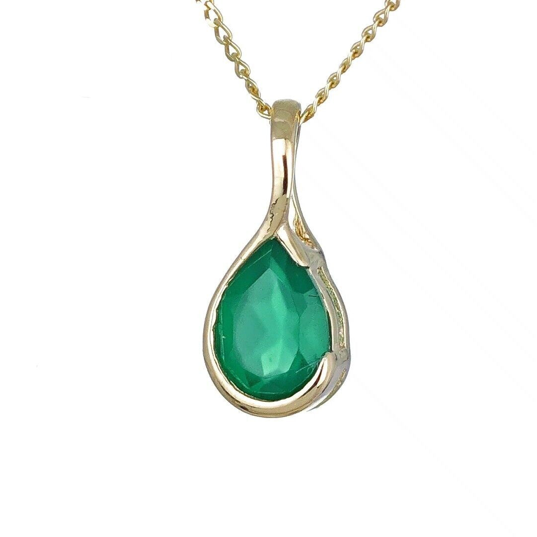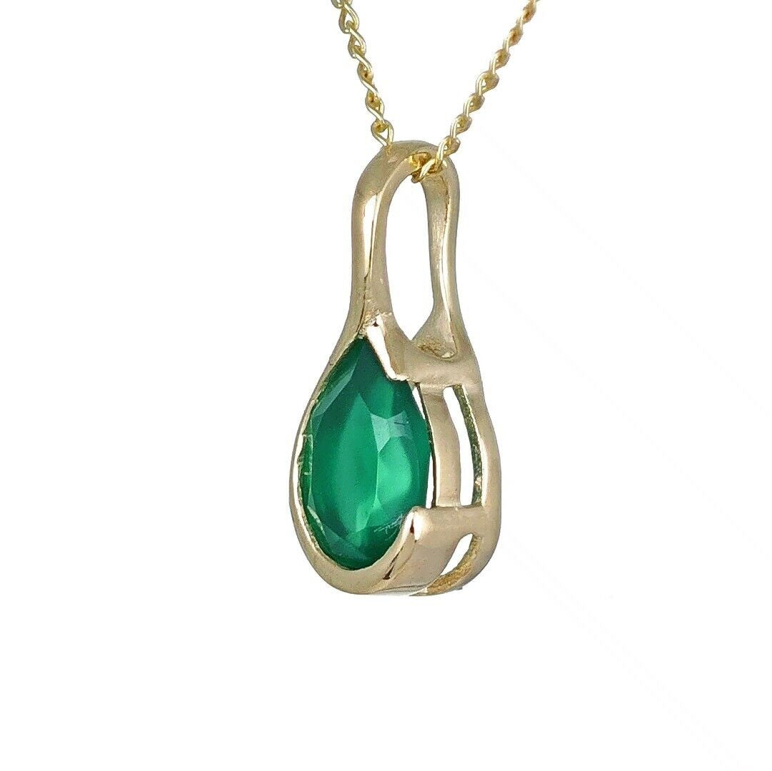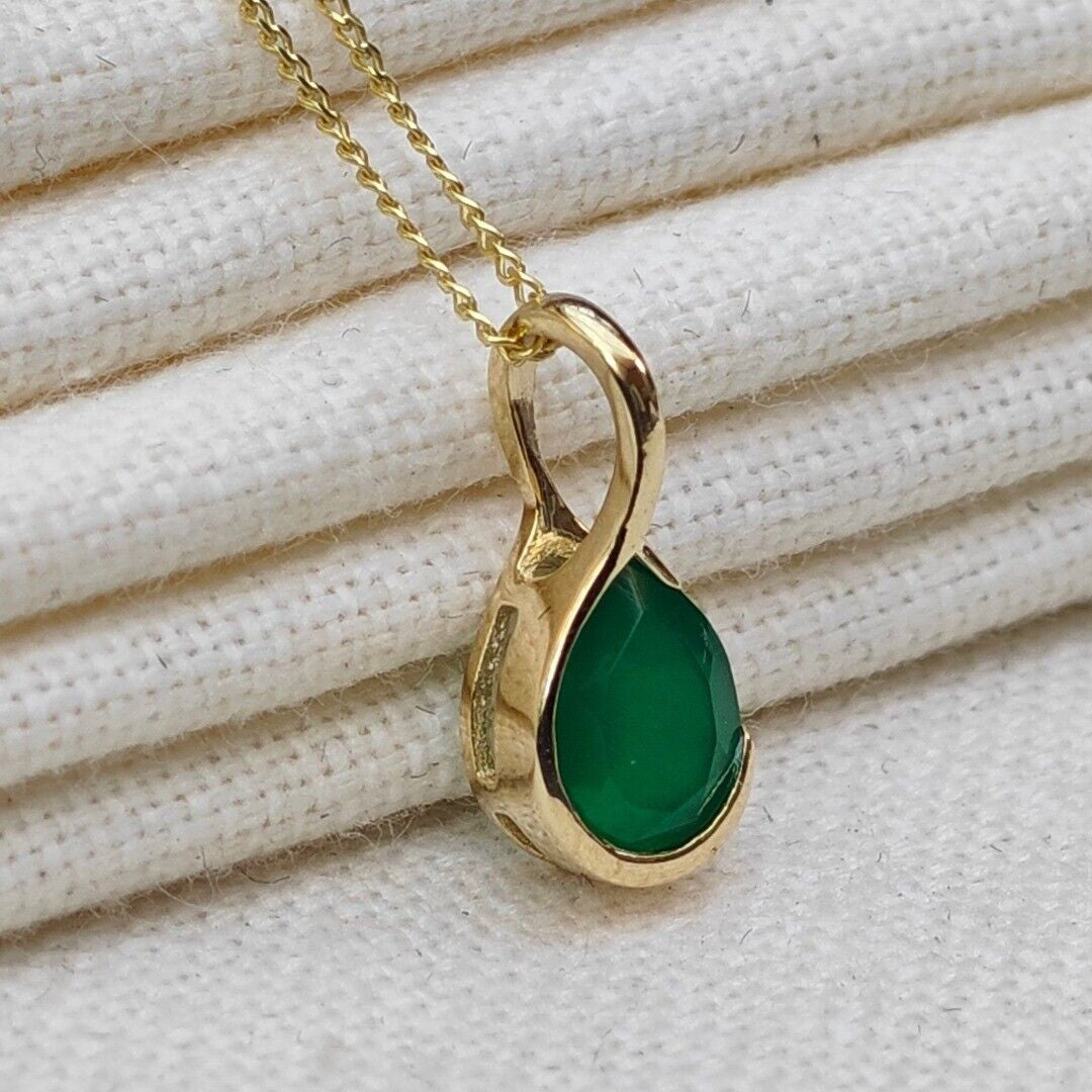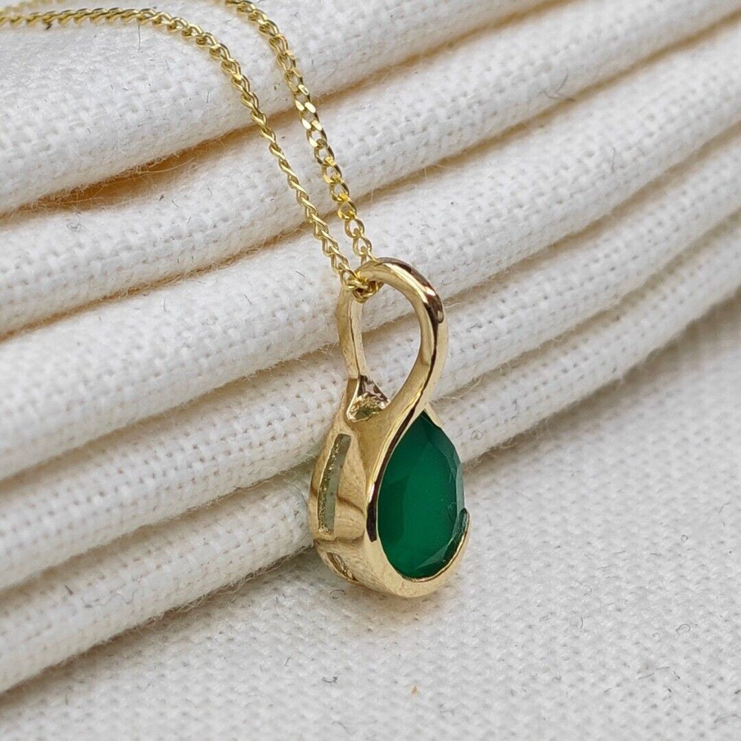 Elegant onyx pear pendant. Set in a raised rub over setting made of 9ct Yellow Gold to allow light to the back of the stone and show off its natural sparkle. The natural green onyx are from India. The stone measures 7x5 mm