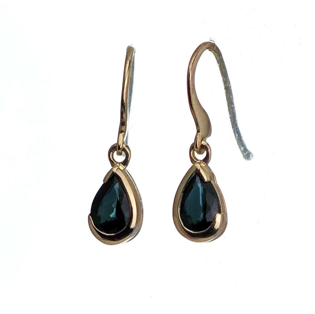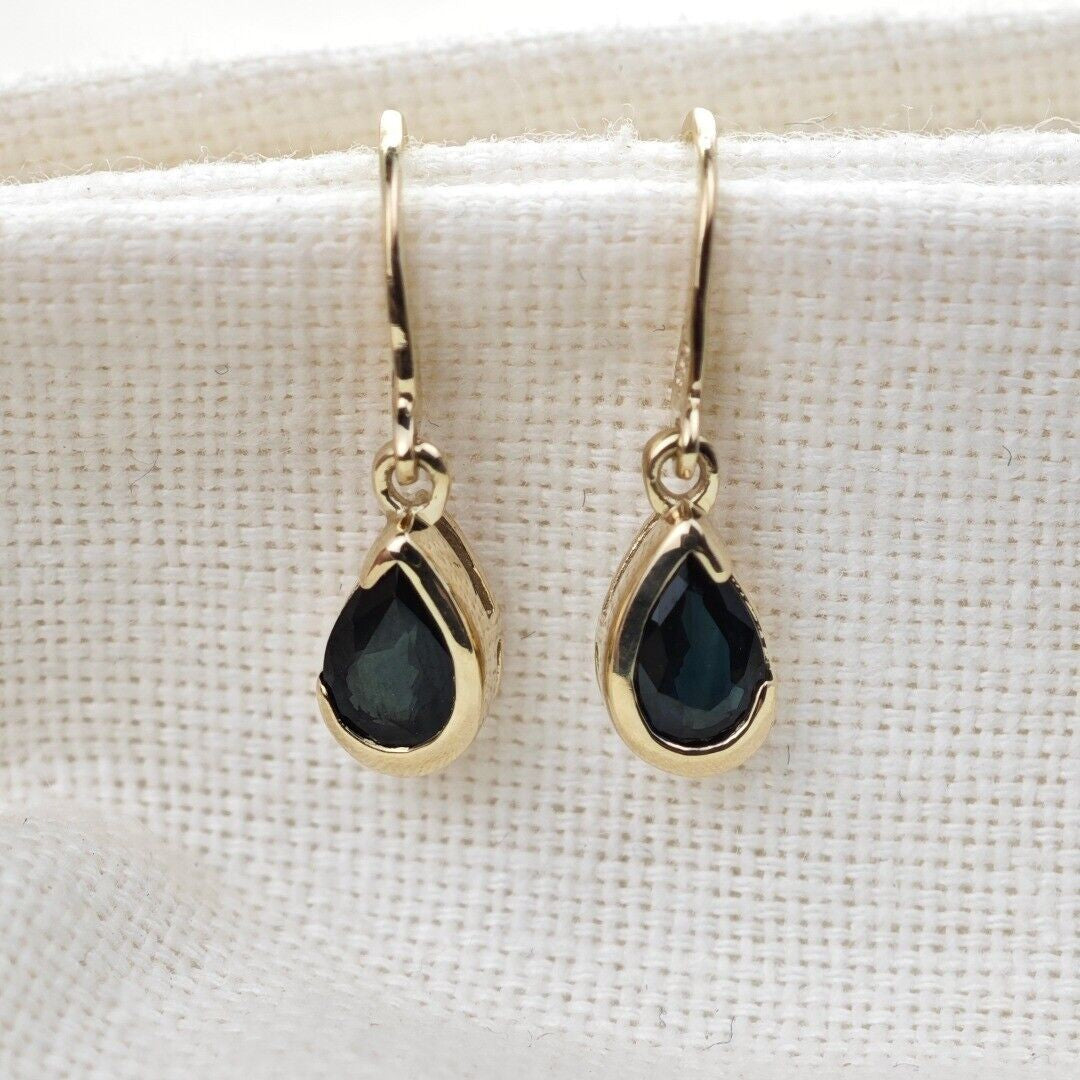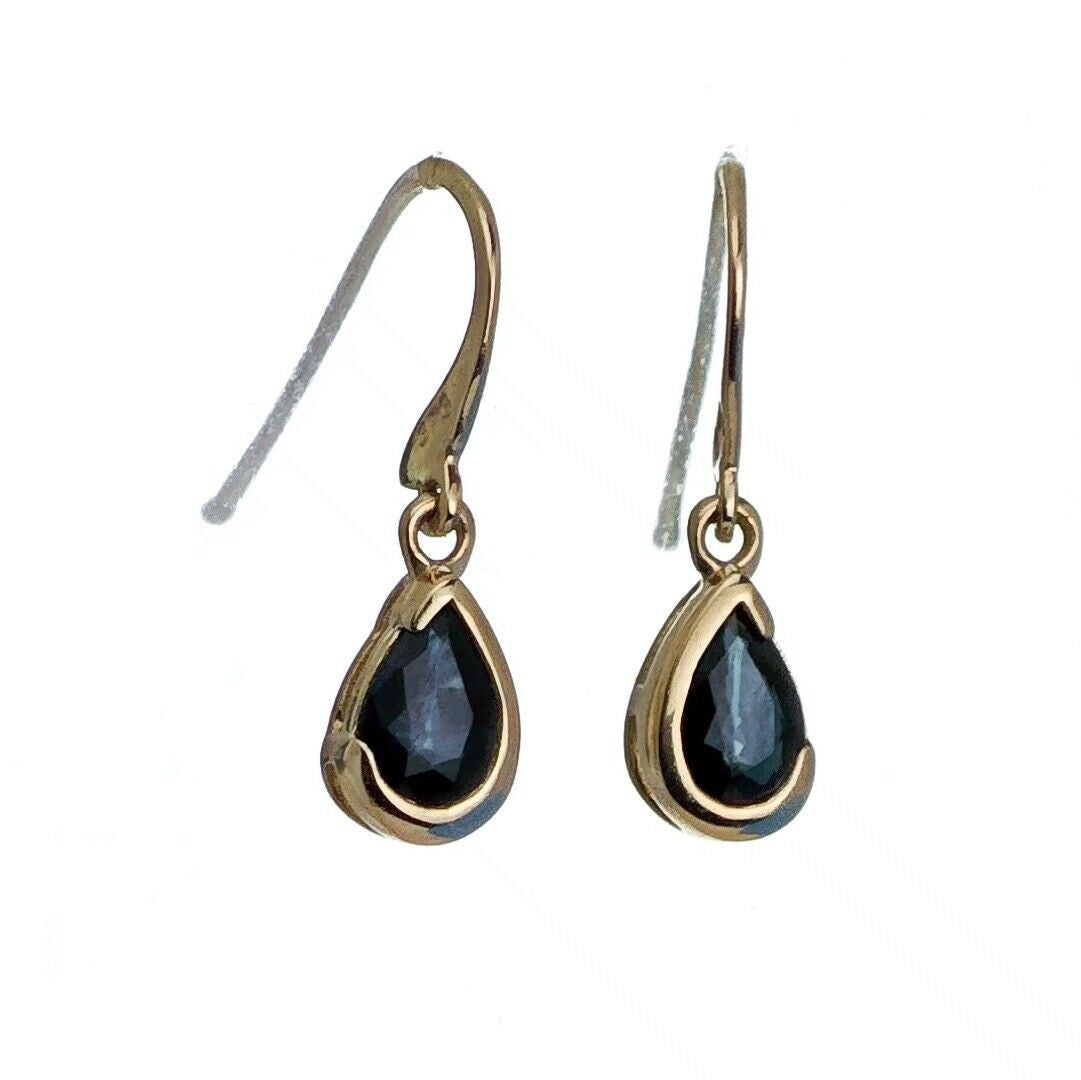 9ct Yellow Gold Sapphire Earrings Natural Inky Blue Gemstone Dangle Handmade