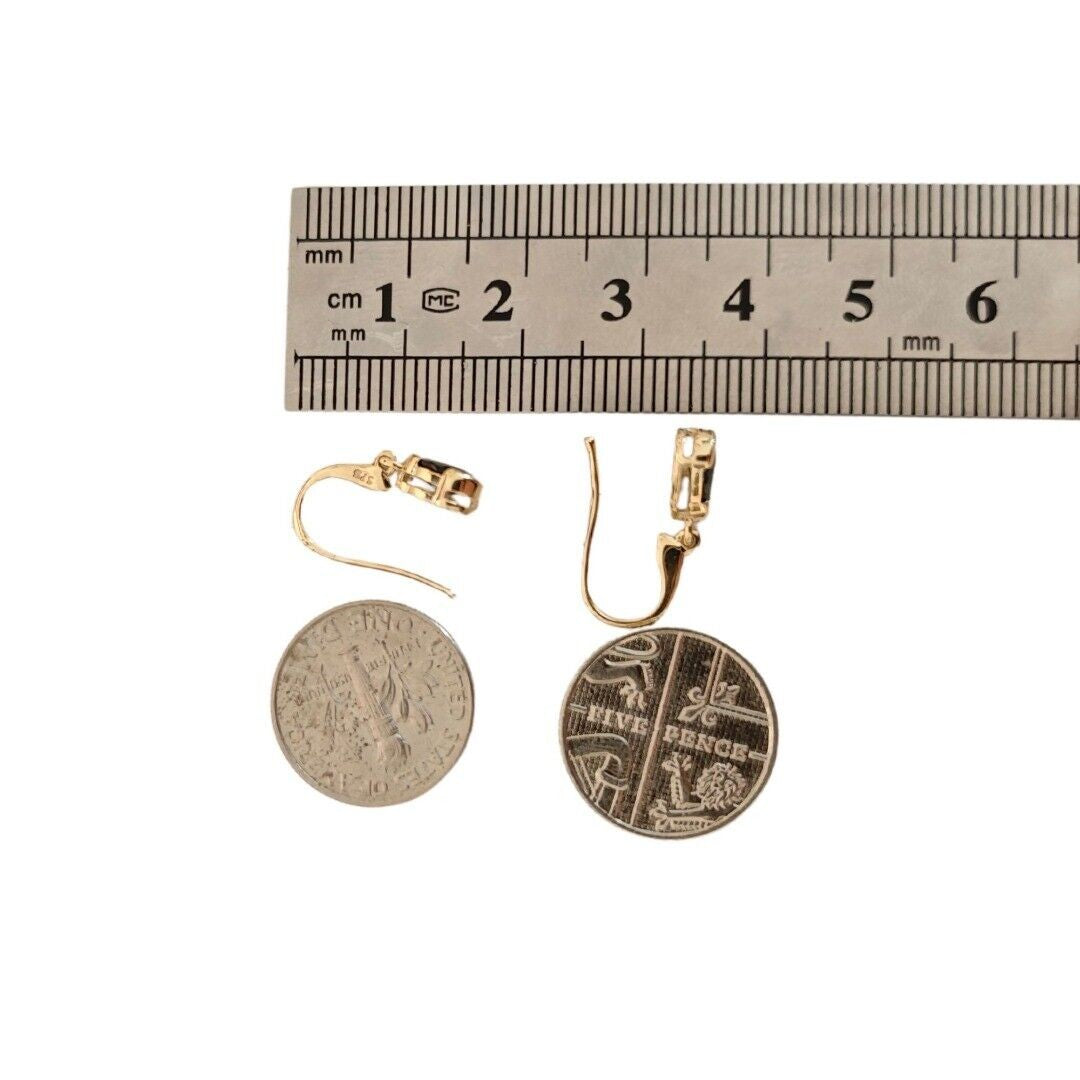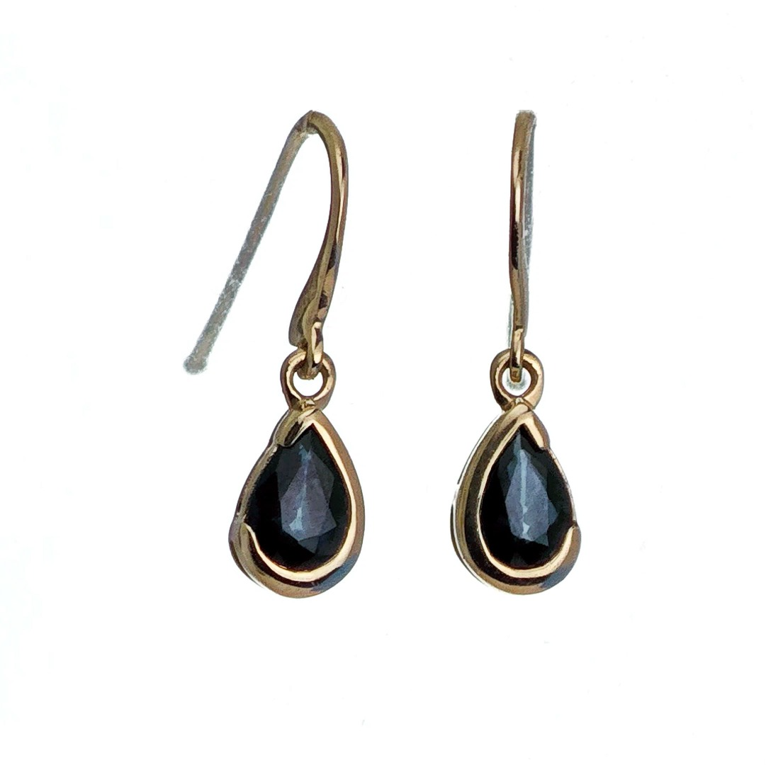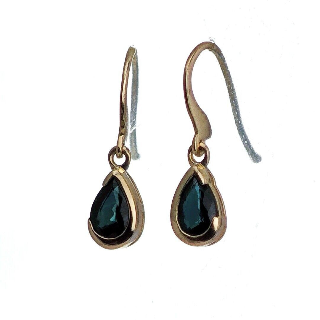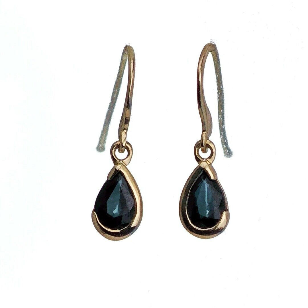 9ct Yellow Gold Sapphire Earrings Natural Inky Blue Gemstone Dangle Handmade