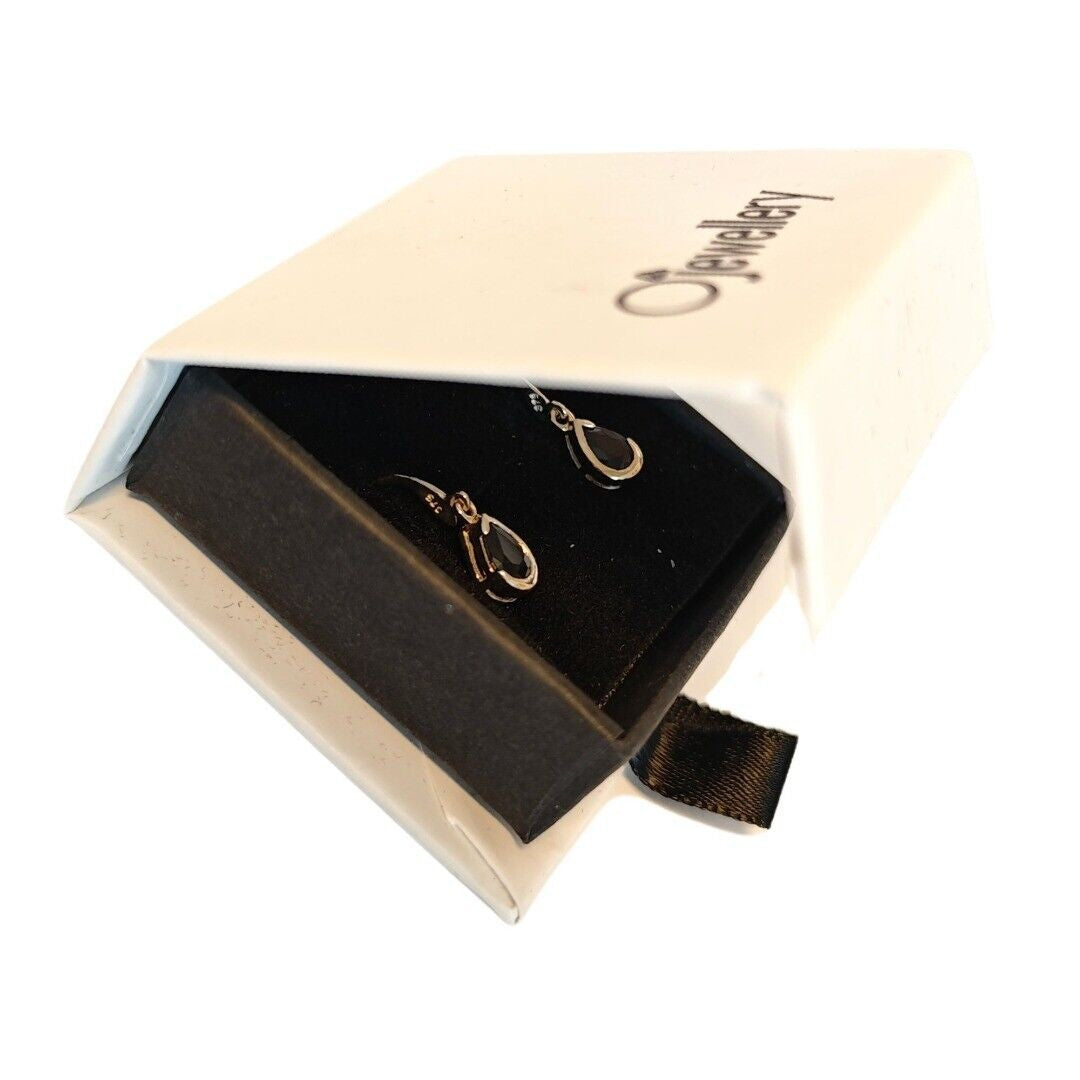 Elegant 9ct Gold solitaire pear dark inky blue/ black sapphire dangle earrings. Ojewellery design and part of our gold infinity loop collection. Produced in very small quantities you will only find these earrings from Ojewellery direct.