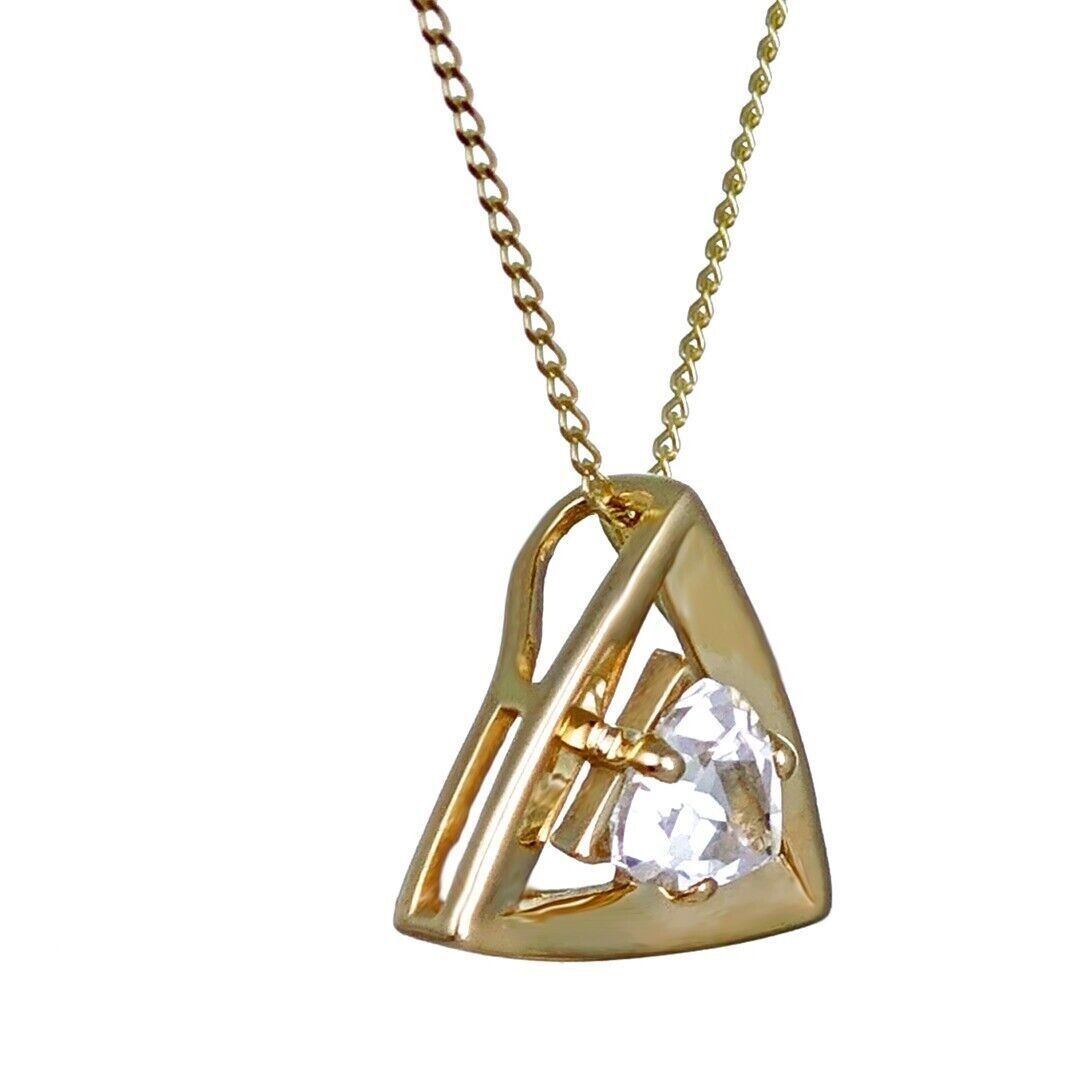 Add a touch of elegance to your jewellery collection with this stunning 9ct Gold Topaz Necklace. The triangular-shaped pendant features a natural white Topaz gemstone with a total carat weight of 0.5. The prong setting style enhances the beauty of the gemstone, making it the perfect accessory for any occasion. The necklace is 46 cm in length and is made of high-quality yellow gold, making it a durable addition to your collection. Handmade and beautifully boxed, this necklace is a must-have for any jewellery lover.