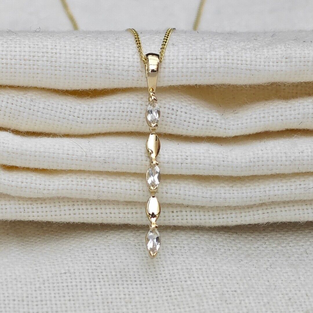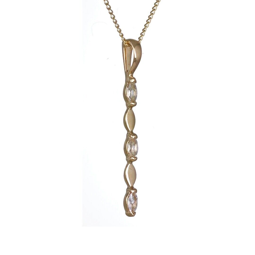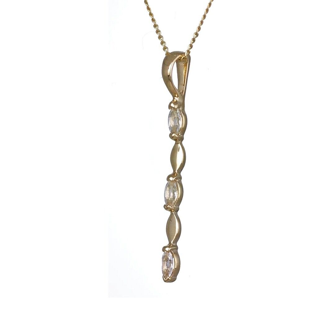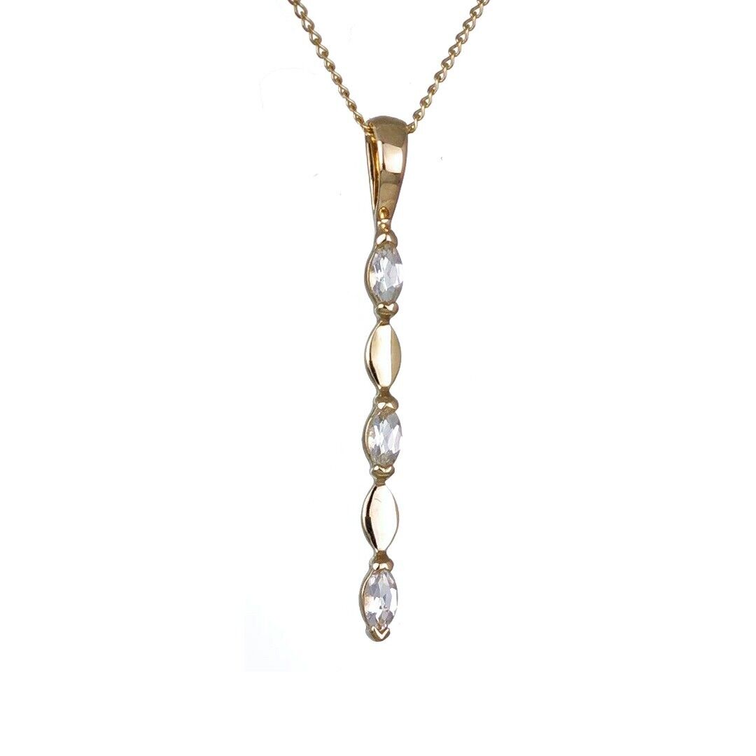This elegant marquise cut topaz drop pendant is made of 9ct yellow gold and features three natural topaz gemstones from Africa. Each stone measures 4 x 2mm, giving an approximate total carat weight of 0.26ct. White Topaz are associated with love self esteem and good fortune. They are the birthstone for April
