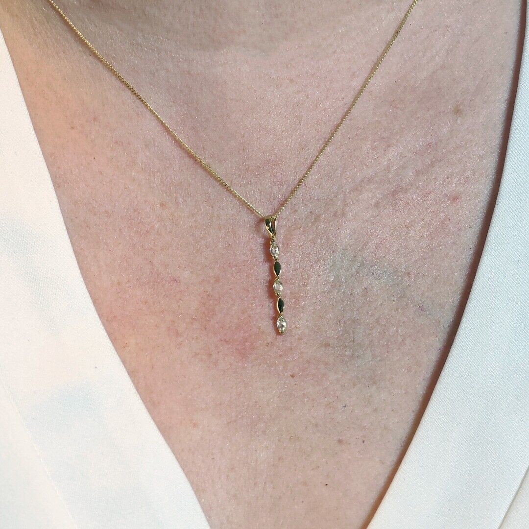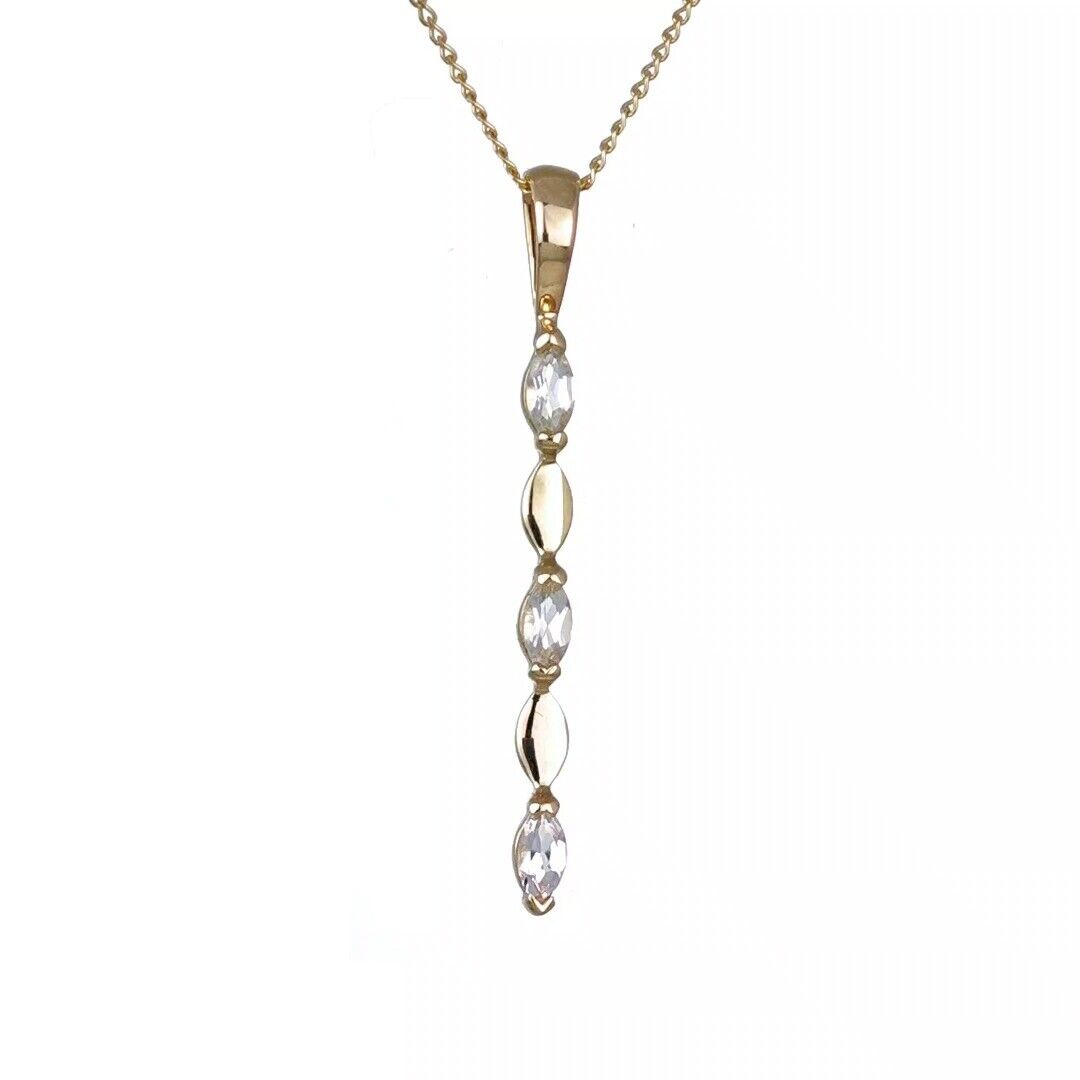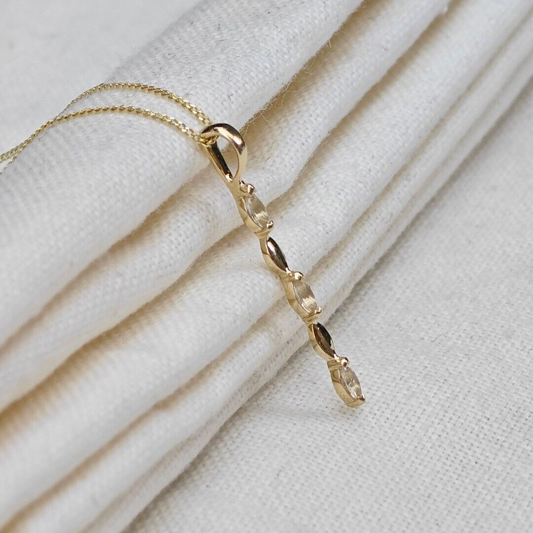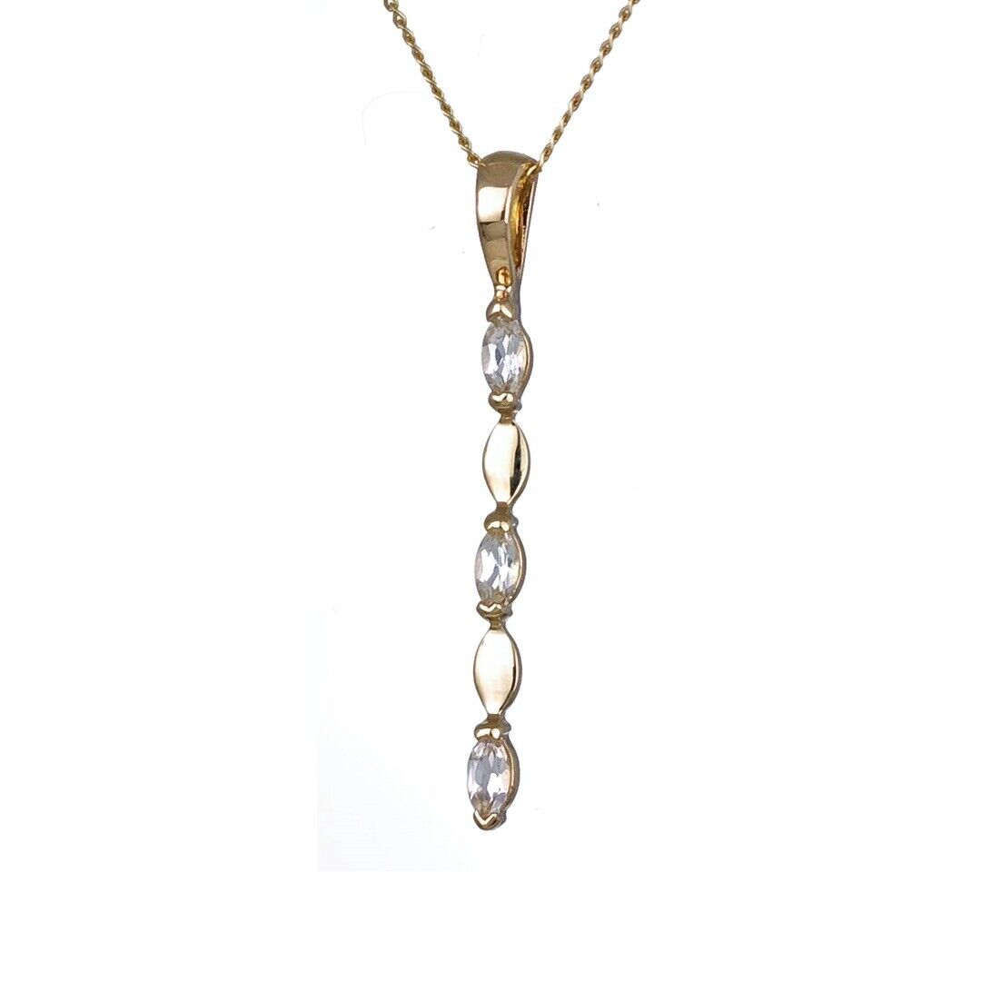 This elegant marquise cut topaz drop pendant is made of 9ct yellow gold and features three natural topaz gemstones from Africa. Each stone measures 4 x 2mm, giving an approximate total carat weight of 0.26ct. White Topaz are associated with love self esteem and good fortune. They are the birthstone for April
