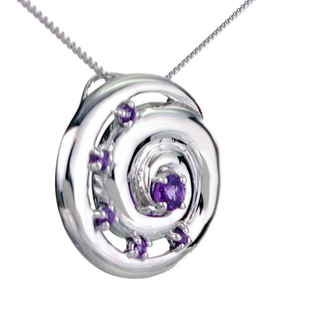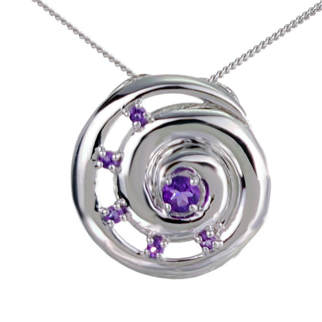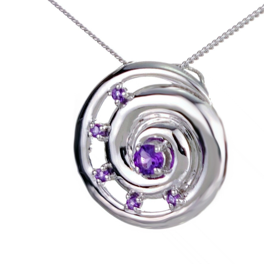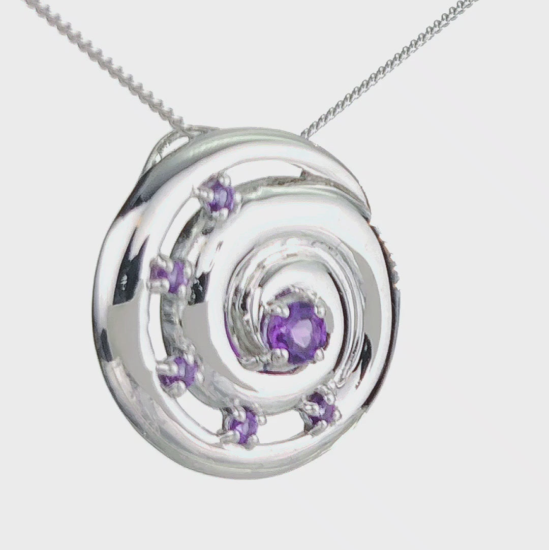 Elegant ammonite statement pendant set with six natural African purple amethysts. The central amethyst is 4mm and surrounding stones each 2mm diameter giving a total carat weight of 0.54ct.