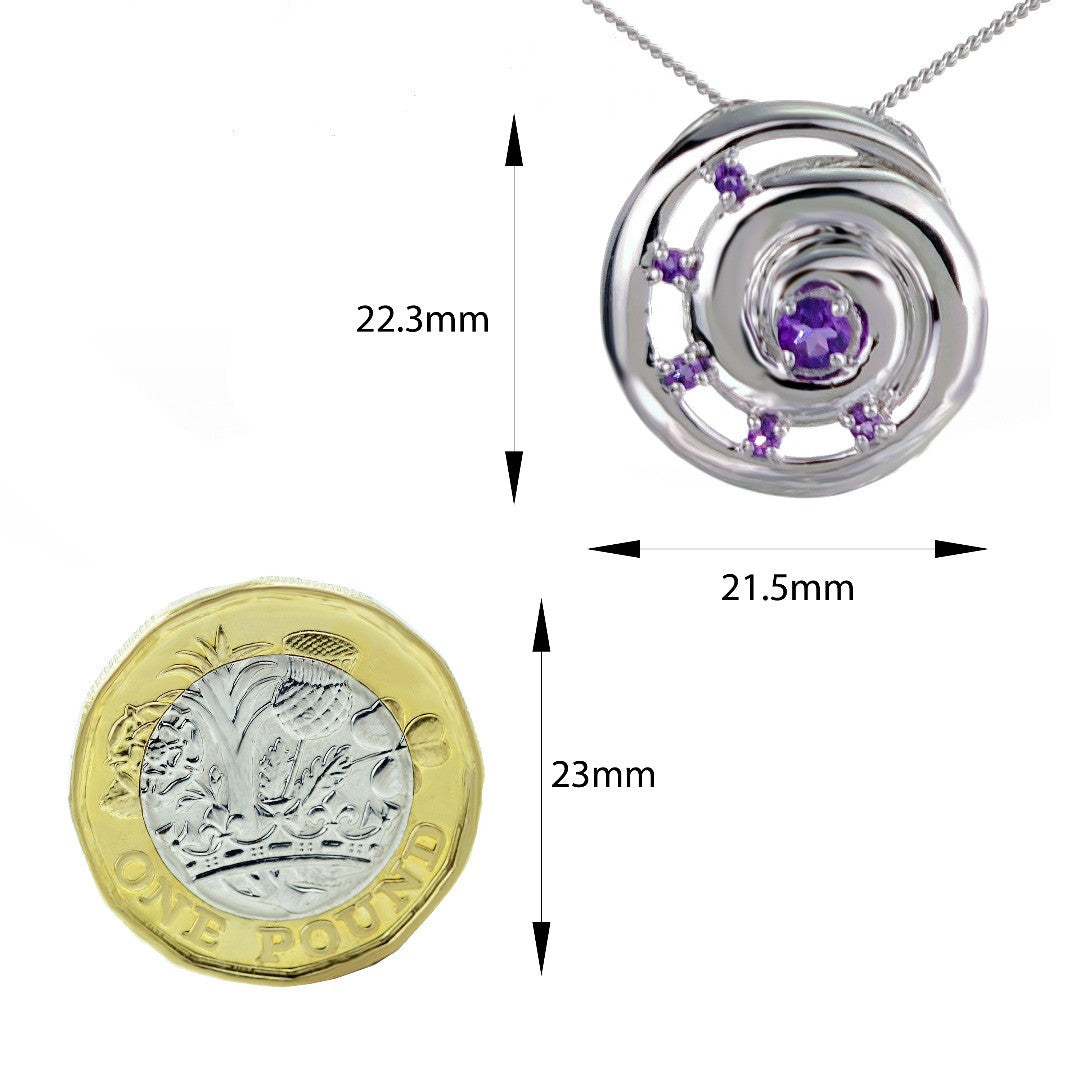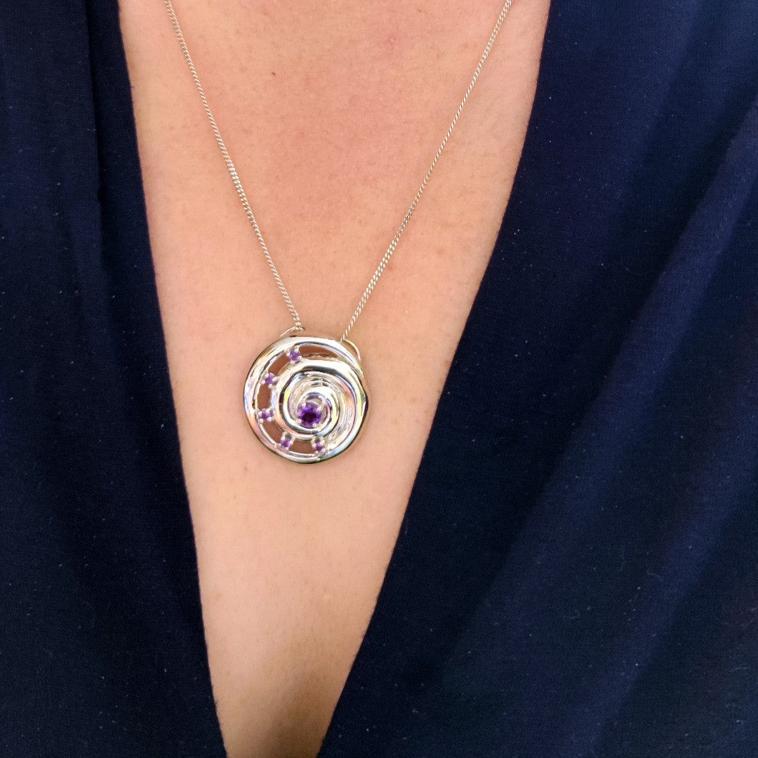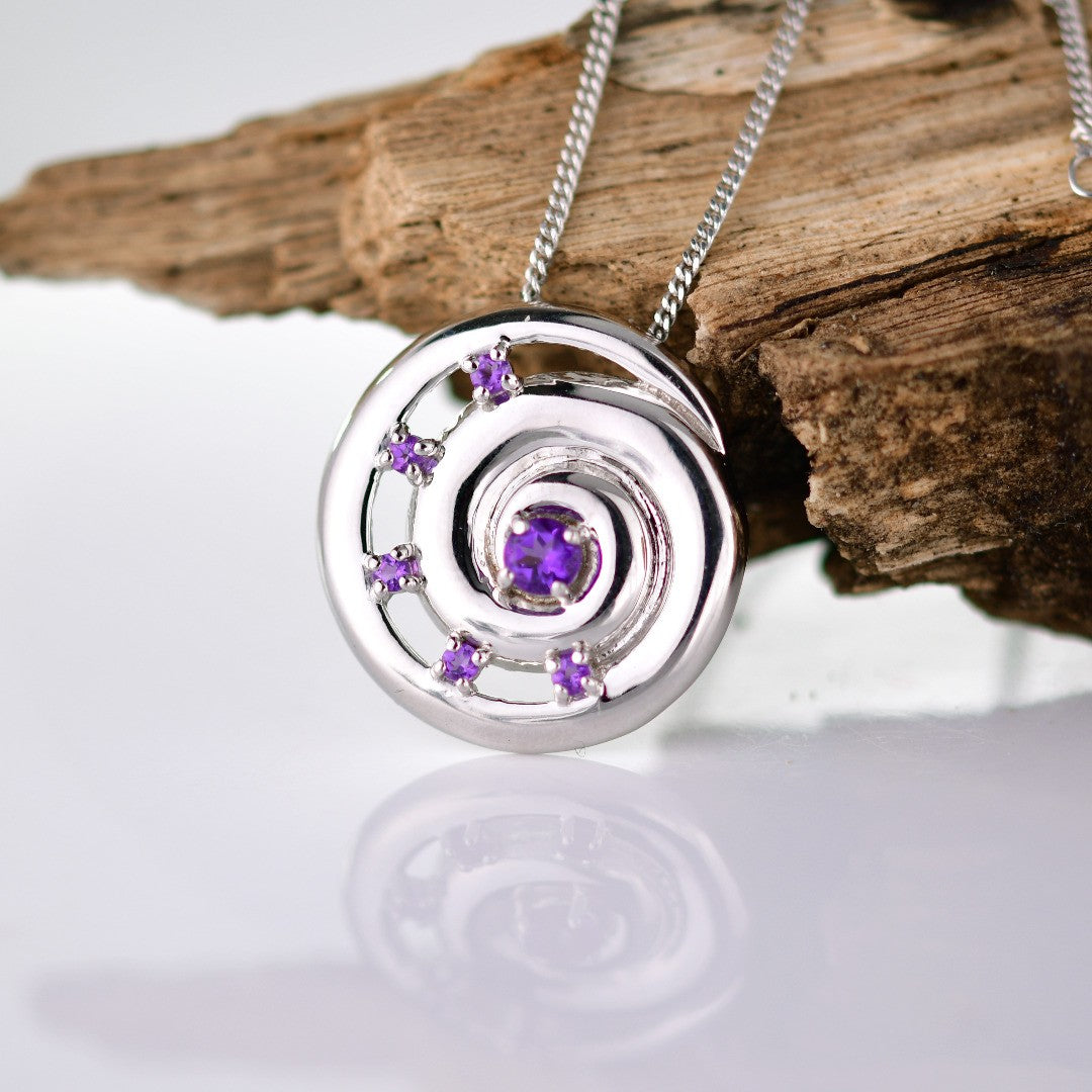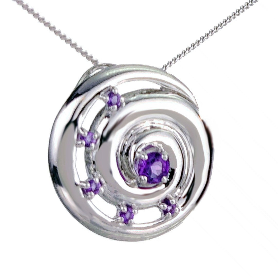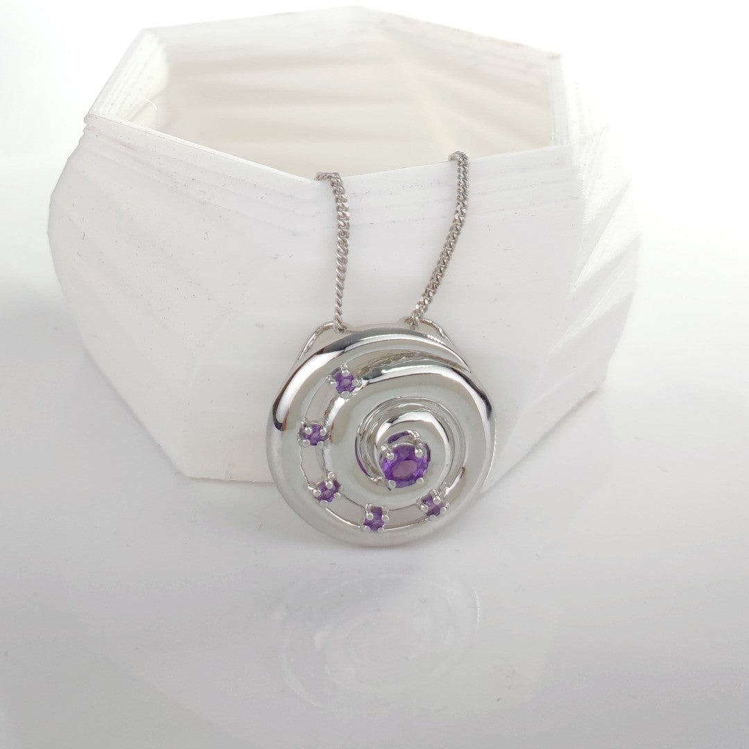 Elegant ammonite statement pendant set with six natural African purple amethysts. The central amethyst is 4mm and surrounding stones each 2mm diameter giving a total carat weight of 0.54ct.