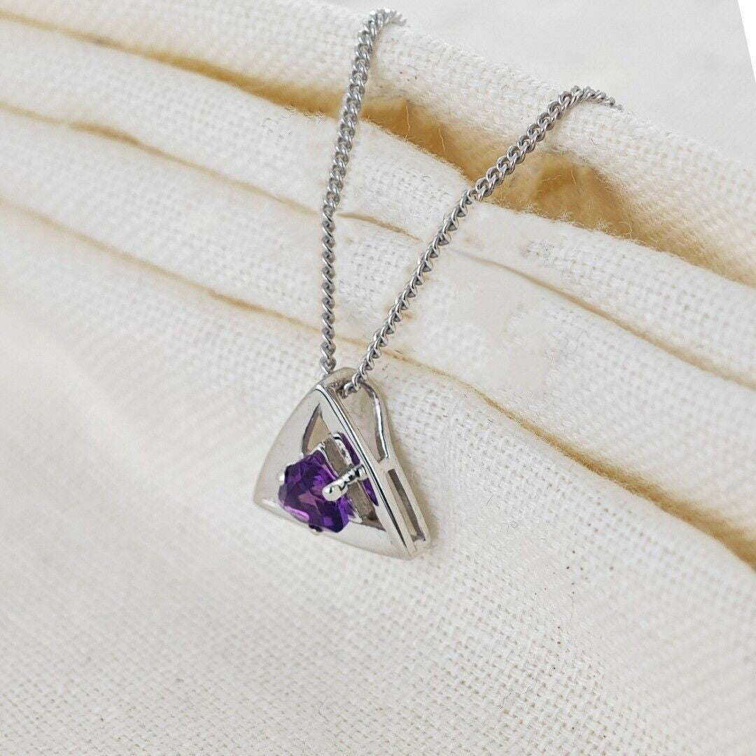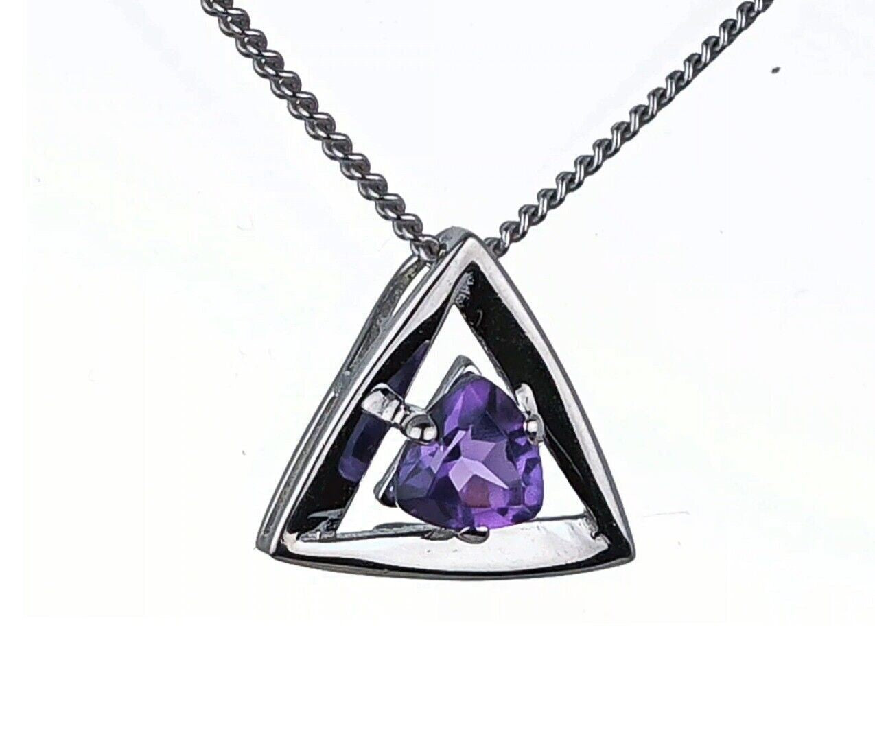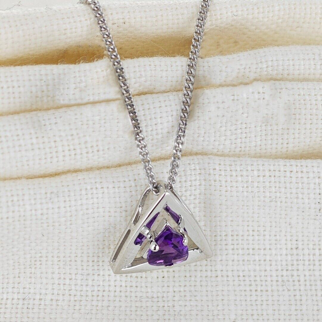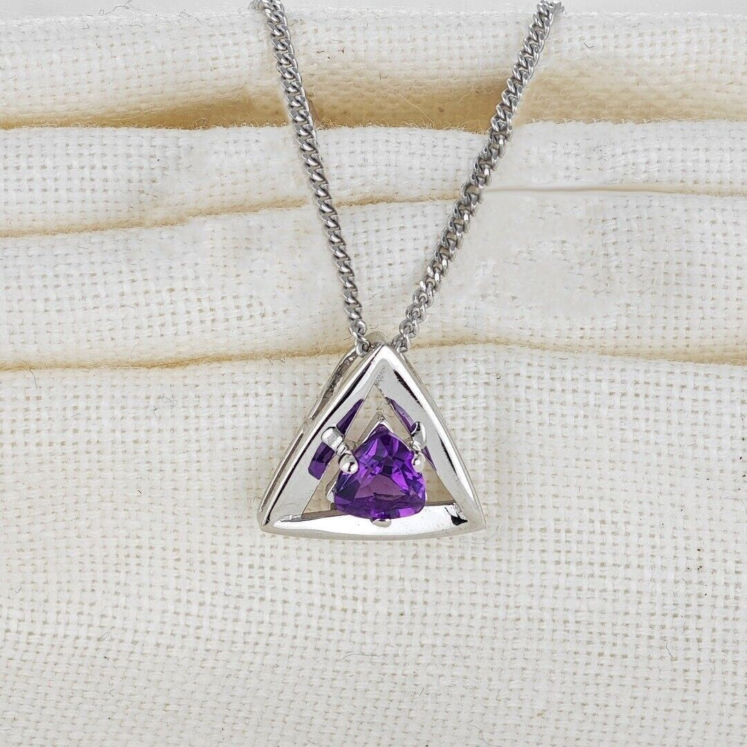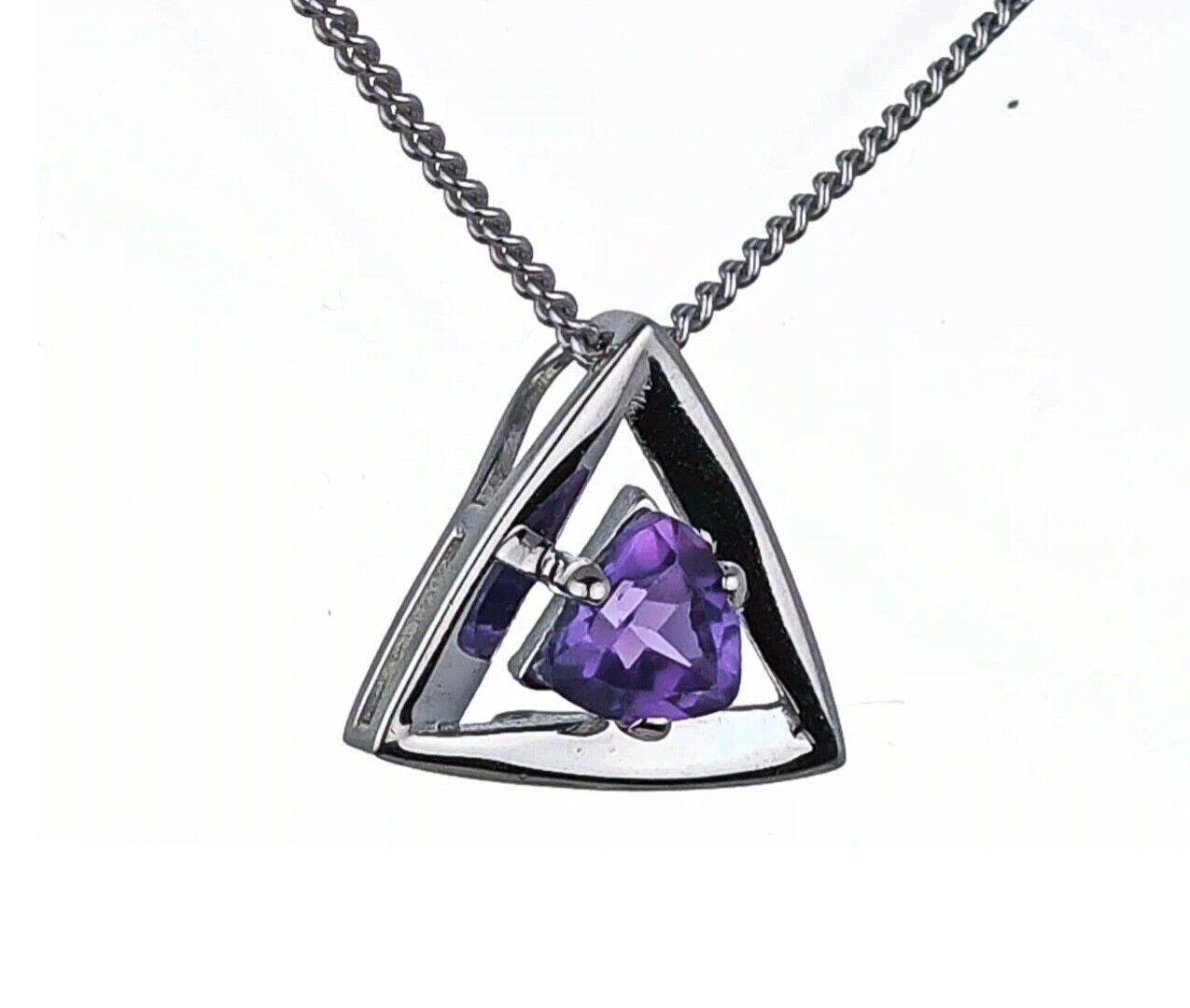 Trillion cut stone set in a triangle made of sterling silver. The stone measures 5 x 5mmAmethysts are associated with calm and wisdom. They are the birthstone for February.These elegant pendant suitable to wear for daytime or evening wear.Finished with a commercial grade rhodium plate to give a high quality shine finish.Supplied in an Ojewellery presentation box, within a ribbon handled gift bag, complete with product information authenticity card with space for a gift message and a jewellery cleaning cloth to keep your jewellery in ready to wear condition.Our jewellery packaging is from an FSC chain of custody audited supplier and our very short supply chains mean we are able to trace our natural gemstones back to country of origin.Specification:Chain Curb Link 18 inch with lobster clasp fasteningPendant Drop: 11.5mmPendant Width: 12.6mmWeight: 3.5gStones Natural African Purple Amethysts Trillion cut 5 x 5mm