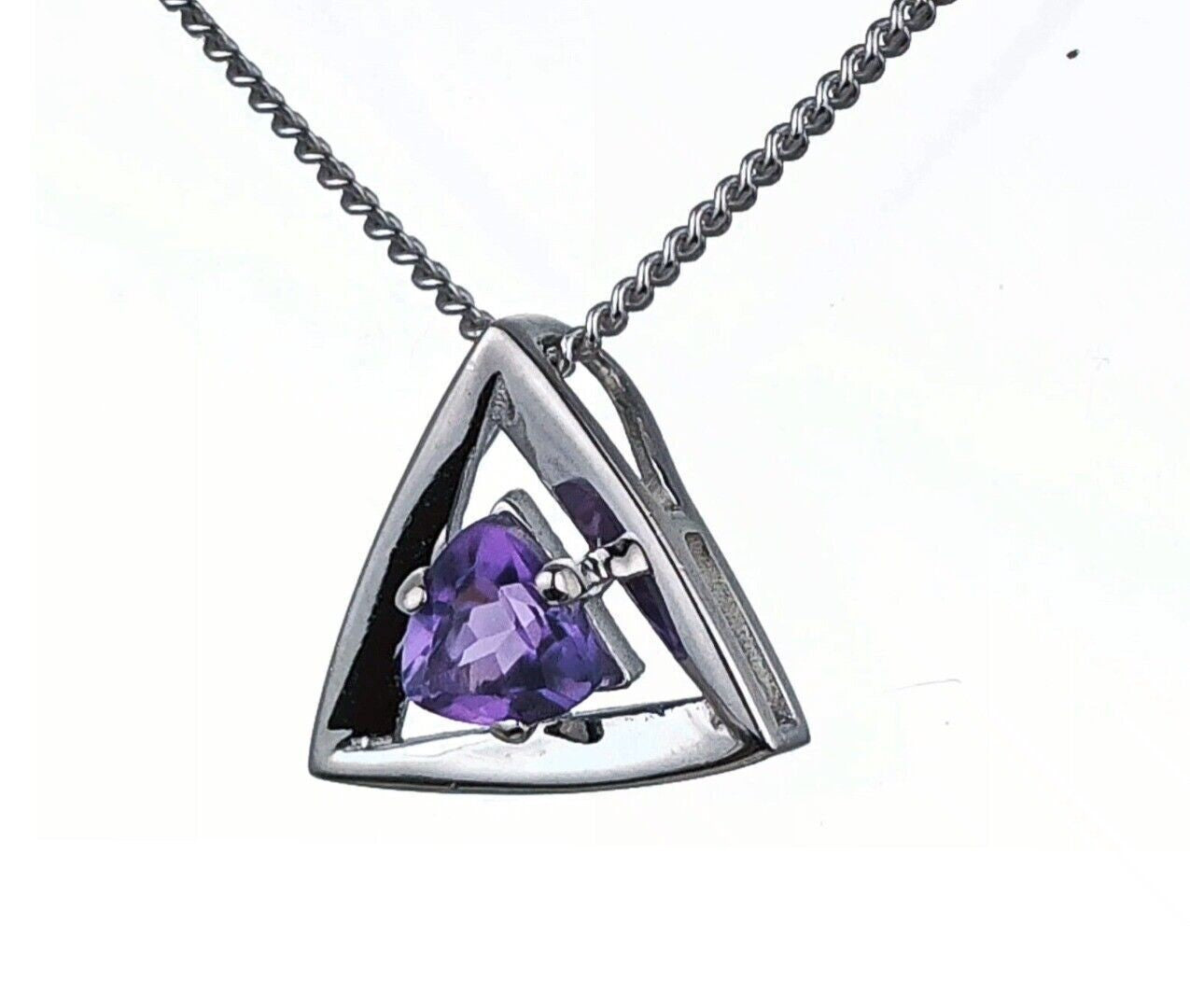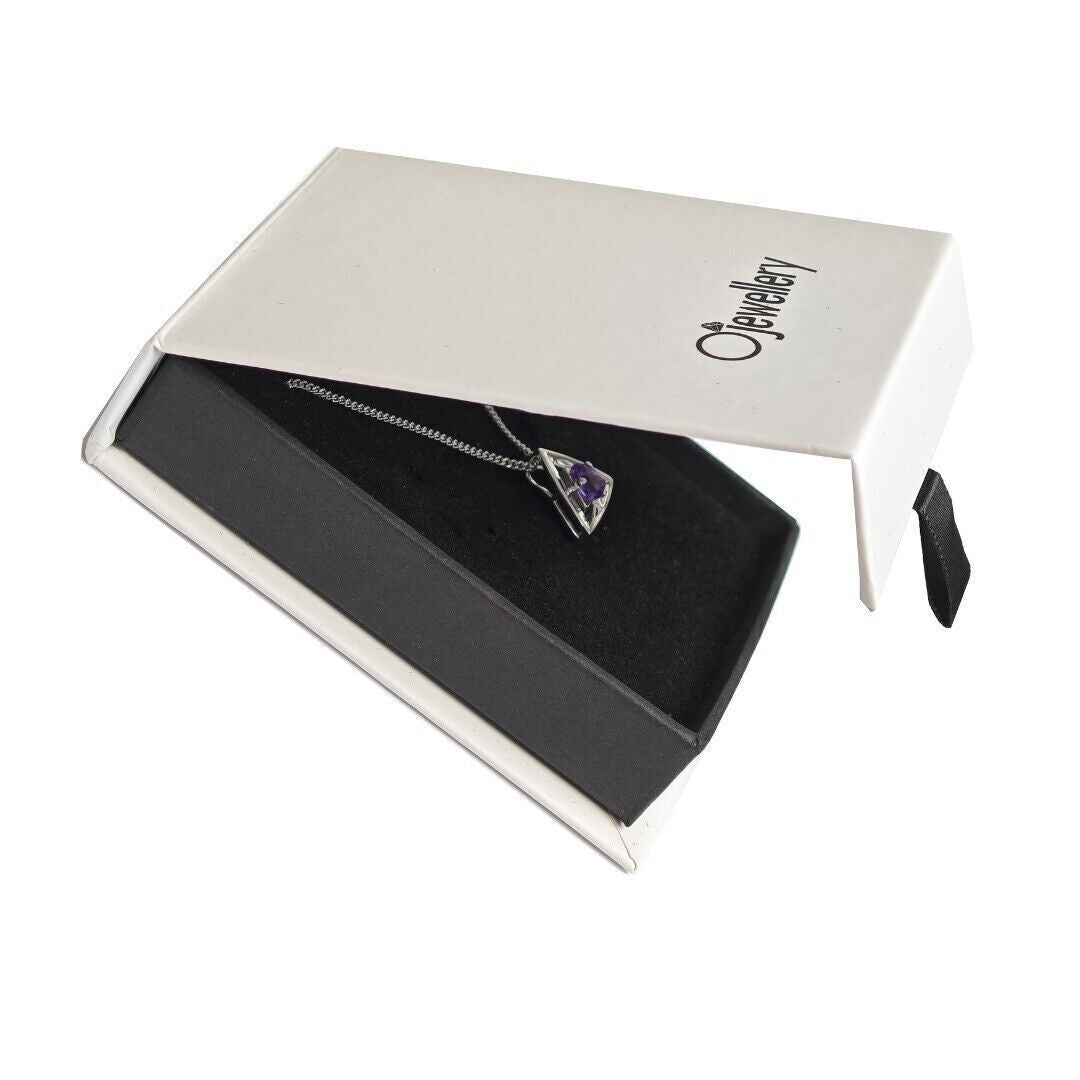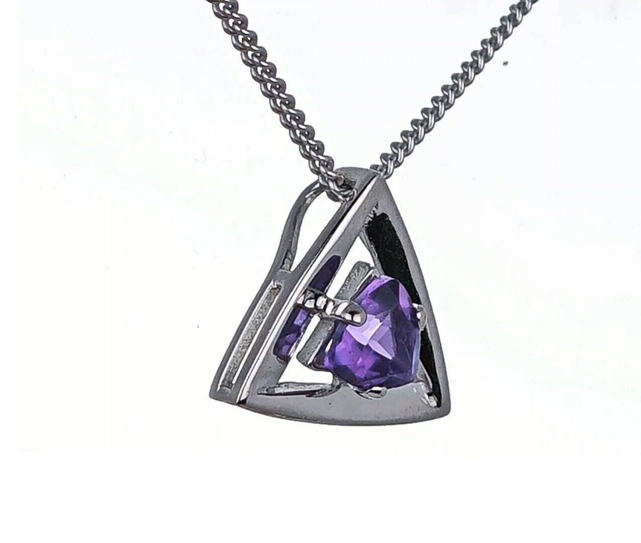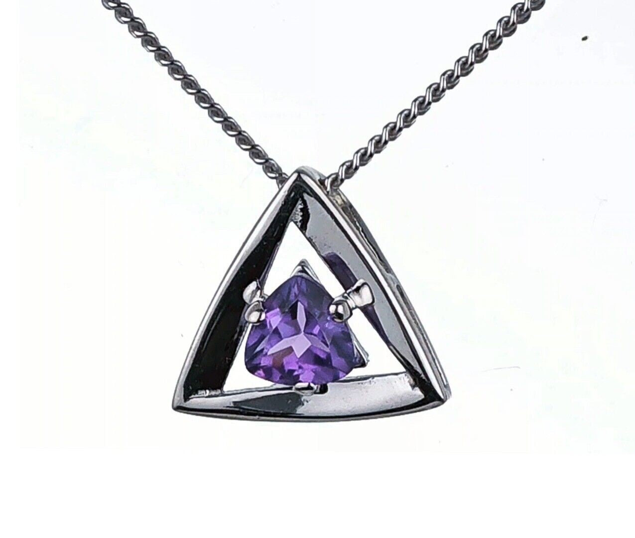 Trillion cut stone set in a triangle made of sterling silver. The stone measures 5 x 5mmAmethysts are associated with calm and wisdom. They are the birthstone for February.These elegant pendant suitable to wear for daytime or evening wear.Finished with a commercial grade rhodium plate to give a high quality shine finish.Supplied in an Ojewellery presentation box, within a ribbon handled gift bag, complete with product information authenticity card with space for a gift message and a jewellery cleaning cloth to keep your jewellery in ready to wear condition.Our jewellery packaging is from an FSC chain of custody audited supplier and our very short supply chains mean we are able to trace our natural gemstones back to country of origin.Specification:Chain Curb Link 18 inch with lobster clasp fasteningPendant Drop: 11.5mmPendant Width: 12.6mmWeight: 3.5gStones Natural African Purple Amethysts Trillion cut 5 x 5mm