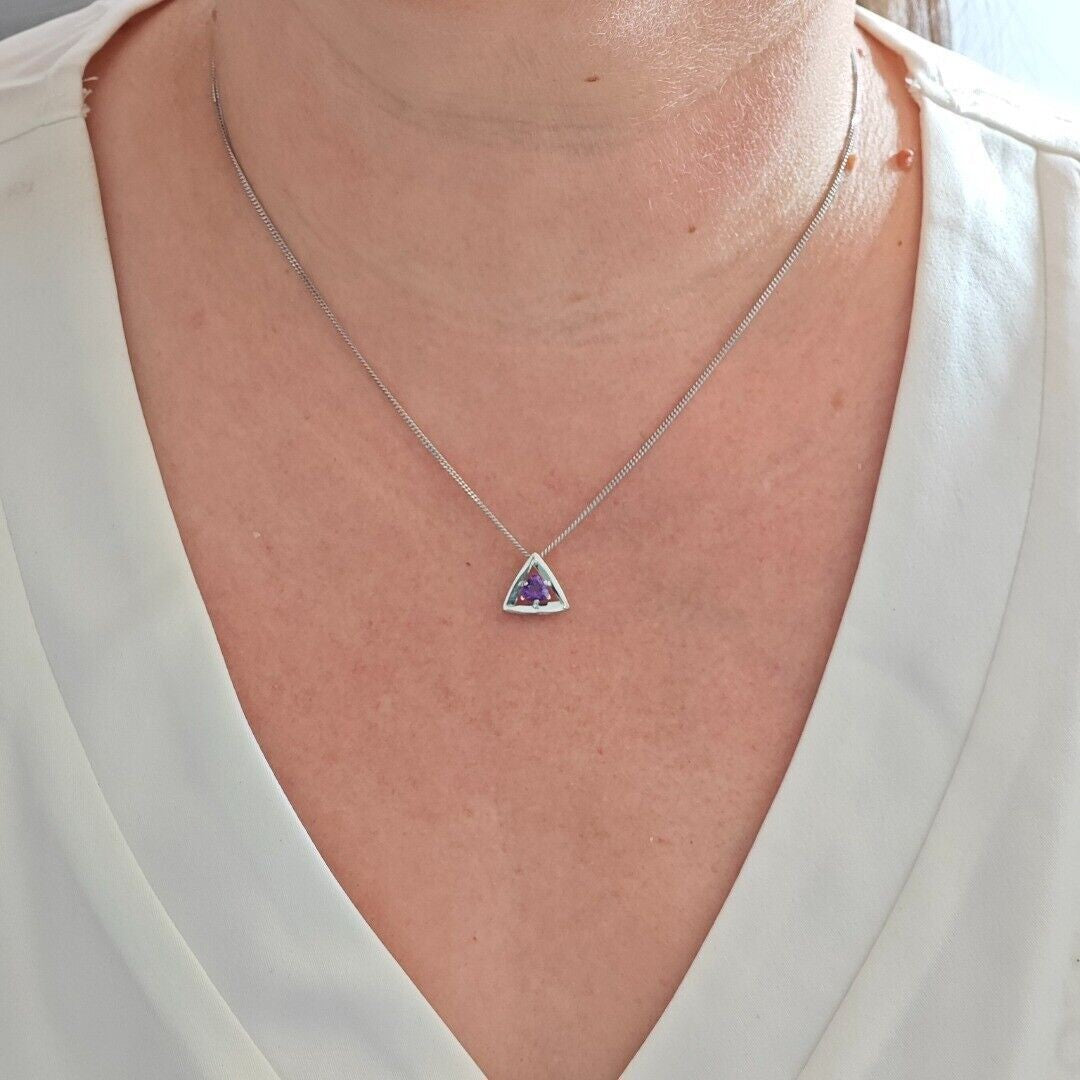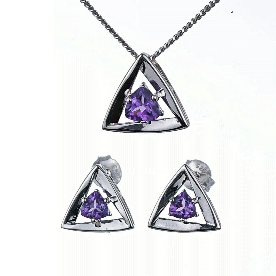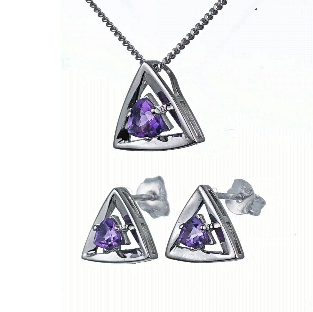 Trillion cut natural stones set in a triangle made of sterling silver. Each stud stone measures 4 x 4mm and the pendant stone is 5x5mmAmethysts are associated with calm and wisdom. They are the birthstone for February.This elagent set is suitable to wear for daytime or evening wear.Finished with a commercial grade rhodium plate to give a high quality shine finish.Supplied in an Ojewellery presentation box, within a ribbon handled gift bag, complete with product information authenticity card with space for a gift message and a jewellery cleaning cloth to keep your jewellery in ready to wear condition.Our jewellery packaging is from an FSC chain of custody audited supplier and our very short supply chains mean we are able to trace our natural gemstones back to country of origin.Specification:Fastening: ButterflyEarring Drop: 10.2mmEarring Width: 10.7mmWeight of pair:1.9gChain Curb Link 18 inch with lobster clasp fasteningPendant Drop: 11.5mmPendant Width: 12.6mmWeight: 3.5gStones Natural African Purple Amethysts trillion cut 2qty 4 x 4mm, 1 qty 5 x 5mm