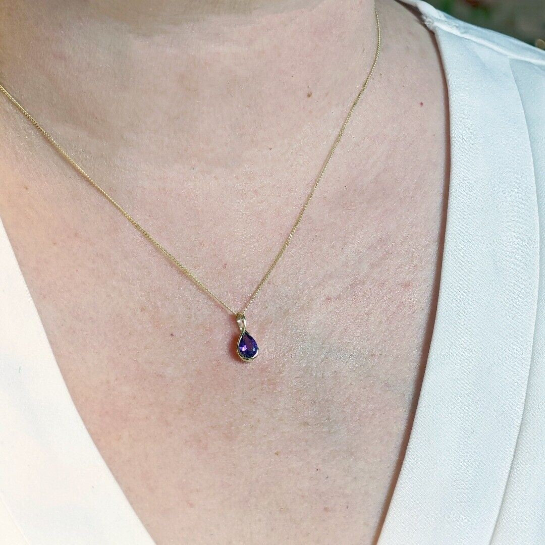These elegant African purple amethyst pear stud earrings are designed in the UK and feature natural African purple amethyst gemstones. The stones are set in raised settings made of 9ct yellow gold to allow light to the back of the stones and show off their natural sparkle.