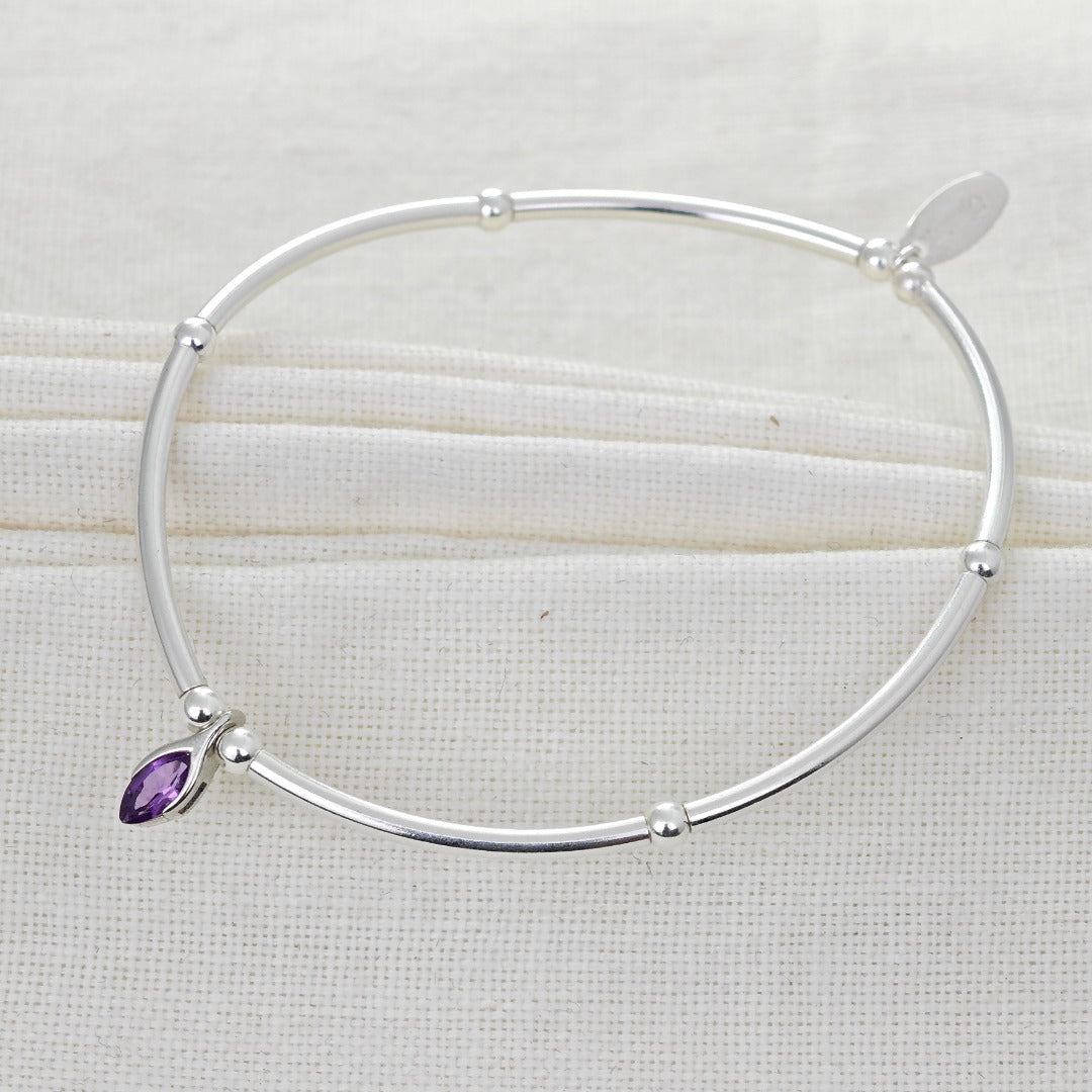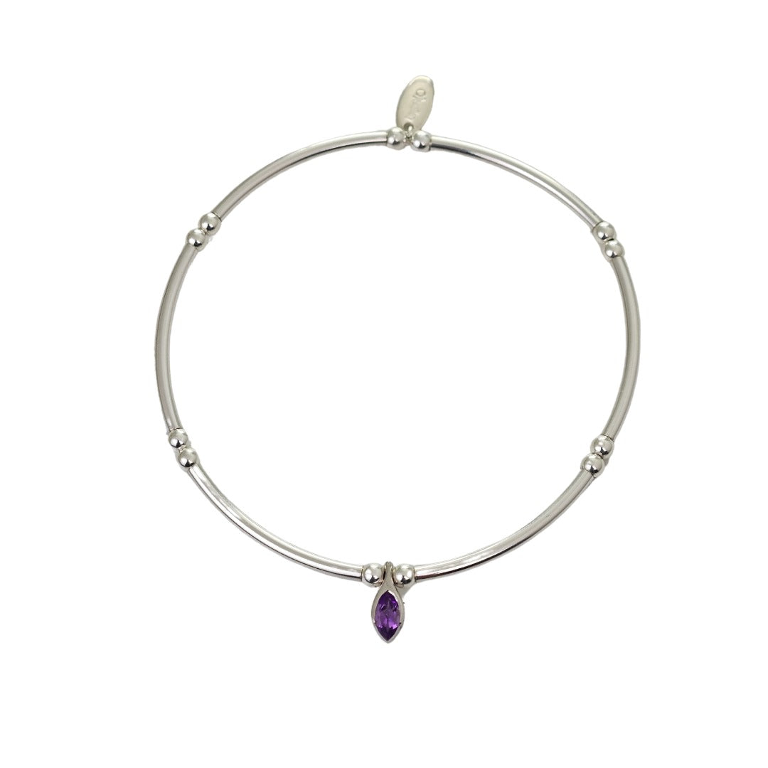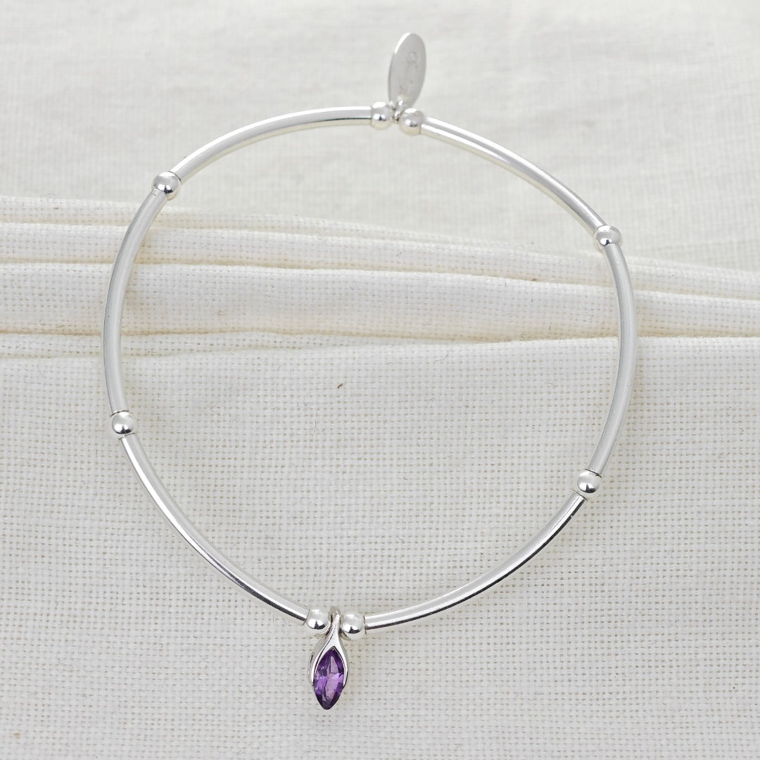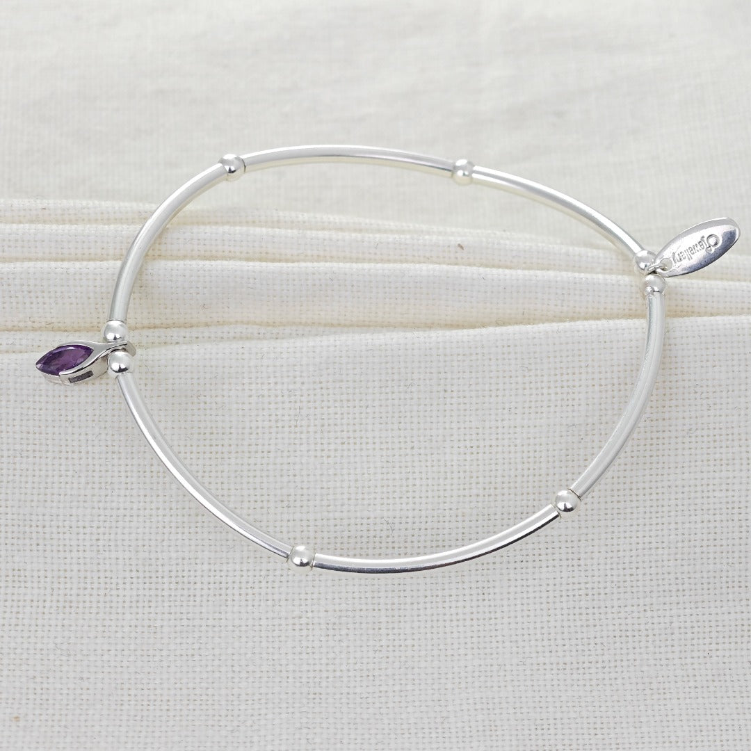 Indulge in a touch of serenity with this amethyst stretch bracelet. The marquise-cut gemstone, February's birthstone, whispers promises of inner peace and emotional balance. Nestled among cool sterling silver beads, it offers a subtle reminder to breathe, relax, and embrace mindful moments throughout your day.