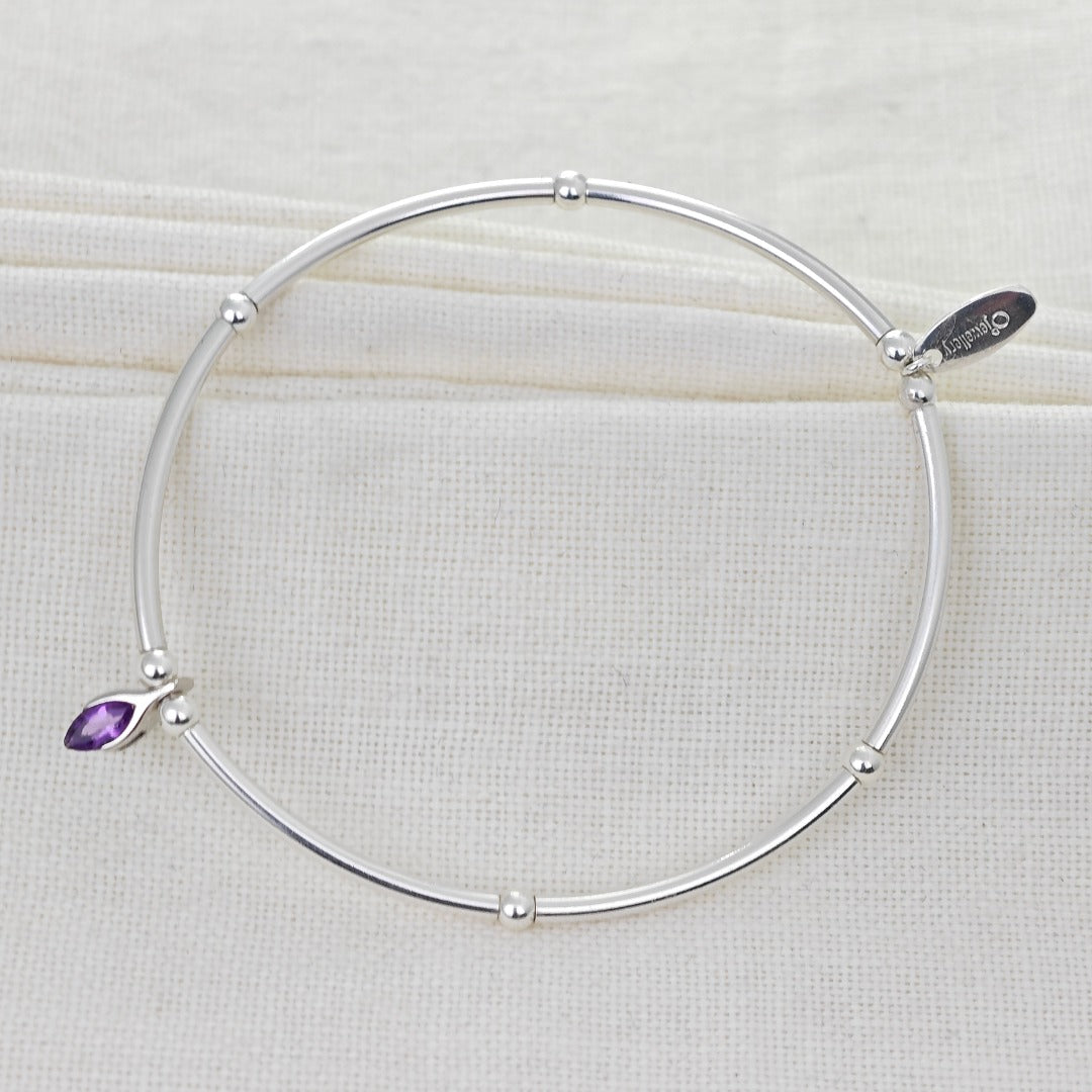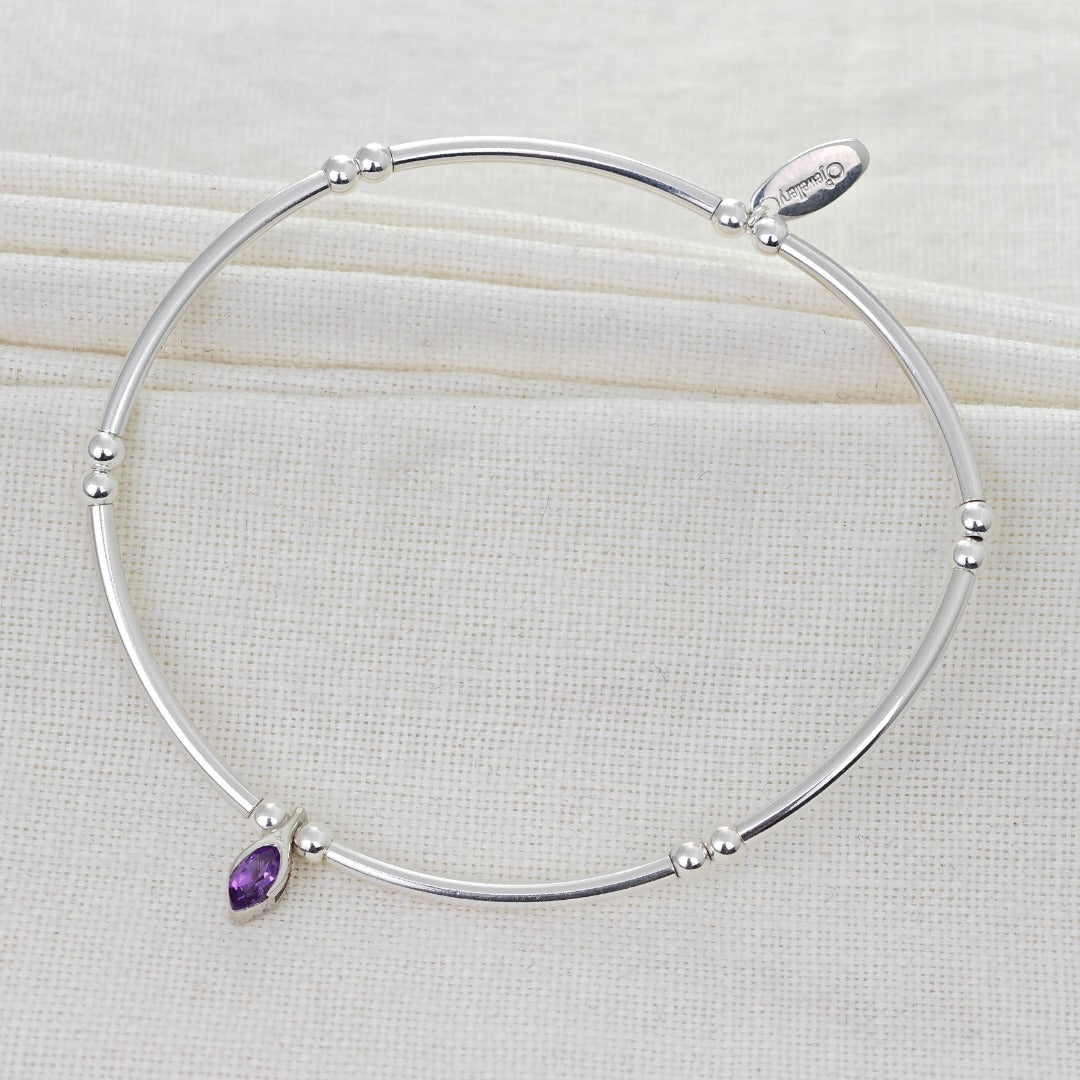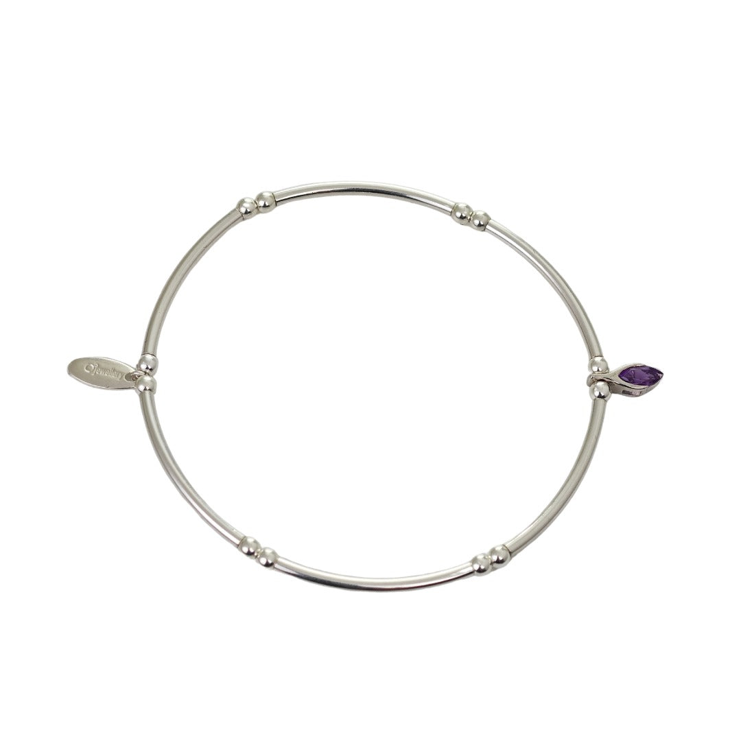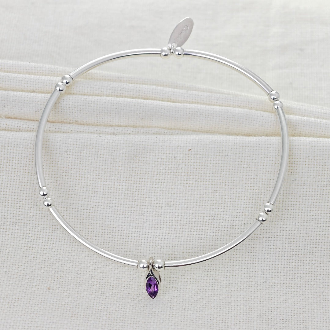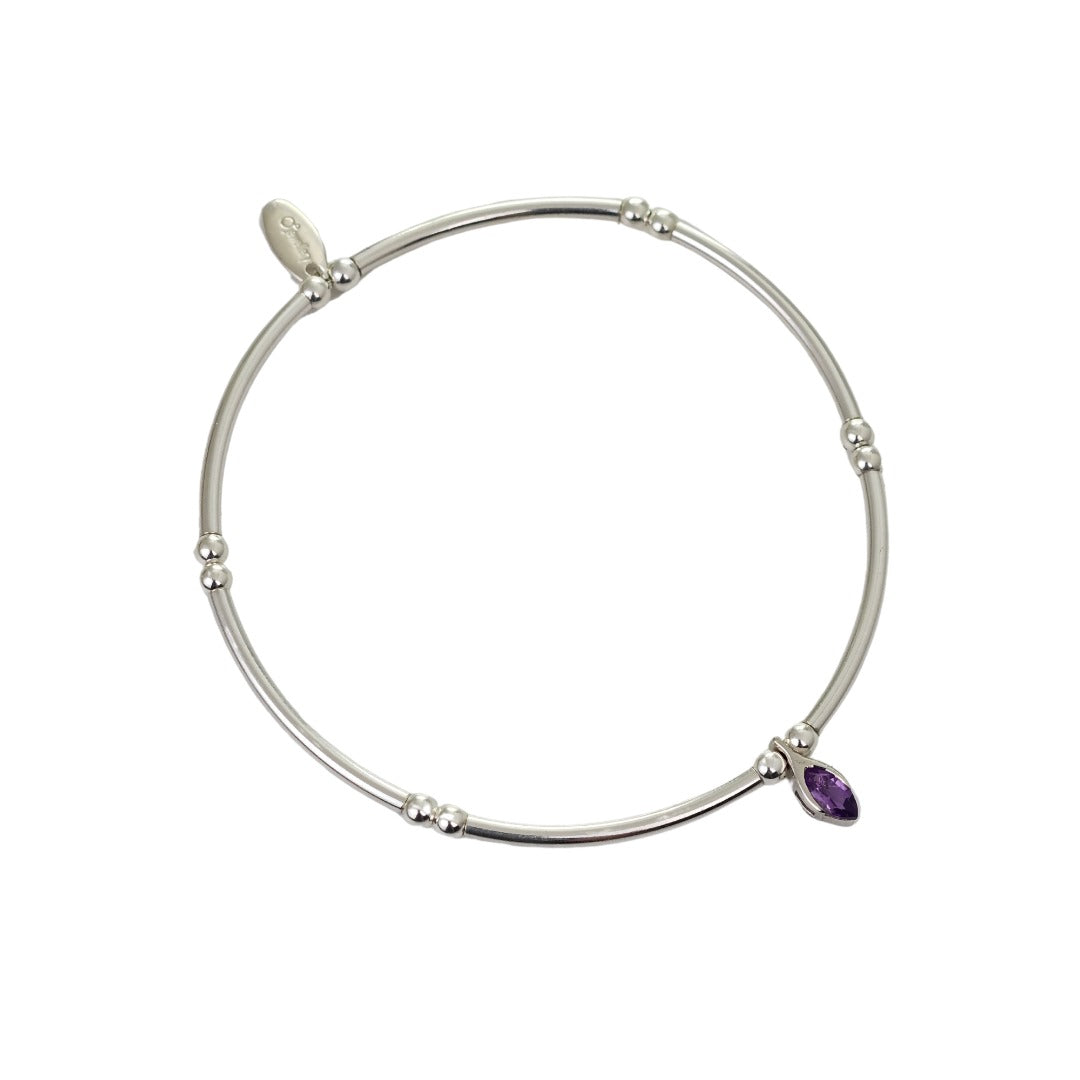 Indulge in a touch of serenity with this amethyst stretch bracelet. The marquise-cut gemstone, February's birthstone, whispers promises of inner peace and emotional balance. Nestled among cool sterling silver beads, it offers a subtle reminder to breathe, relax, and embrace mindful moments throughout your day.