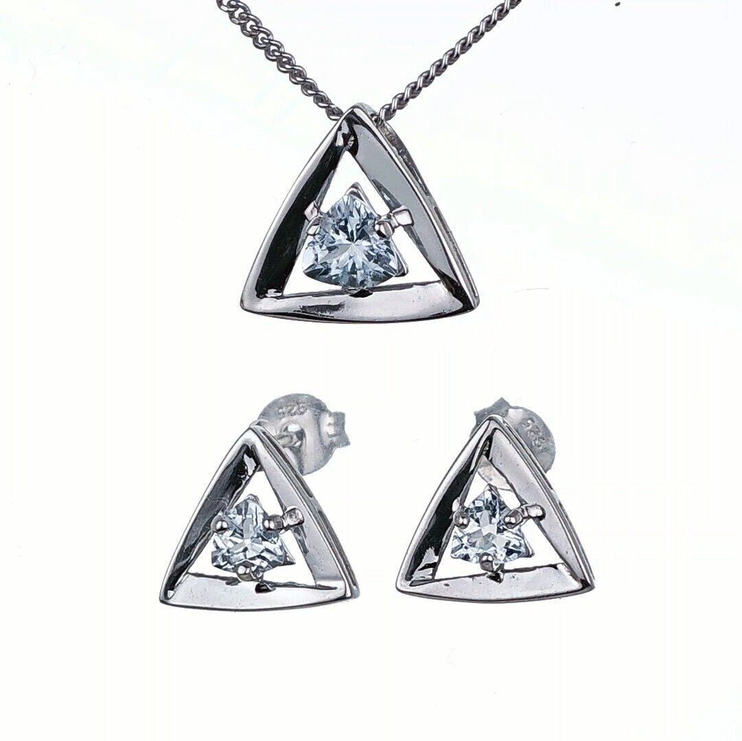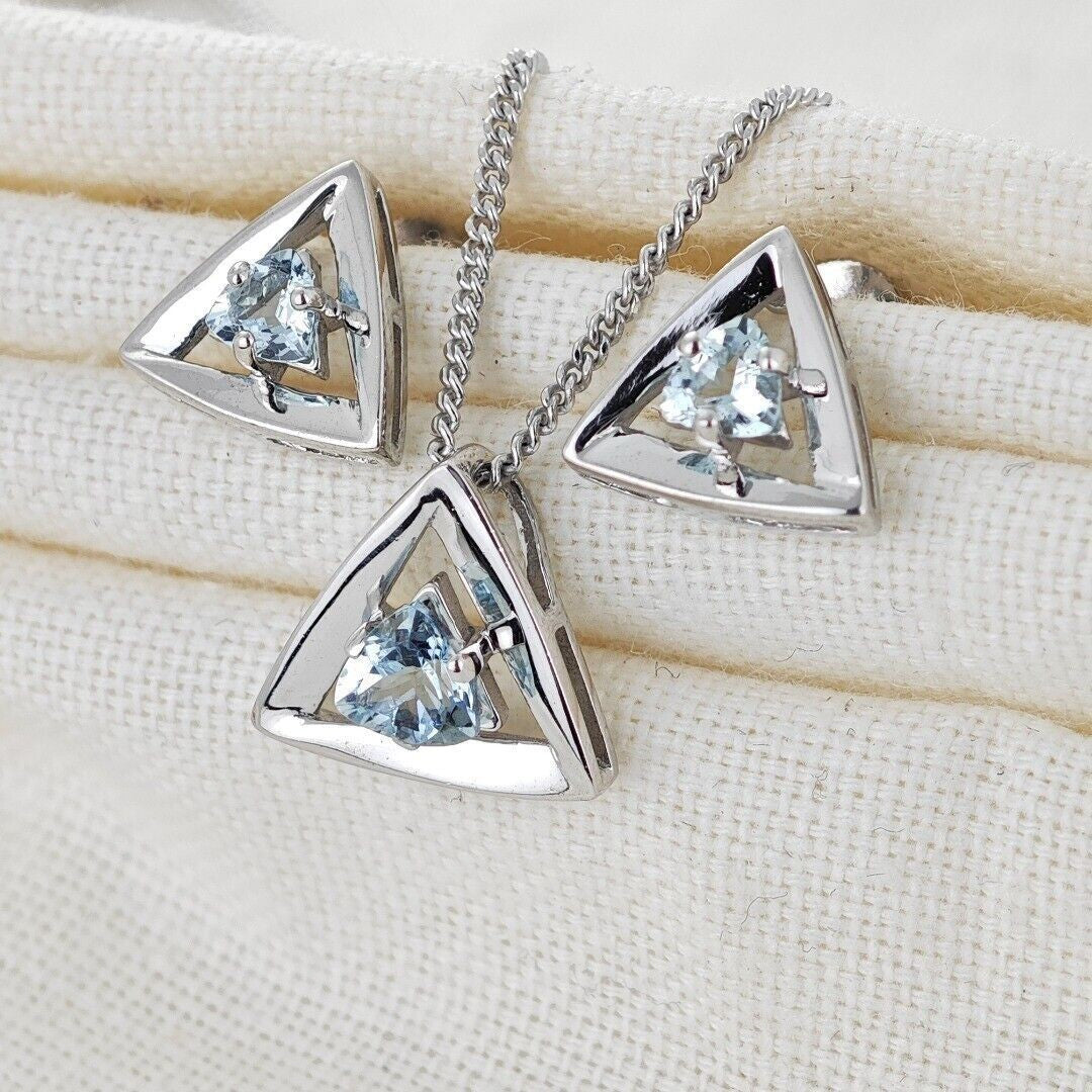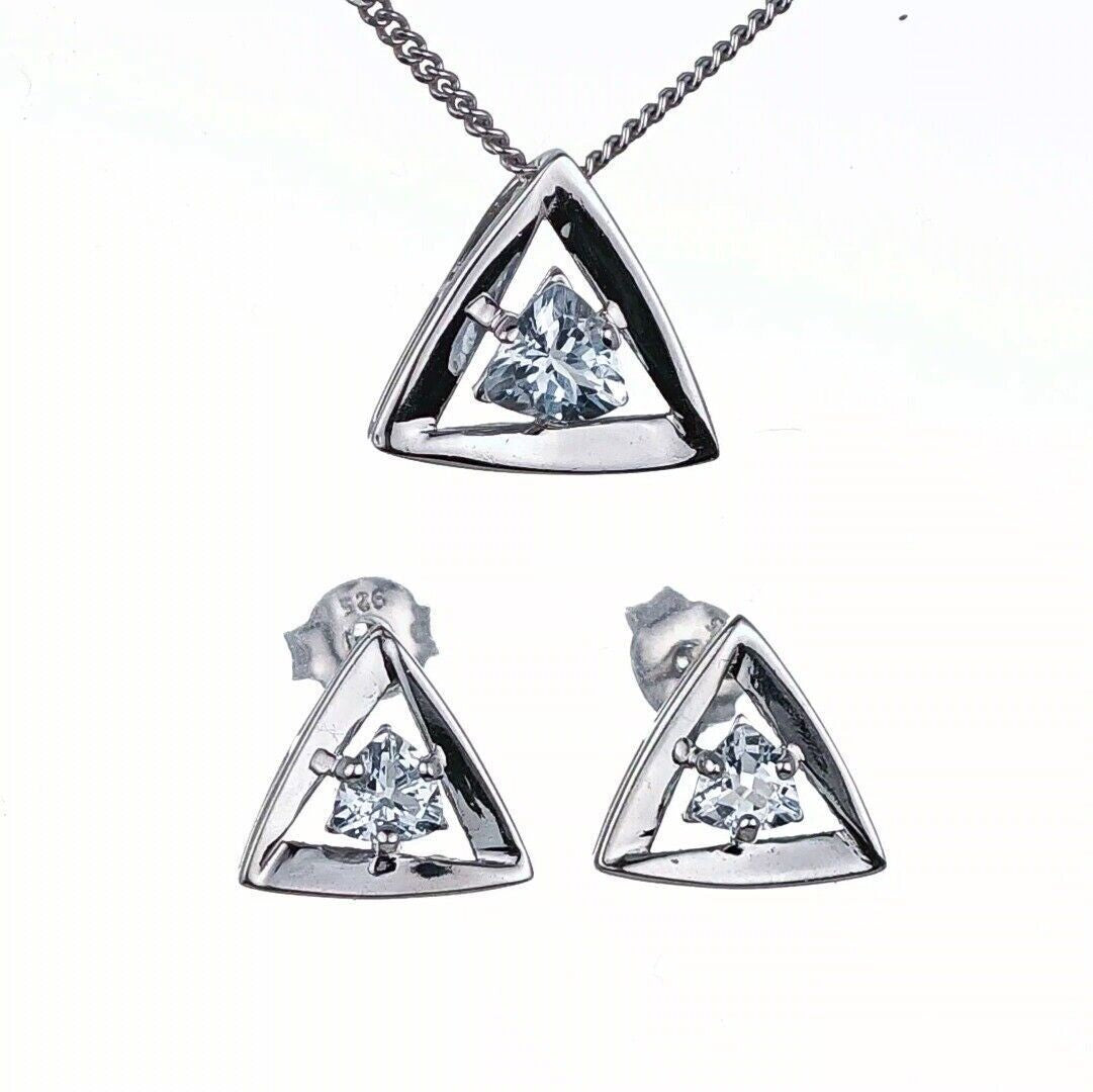 Trillion cut natural stones set in a triangle made of sterling silver. Each stud stone measures 4 x 4mm and the pendant stone is 5x5mm Aquamarine are associated with hope happiness and youthfulness. They are the birthstone for March. This elagent set is suitable to wear for daytime or evening wear. Finished with a commercial grade rhodium plate to give a high quality shine finish. Supplied in an Ojewellery presentation box, within a ribbon handled gift bag, complete with product information authenticity card with space for a gift message and a jewellery cleaning cloth to keep your jewellery in ready to wear condition. Our jewellery packaging is from an FSC chain of custody audited supplier and our very short supply chains mean we are able to trace our natural gemstones back to country of origin. Specification: Fastening: Butterfly Earring Drop: 10.2mm Earring Width: 10.7mm Weight of pair:1.9g Chain Curb Link 18 inch with lobster clasp fastening Pendant Drop: 11.5mm Pendant Width: 12.6mm Weight: 3.5g Stones Natural Mozambique Blue Aquamarine trillion cut 2qty 4 x 4mm, 1 qty 5 x 5mm