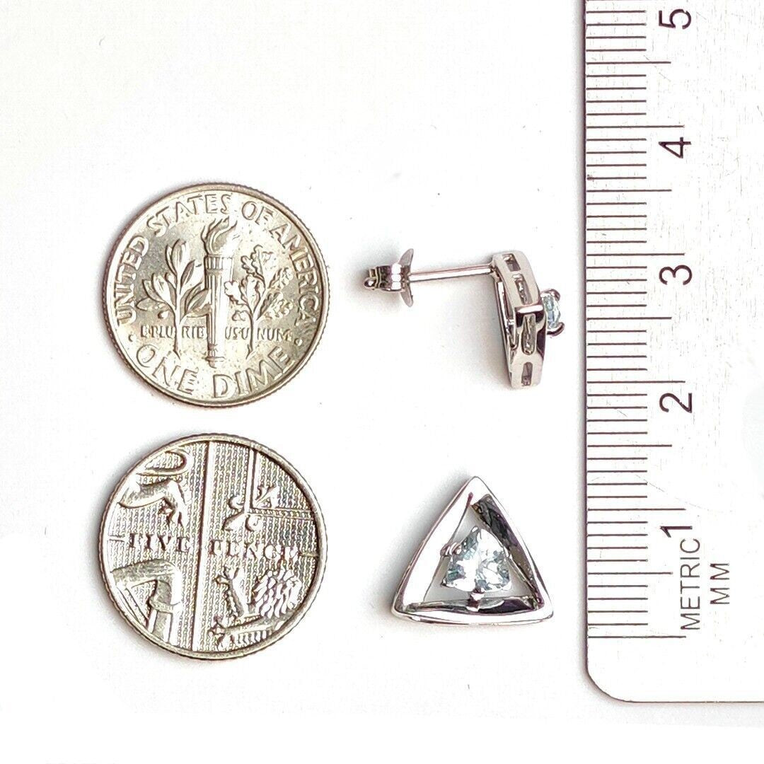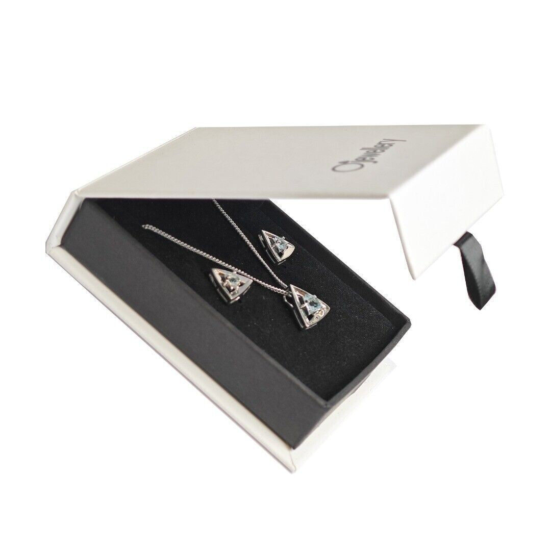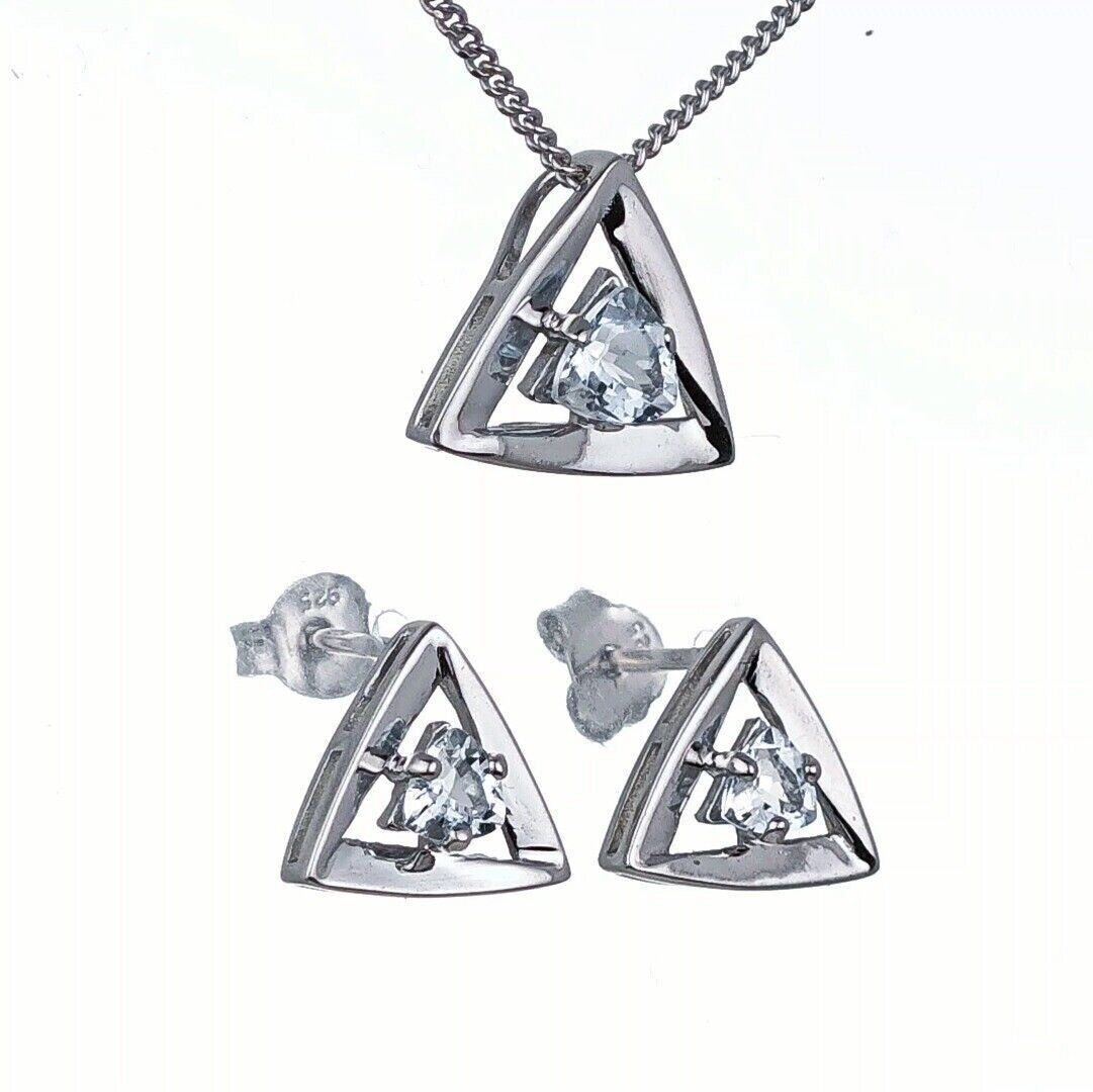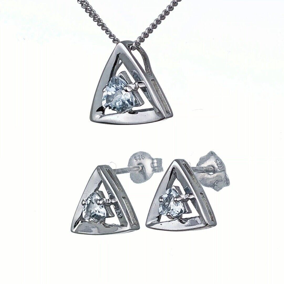 Trillion cut natural stones set in a triangle made of sterling silver. Each stud stone measures 4 x 4mm and the pendant stone is 5x5mm Aquamarine are associated with hope happiness and youthfulness. They are the birthstone for March. This elagent set is suitable to wear for daytime or evening wear. Finished with a commercial grade rhodium plate to give a high quality shine finish. Supplied in an Ojewellery presentation box, within a ribbon handled gift bag, complete with product information authenticity card with space for a gift message and a jewellery cleaning cloth to keep your jewellery in ready to wear condition. Our jewellery packaging is from an FSC chain of custody audited supplier and our very short supply chains mean we are able to trace our natural gemstones back to country of origin. Specification: Fastening: Butterfly Earring Drop: 10.2mm Earring Width: 10.7mm Weight of pair:1.9g Chain Curb Link 18 inch with lobster clasp fastening Pendant Drop: 11.5mm Pendant Width: 12.6mm Weight: 3.5g Stones Natural Mozambique Blue Aquamarine trillion cut 2qty 4 x 4mm, 1 qty 5 x 5mm