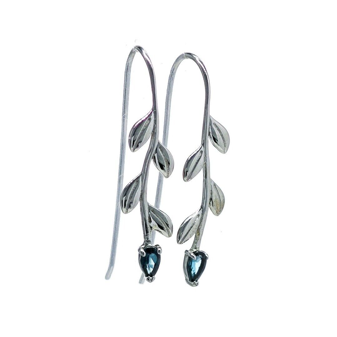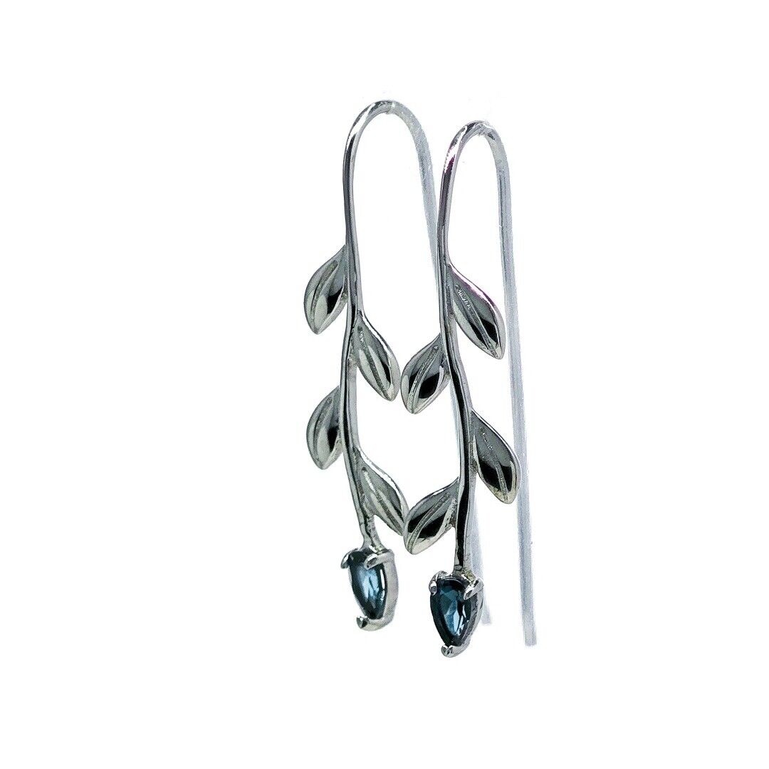 The delicate leaf motif, a universal symbol of growth and renewal, takes center stage on these elegant dangle earrings. Each leaf is adorned with a captivating London Blue Topaz gemstone at its heart. London Blue Topaz is known for its calming energy and association with peace, adding a touch of sophisticated beauty and symbolic meaning to the design.