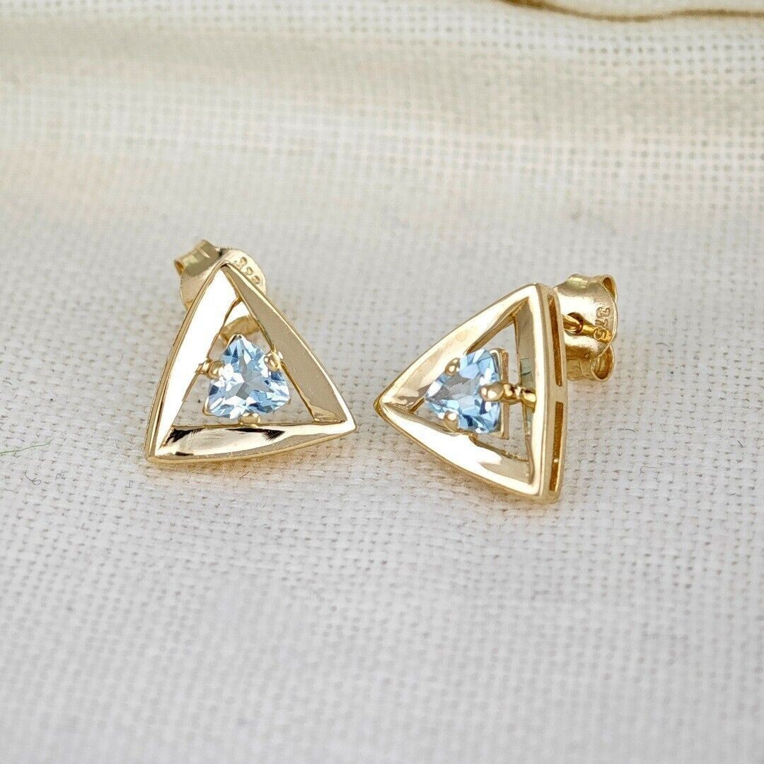Elegant pale blue topaz earrings. Trillion cut topaz set in a triangle made of yellow gold. The pale blue topaz are from Africa. Each stone measures 4 x 4mm