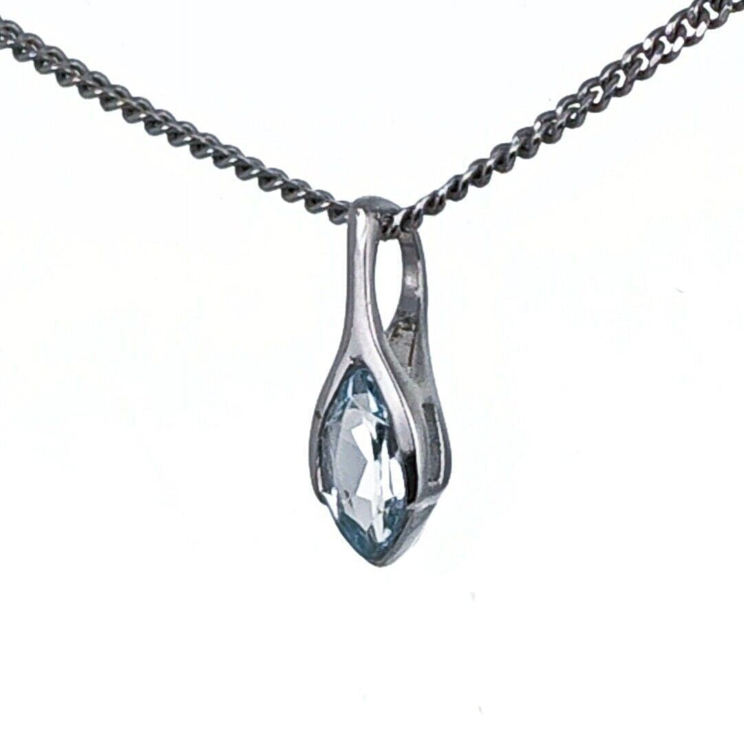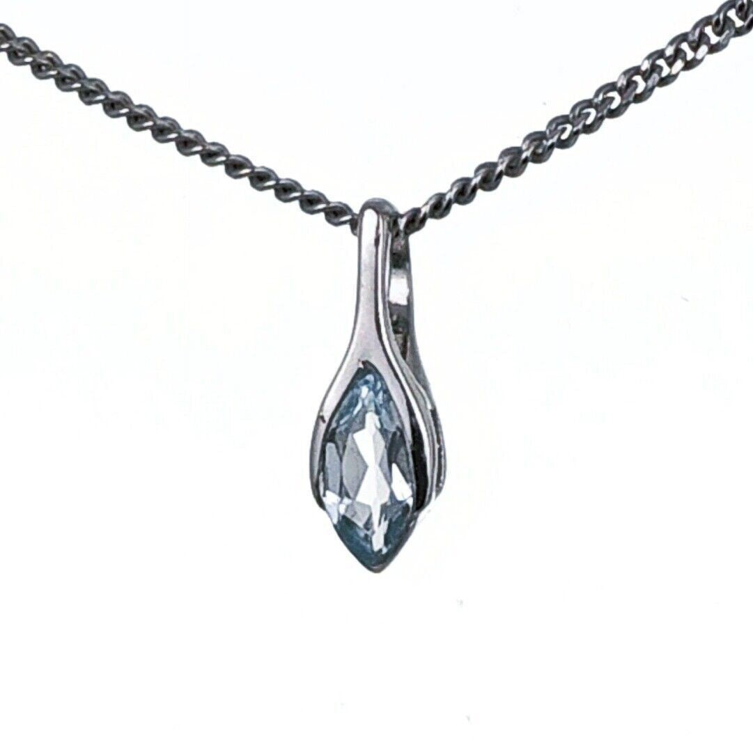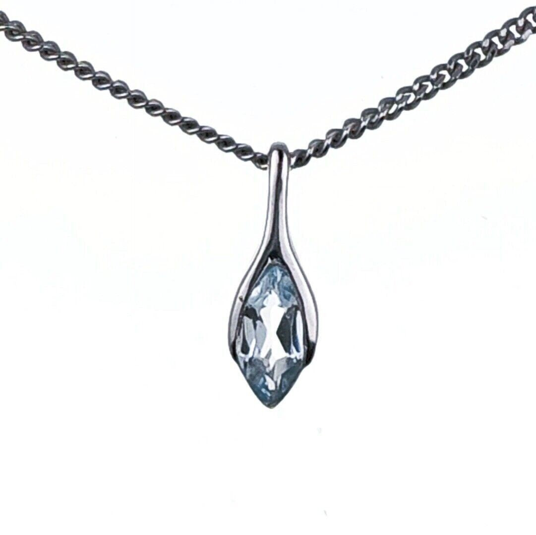 Elegant pendant minimalist solitaire, set in a raised partial rubover setting made of sterling silver to allow light to the back of the stone and show off its natural sparkle. The stone measures 6x3 mm. Topaz are associated with love self esteem and good fortune. They are the birthstone for December. This elegant pendant is suitable to wear for daytime or evening wear. Finished with a commercial grade rhodium plate to give a high quality shine finish. Supplied in an Ojewellery presentation box, within a ribbon handled gift bag, complete with product information authenticity card with space for a gift message and a jewellery cleaning cloth to keep your jewellery in ready to wear condition. Our jewellery packaging is from an FSC chain of custody audited supplier and our very short supply chains mean we are able to trace our natural gemstones back to country of origin. Specification: Fastening: Lobster clasp Chain: 18inch curb link Pendant Drop: 11.8mm Pendant Width: 4mm Weight:2.8g Stones Natural African Pale Blue Topaz Marquise cut 6 x 3 mm