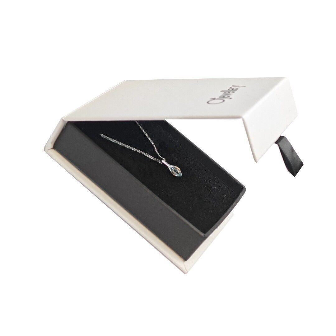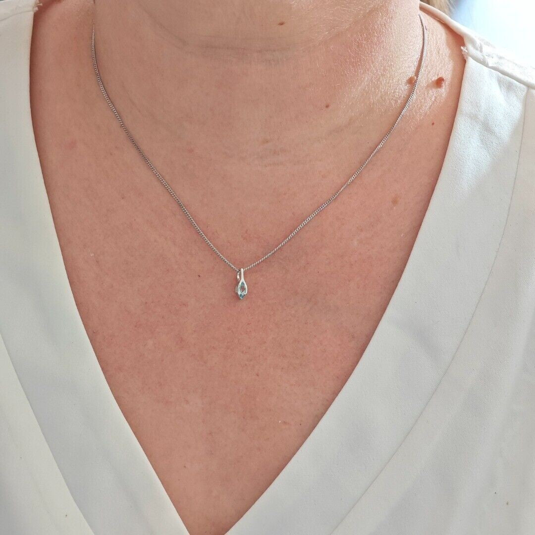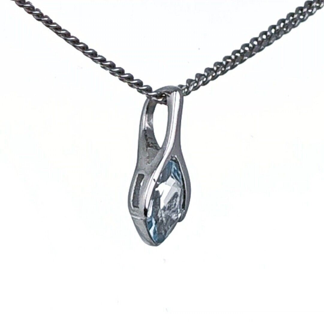 Elegant pendant minimalist solitaire, set in a raised partial rubover setting made of sterling silver to allow light to the back of the stone and show off its natural sparkle. The stone measures 6x3 mm. Topaz are associated with love self esteem and good fortune. They are the birthstone for December. This elegant pendant is suitable to wear for daytime or evening wear. Finished with a commercial grade rhodium plate to give a high quality shine finish. Supplied in an Ojewellery presentation box, within a ribbon handled gift bag, complete with product information authenticity card with space for a gift message and a jewellery cleaning cloth to keep your jewellery in ready to wear condition. Our jewellery packaging is from an FSC chain of custody audited supplier and our very short supply chains mean we are able to trace our natural gemstones back to country of origin. Specification: Fastening: Lobster clasp Chain: 18inch curb link Pendant Drop: 11.8mm Pendant Width: 4mm Weight:2.8g Stones Natural African Pale Blue Topaz Marquise cut 6 x 3 mm