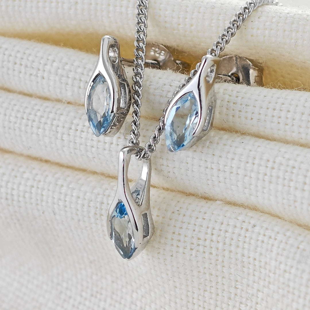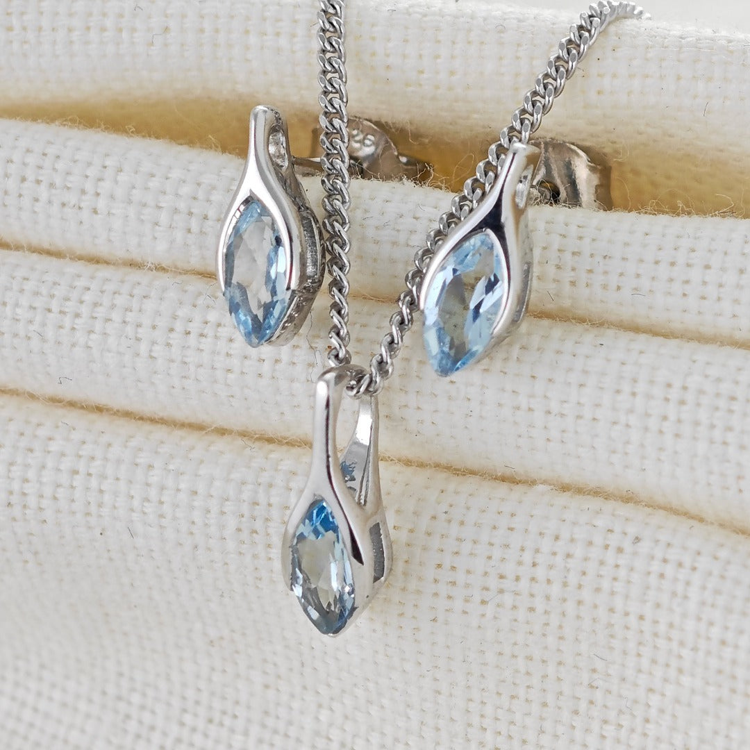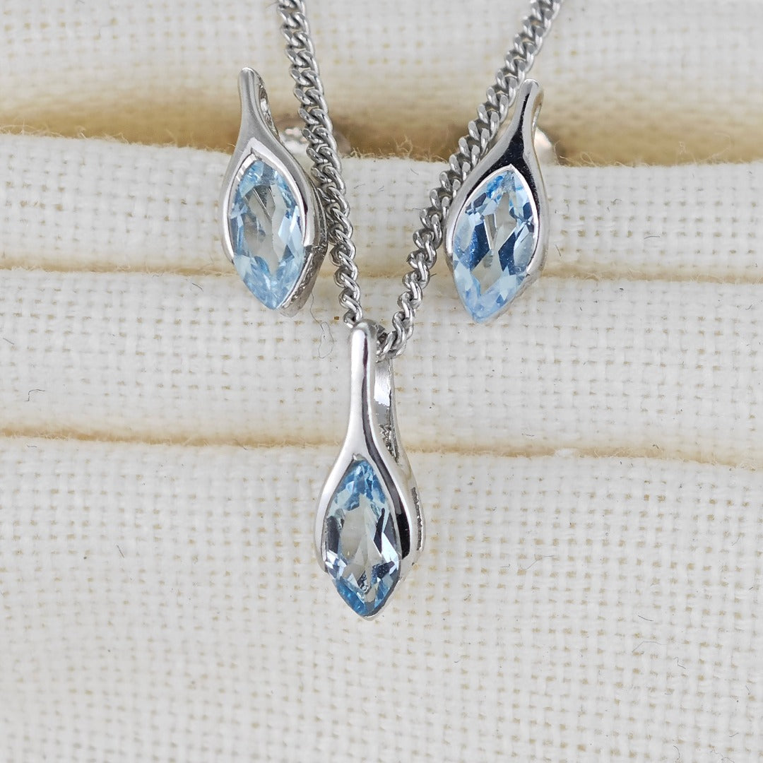 Elegant minimalist marquise cut stud earrings and matching pendant. Set in a raised partial rub over setting made of sterling silver to allow light to the back of the stone and show off its natural sparkle. The stones measure 6x3 mm in each stud.Topaz are associated with love self esteem and good fortune. They are the birthstone for December.This elegant set is suitable to wear for daytime or evening wear.Finished with a commercial grade rhodium plate to give a high quality shine finish.Supplied in an Ojewellery presentation box, within a ribbon handled gift bag, complete with product information authenticity card with space for a gift message and a jewellery cleaning cloth to keep your jewellery in ready to wear condition.Our jewellery packaging is from an FSC chain of custody audited supplier and our very short supply chains mean we are able to trace our natural gemstones back to country of origin.Specification:Fastening: ButterflyEarring Drop: 9.8mmEarring Width: 4mmWeight of pair:1.1gFastening: Lobster claspChain: 18inch curb linkPendant Drop: 11.8mmPendant Width: 4mmWeight:2.8gStones Natural African Pale Blue Topaz 3 qty Marquise cut 6 x 3 mm