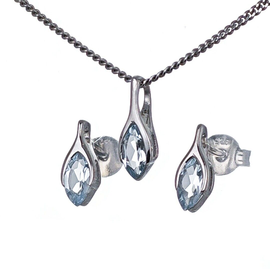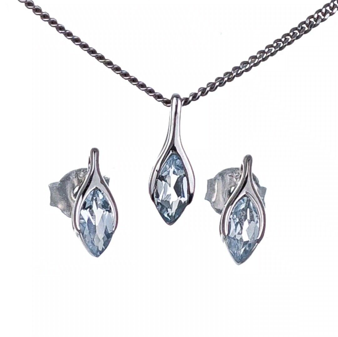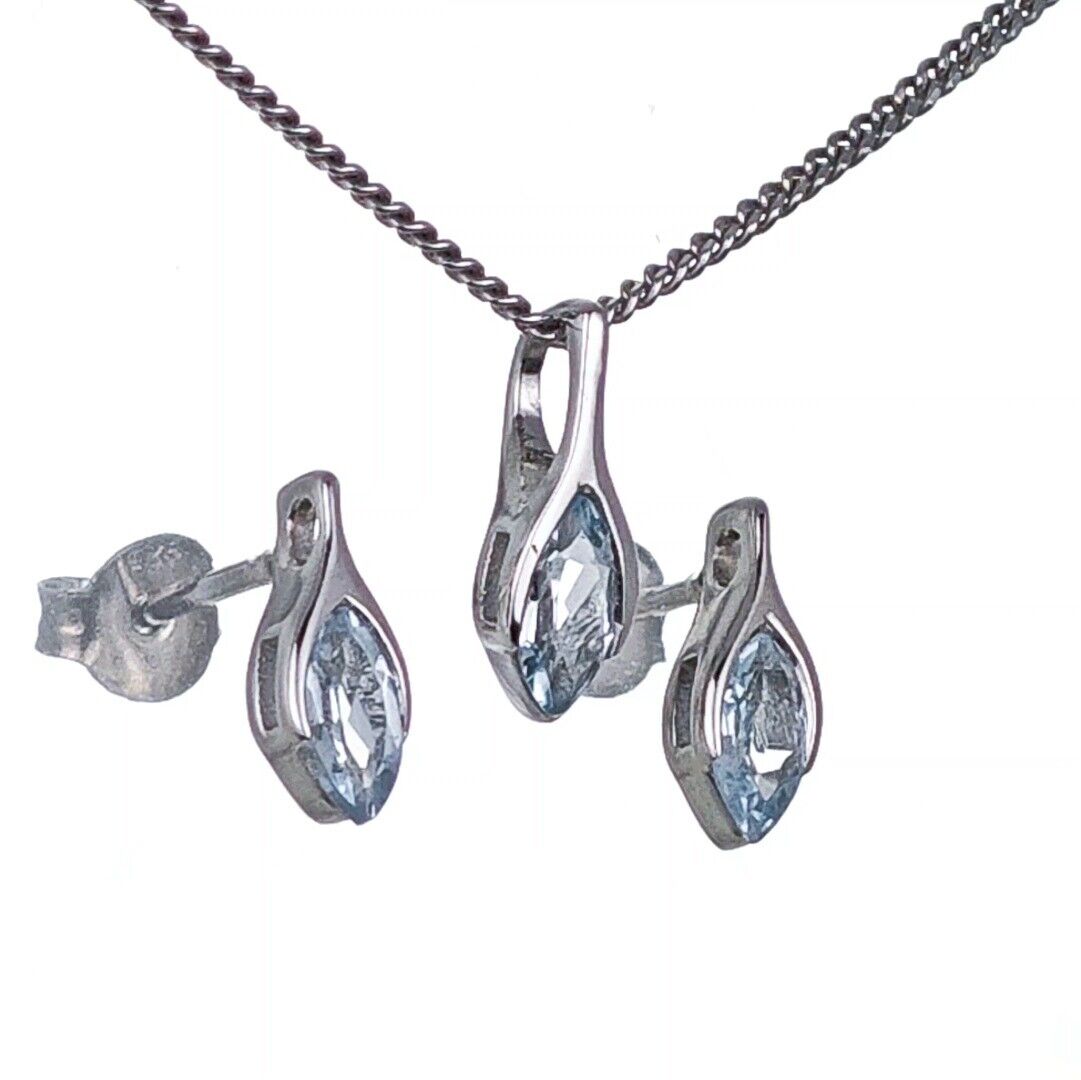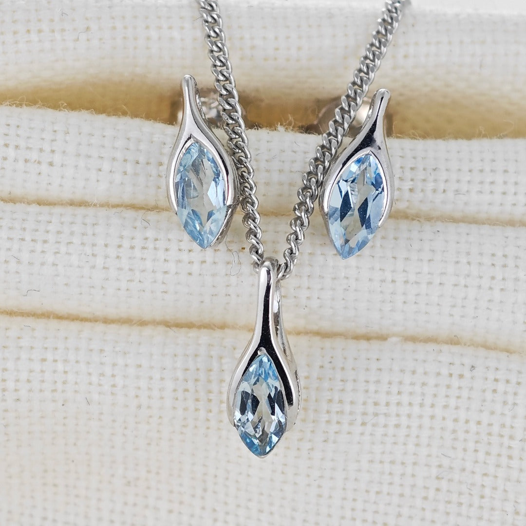 Elegant minimalist marquise cut stud earrings and matching pendant. Set in a raised partial rub over setting made of sterling silver to allow light to the back of the stone and show off its natural sparkle. The stones measure 6x3 mm in each stud.Topaz are associated with love self esteem and good fortune. They are the birthstone for December.This elegant set is suitable to wear for daytime or evening wear.Finished with a commercial grade rhodium plate to give a high quality shine finish.Supplied in an Ojewellery presentation box, within a ribbon handled gift bag, complete with product information authenticity card with space for a gift message and a jewellery cleaning cloth to keep your jewellery in ready to wear condition.Our jewellery packaging is from an FSC chain of custody audited supplier and our very short supply chains mean we are able to trace our natural gemstones back to country of origin.Specification:Fastening: ButterflyEarring Drop: 9.8mmEarring Width: 4mmWeight of pair:1.1gFastening: Lobster claspChain: 18inch curb linkPendant Drop: 11.8mmPendant Width: 4mmWeight:2.8gStones Natural African Pale Blue Topaz 3 qty Marquise cut 6 x 3 mm